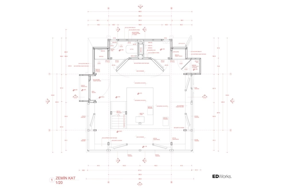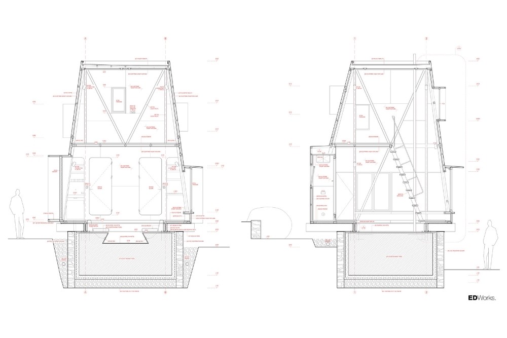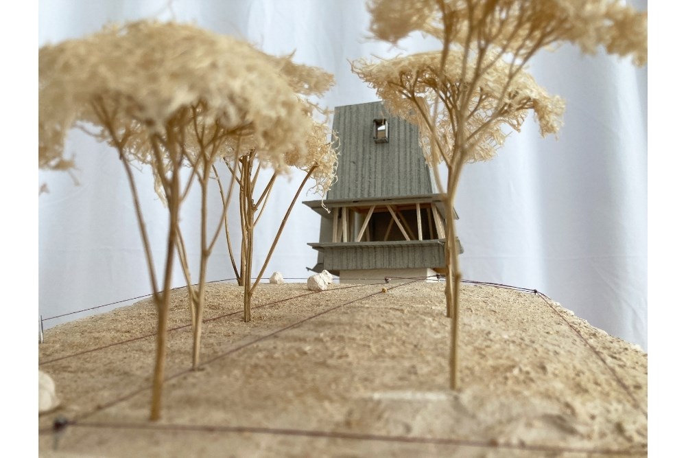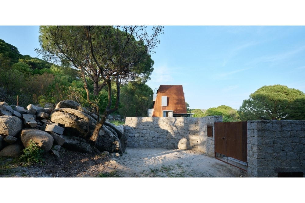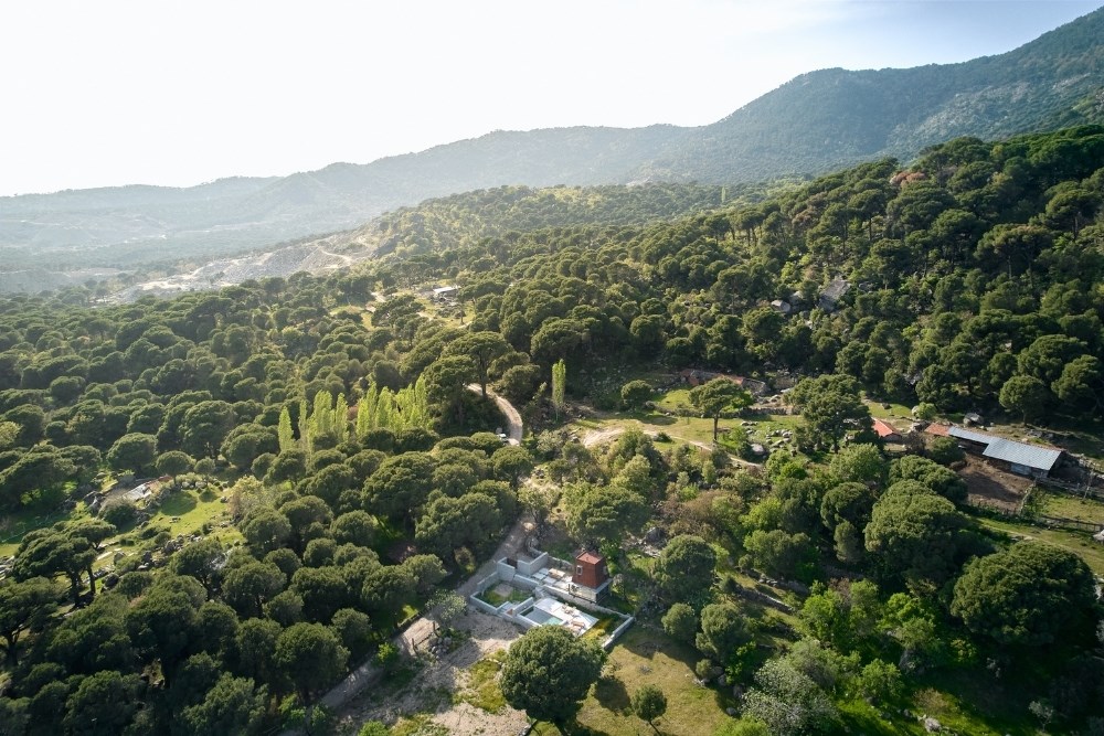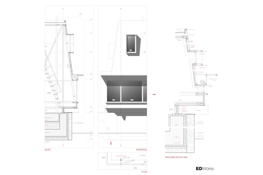 Temel için güçlendirilen set duvarı, bilinçli olarak arazideki taşların mevcut, gelişigüzel ve düzensiz örgüsüyle tamamlanmış; içerisine yerinde dökme (in-situ) betonarme temel dökülmüştür. Topoğrafyadan koparılmış, havada asılı duran çelik iskelet sistemi ve korten metal cephe plakaları ise prefabrik olarak atölyede üretilmiş, arazide yalnızca kurulumu gerçekleştirilmiştir.