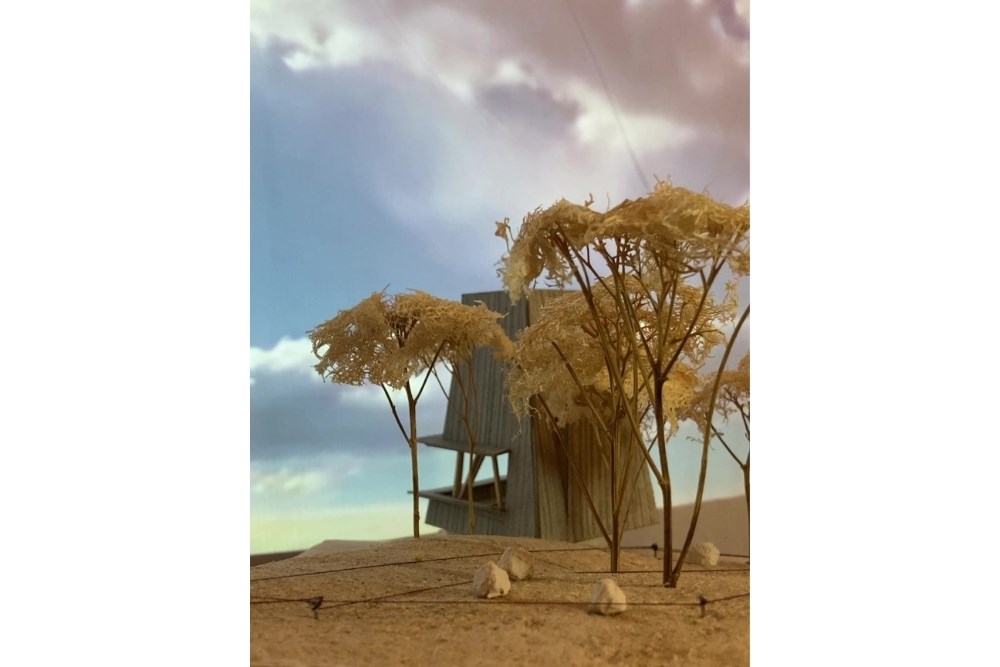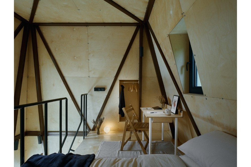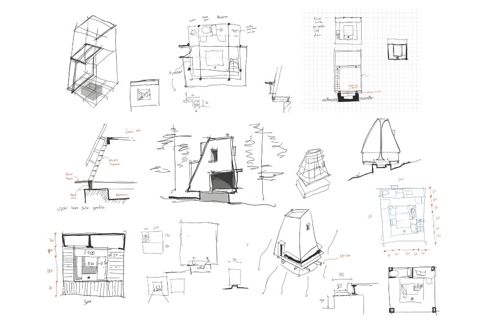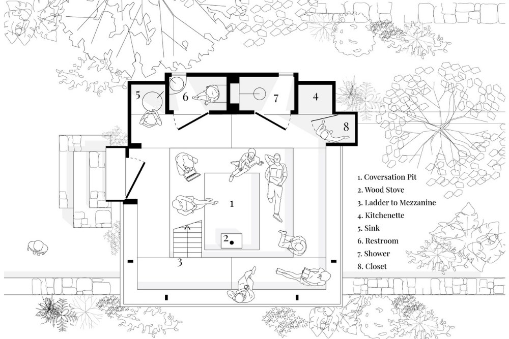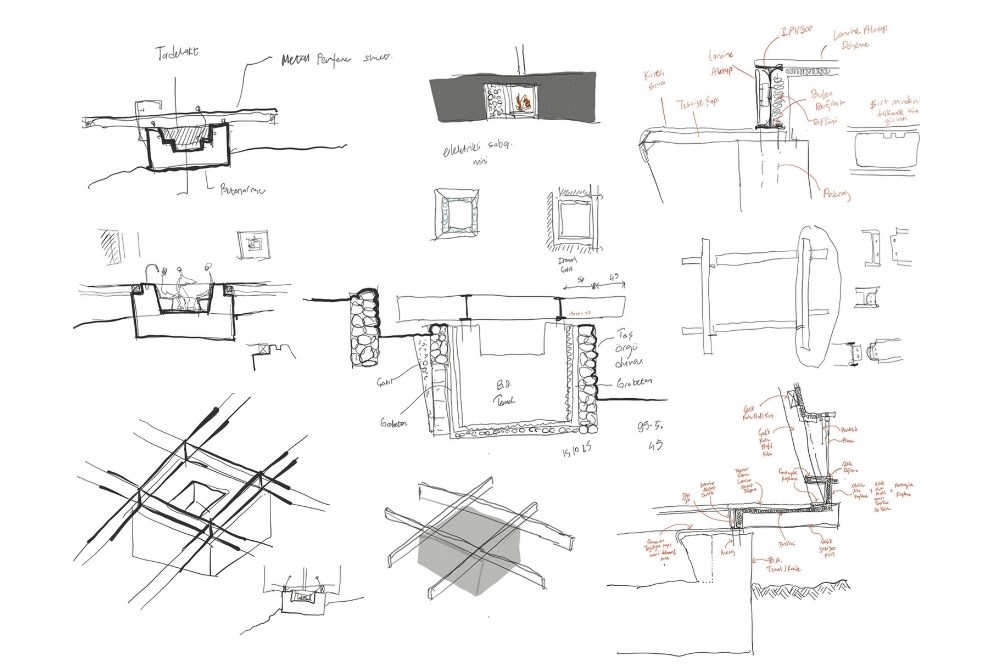 Yapı, topoğrafyaya oturan temelinin merkezindeki bir çukur ve onu saran metal bir kabuktan ibarettir. Bu çukur, insanları bir araya gelerek ateşin çevresinde ısınmaya, sohbet etmeye ve mekânı farklı açılardan deneyimlemeye davet eder. Islak hacimler ve diğer fonksiyonlar, bu merkezi yapıya eklenmiş birer eklenti gibidir. Kabuk içinde oluşturulmuş bir asma kat ise yatma ve çalışma alanlarını tanımlar.