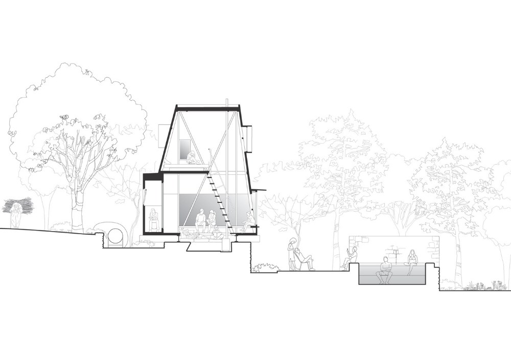 Doğal dokunun bir devamı olan temel ve çukur, kullanıcıların topoğrafyayla temas kurmasını sağlayarak yapının bulunduğu yere ait olma eğilimi gösterirken; bu çukurun üzerini örten, çadır niteliğindeki çelik kabuk ise biçimi ve malzemesiyle çevreden ayrıksı ve yabancı olma karakteristiğini vurgular.