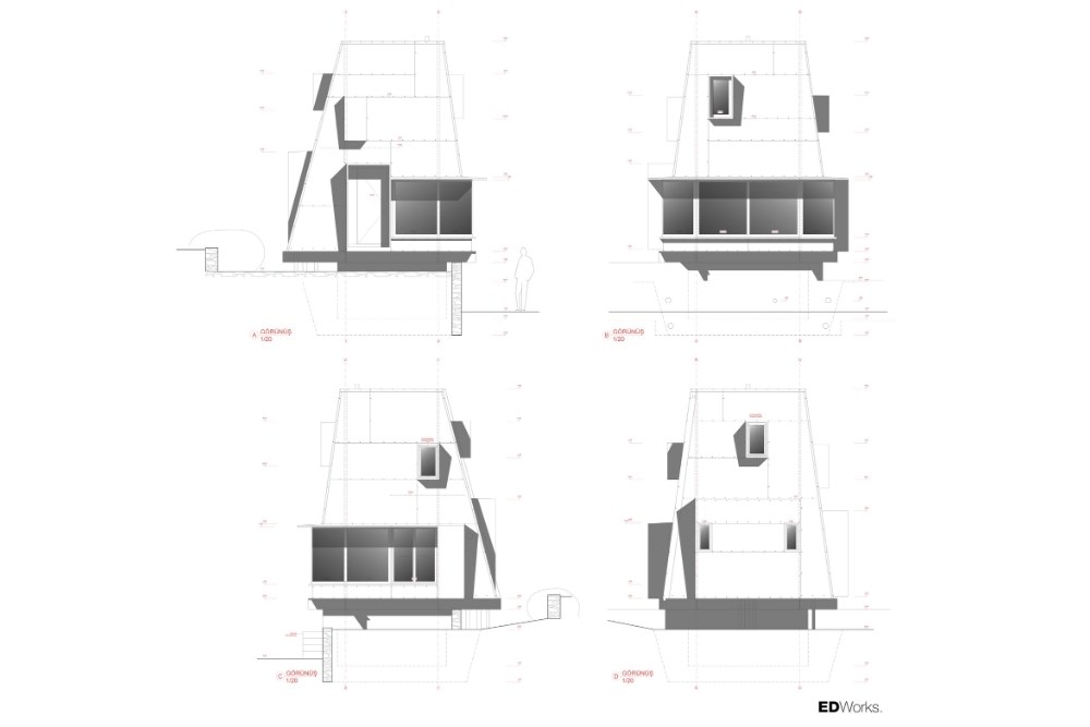 İçinde bulunduğu tabii çevreyi panoramik olarak görebilmek amacıyla kabuğa yatay bir yırtık açılmıştır. Cephede yer alan duvar boşlukları ise birer göz gibi kabuktan dışa doğru çıkıntılar oluşturur.