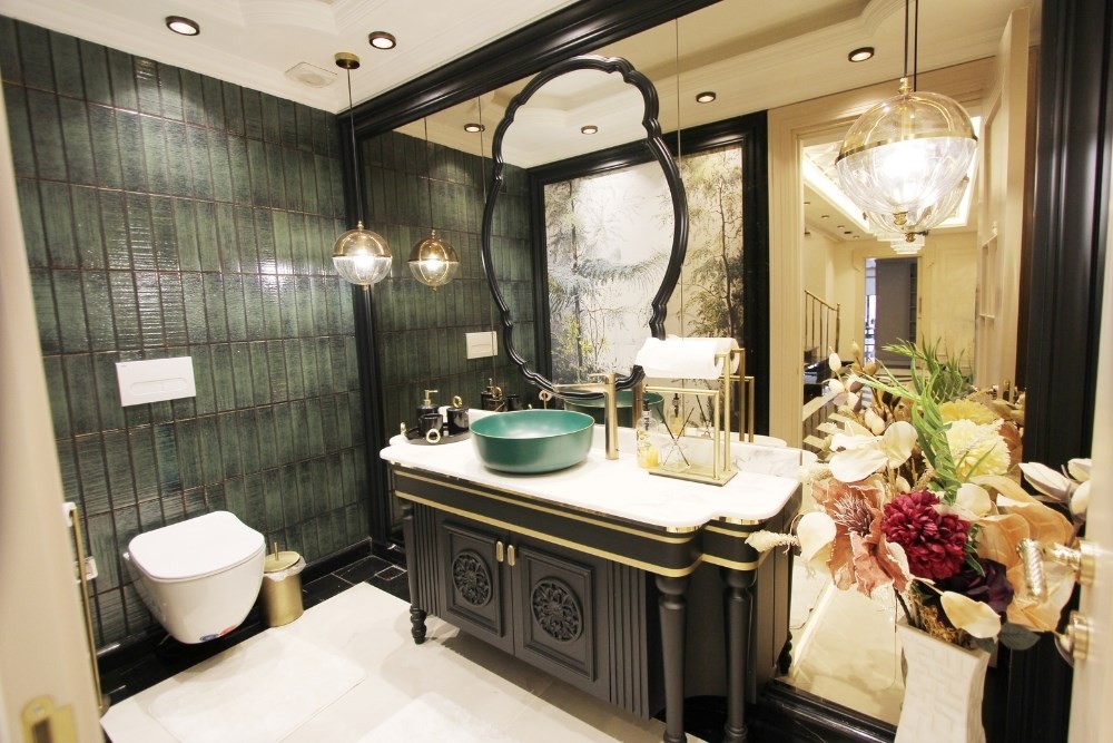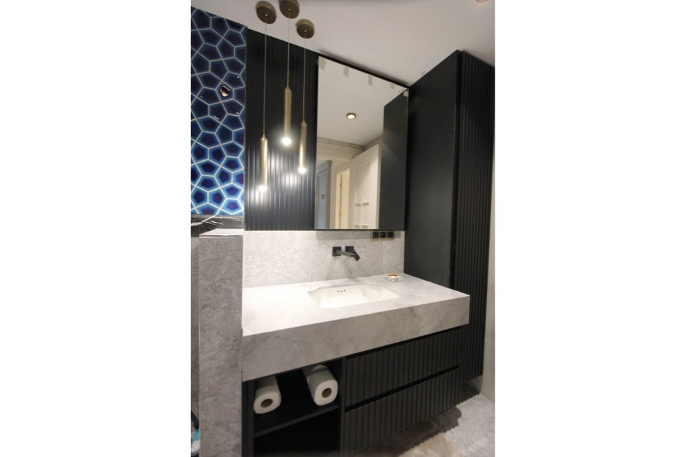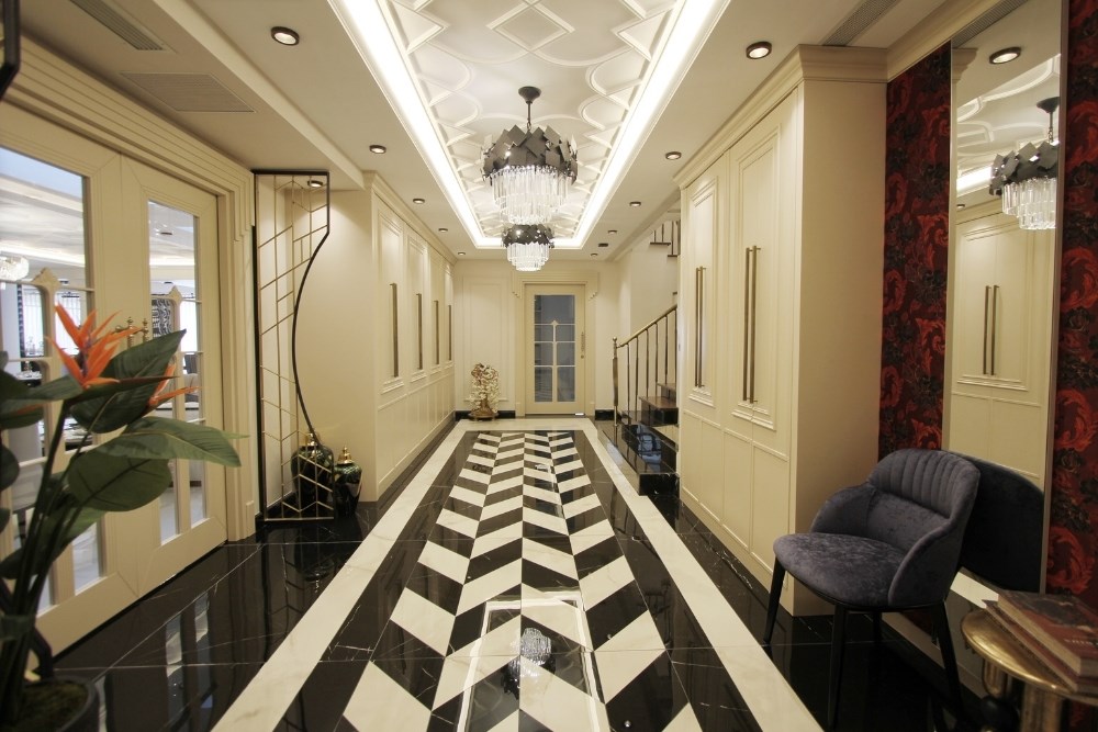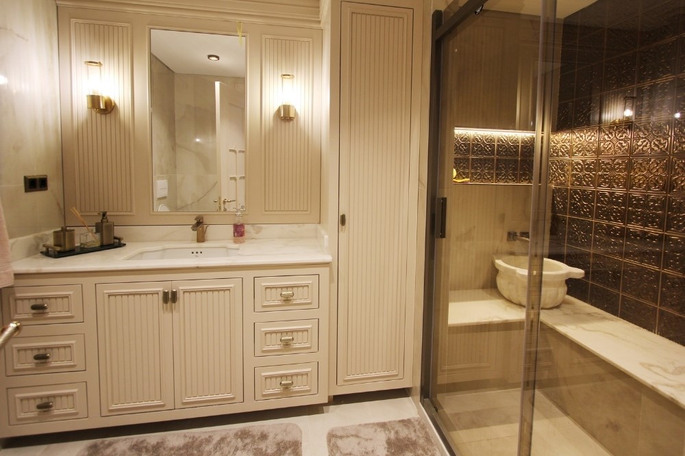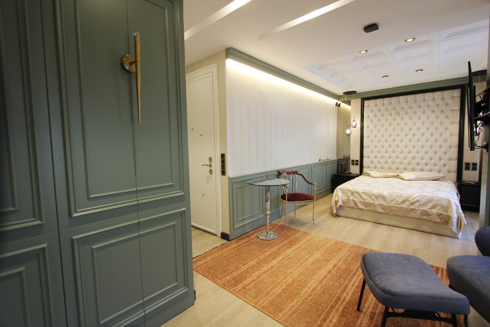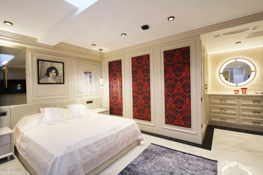 Islak hacimlerde el yapımı çiniler, yaşam alanlarında ve televizyon ünitelerinde ise nanoseramik paneller kullanılarak, geleneksel ve çağdaş yapı malzemelerinin dengeli bir şekilde bir araya getirildiği özgün bir malzeme kompozisyonu oluşturulmuştur.