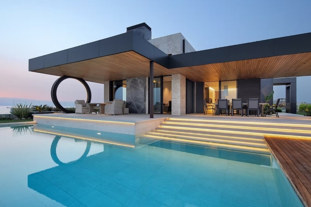 Villanın geniş saçaklı 75m² büyüklüğündeki terasında bir dış mutfak tezgahı ve bu tezgahın arkasında bahçeden ulaşılan bir depo ve duş alanı bulunur. Doğuda bu kitle üzerine oturan geniş saçak, batıda, projenin adını da veren, güneş batışı ile bütünleşen dairesel bir kolon ile taşınmaktadır. Alt kotta bulunan sonsuzluk havuzu, terasla aynı malzeme ile kaplanmış terastan güneşlenme alanına inen merdivenlerin havuzun içine de devam etmesiyle havuz, güneşlenme alanı ve terasın bütünlük içinde algılanması sağlanmıştır.