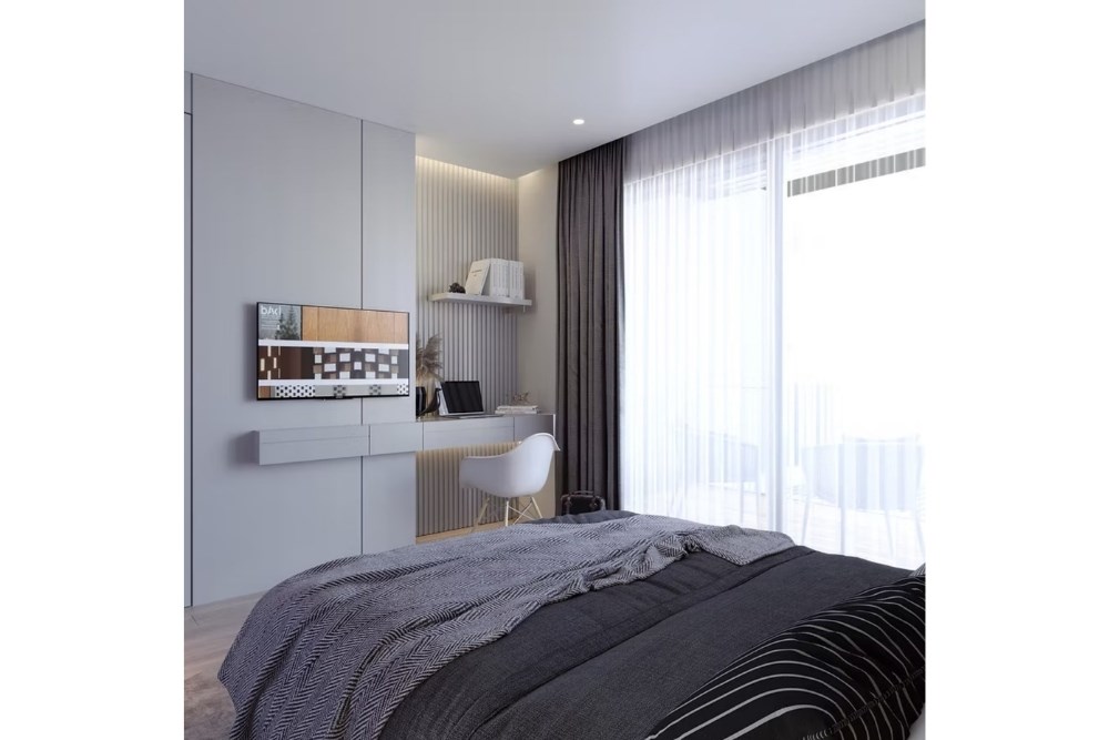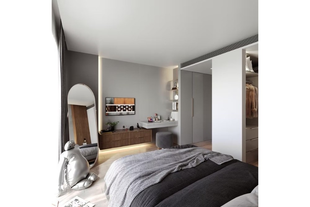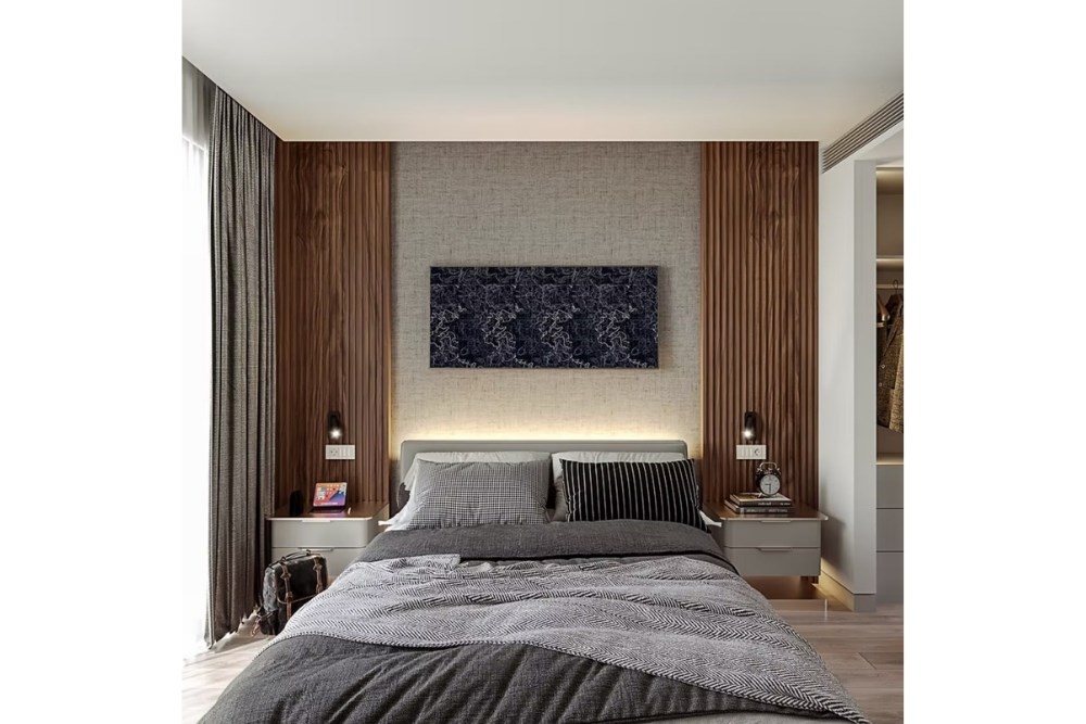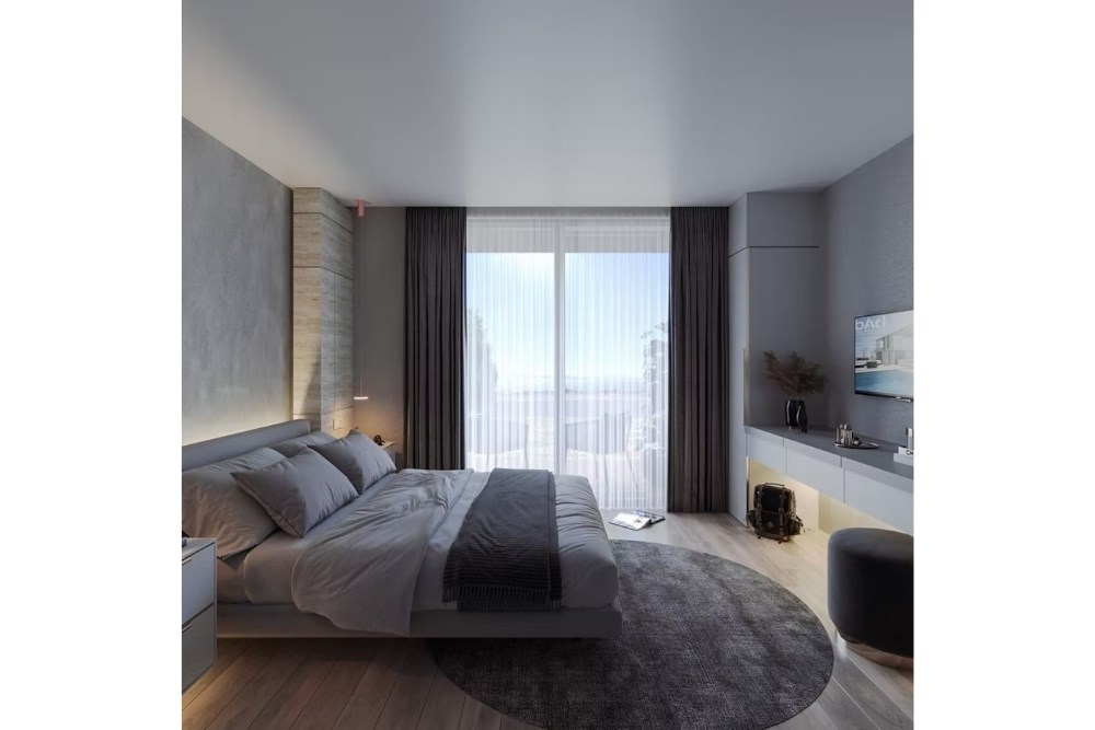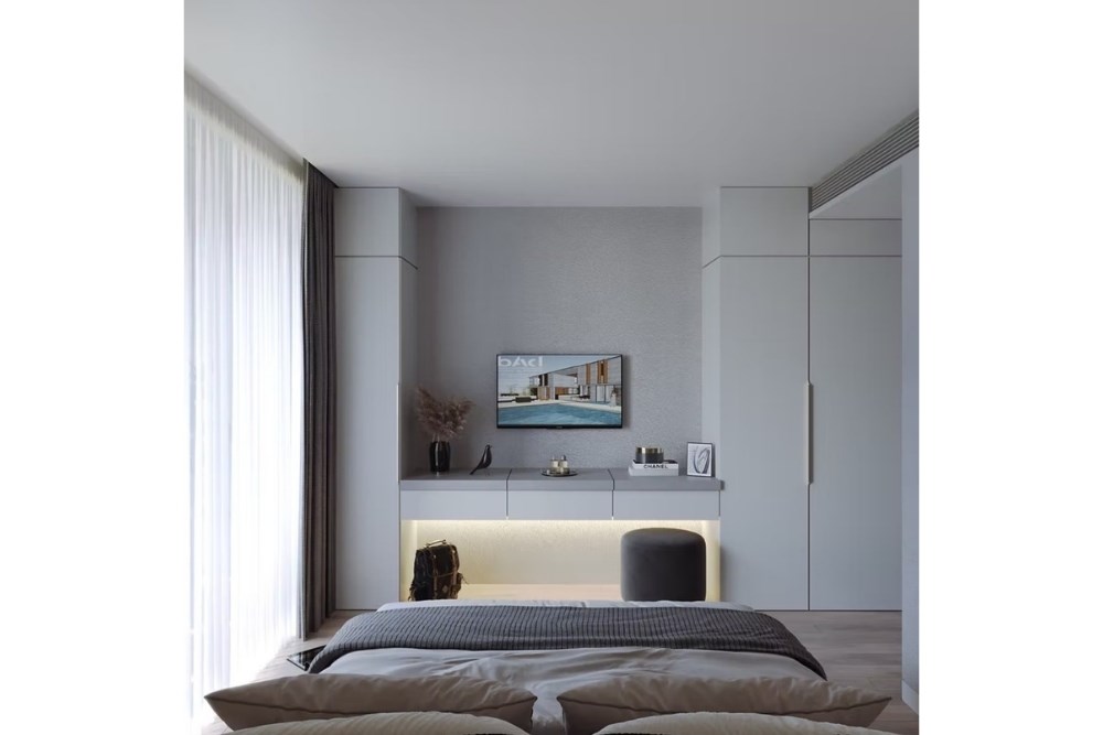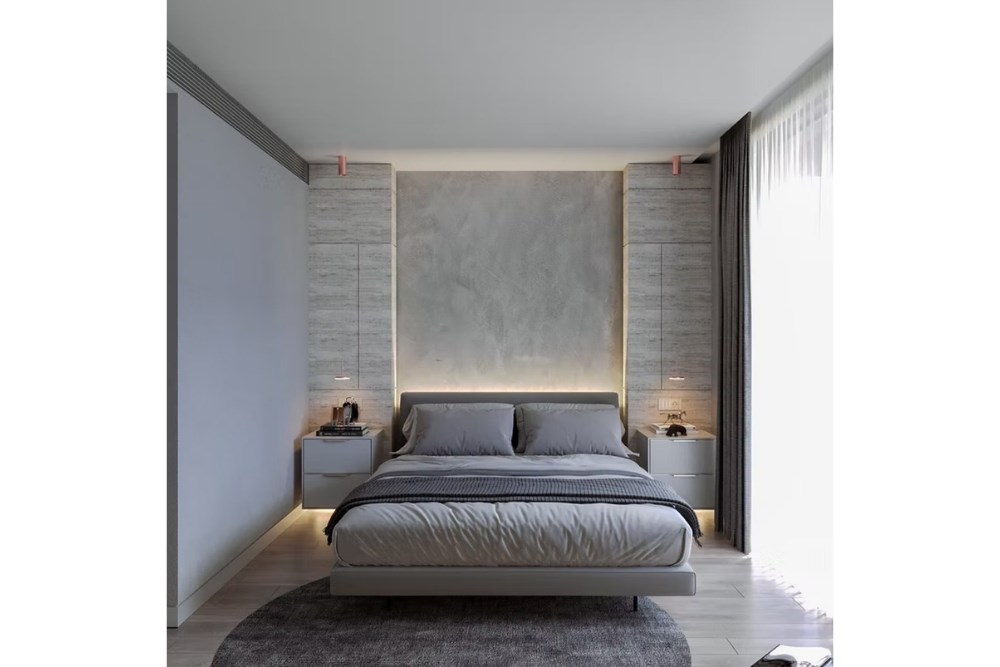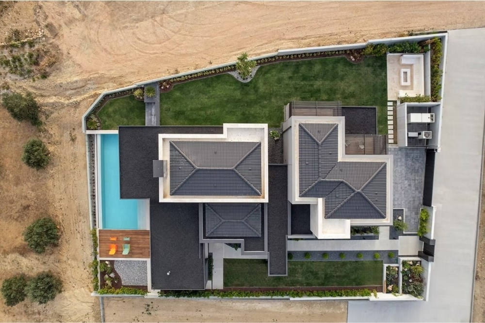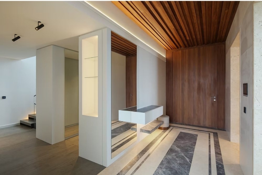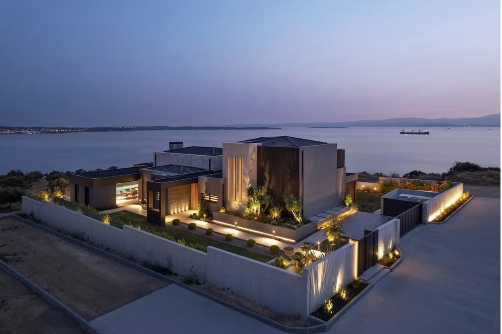 Holün sağında ise zemin katta ikisi de kendi teraslarına açılan, bir banyolu misafir odası ve banyo ve giyinme odalı ebeveyn odası, üst katta ise 2 adet banyo ve giyinme odalı oda yer alır. Üst kattaki her iki yatak odası da Çeşme'nin huzurlu manzaralarının keyfini çıkarmak için mükemmel olan özel balkonlara erişim sunar. Yatak odaları kütlesinde bulunan merdiven ile ulaşılan bodrum katta teknik hacim, depo ile kuranglez ile hava ve ışık alan çamaşır odası ve banyolu yardımcı odası bulunmaktadır.