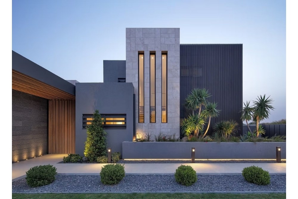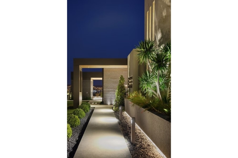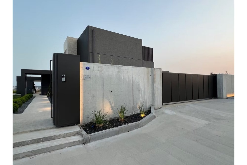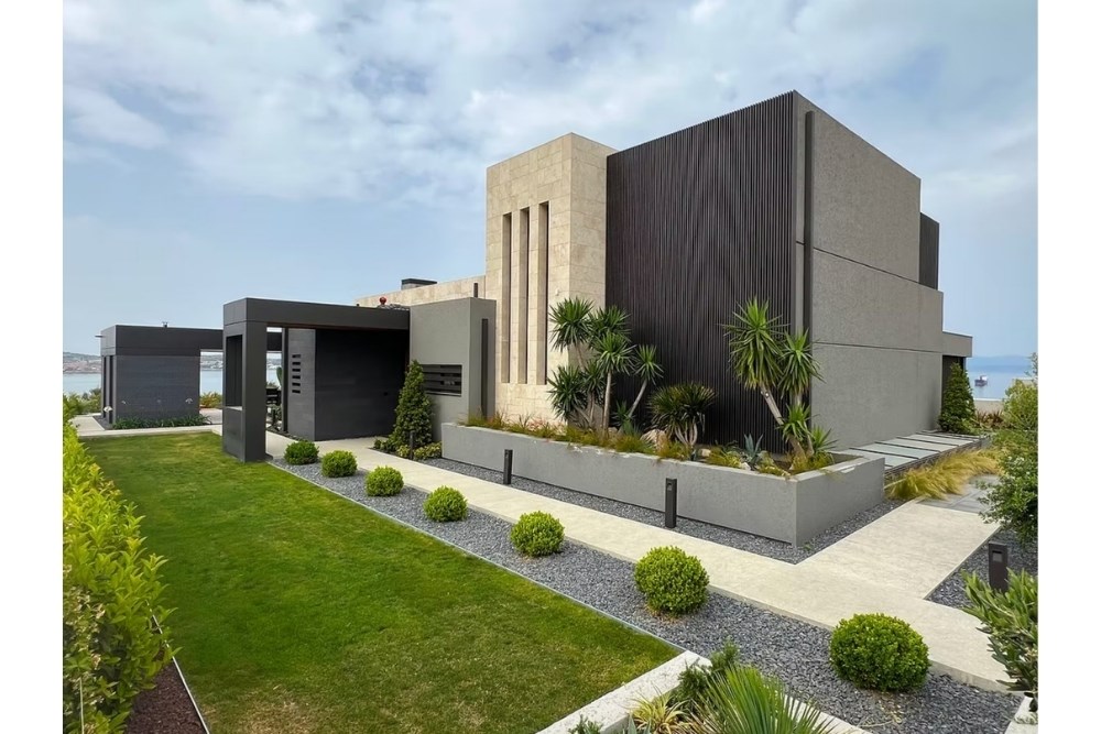 Bahçeye, brüt beton bahçe duvarındaki garaj ya da yaya kapılarından giriş yapılmaktadır. İki araçlık park yerinin yanında yer alan teknik hacimde klima dış üniteleri ve jeneratör bulunmaktadır. Brüt beton bahçe duvarları, manzara tarafında bahçeden 50 cm yükseklikte tutularak şeffaf cam korkuluk ile tamamlanmıştır. Doğu cephesinde ise yolun düşük kotta olmasından faydalanılarak mahremiyeti bozmayacak şekilde duvarlar 110 cm yükseklikte bitirilmiştir.