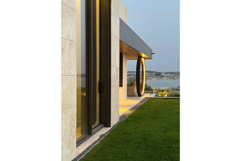 Malzeme seçimlerinde dış cephede iri dokulu sıva ile ağırlıklı olarak Ege Bölgesi’nden sağlanmış dokulu doğal taş tercih edilmiş, içeride ise soluk renkli lamine parke ve tek tip bej seramik kullanılmıştır. Salon, mutfak ve merdiven kitlesinin cephesinde kullanılan, Denizli’den proje için özel olarak seçilmiş açık renk croscut traverten honlu ve dolgusuz bir şekilde kullanılmış, cepheler haricinde iç mekanda da holdeki kapı söveleri ve salonda sanat eseri sergilenmesi düşünülen yüksek duvar, yerdeki masif ahşap parkelerin çerçevesinde kullanılmıştır. Bu traverten, taraklı bazalt ile birlikte cephede kullanılarak yaşam alanlarına estetik bir dokunuş katmıştır. Şömine için seçilen doğal taş (Claros, Menderes) ise giriş holünün döşemesinde cephede kullanılan traverten ile birlikte kullanılmıştır.