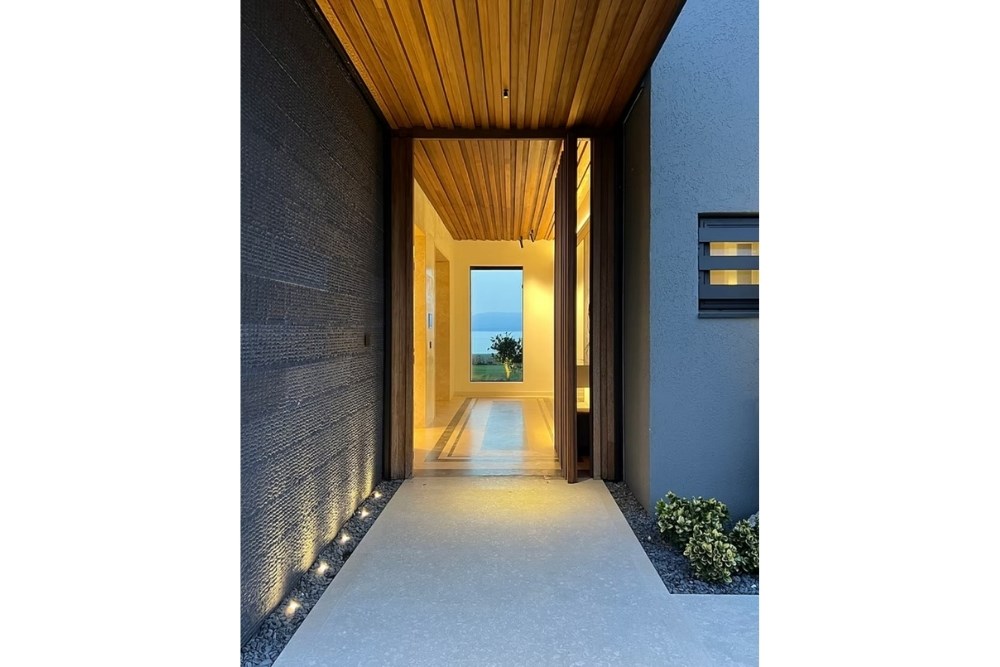 Doğu cephesi boyunca evin giriş kapısına kadar uzanan geniş saksı, giriş peyzajının yapının bir parçası gibi algılanmasını sağlamaktadır. Evin içine kadar uzanan iroko tavanlı saçak, yaşama ve yatak odalarını ayıran hole giriş yapılmasını sağlar. Saçak ile aynı dokuda kaplanmış geniş pivot kapıdan hole girildiğinde, Sakız Adası manzarasını çerçeveleyen bir açıklık ile karşılaşılır. Bahçe giriş kapısından ev giriş kapısına kadar uzanan doğal taş kaplı yol ile salon ve mutfak önündeki ana terasa da eve girmeden ulaşılmaktadır. Ayrıca; bahçenin kuzeybatı köşesinde, otopark alanından da direkt ulaşılabilen bir sabit oturma alanı ikincil bir yaşam alanı olarak tasarlanmıştır.