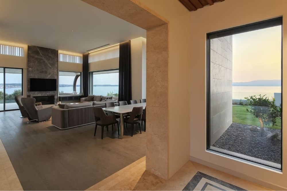 Holün solunda, aralarında bir servis penceresi bulunan kilerli mutfak ve dört metre yüksekliğindeki salon yer alır. Salon, doğrudan çimen alana ve manzaraya açılan yüksek doğrama önündeki yemek alanı ve geniş oturma alanı ile dikkat çeker. Holün sağında ise yatak odaları kitlesi bulunmaktadır. Tamamı kendi banyosuna sahip yatak odaları manzaraya yönelmiştir ve her yatak odasının dış mekana erişimi bulunmaktadır. Servis alanları, doğu cephesinden lameller ile mahremiyet sağlanarak ışık ve hava alır.