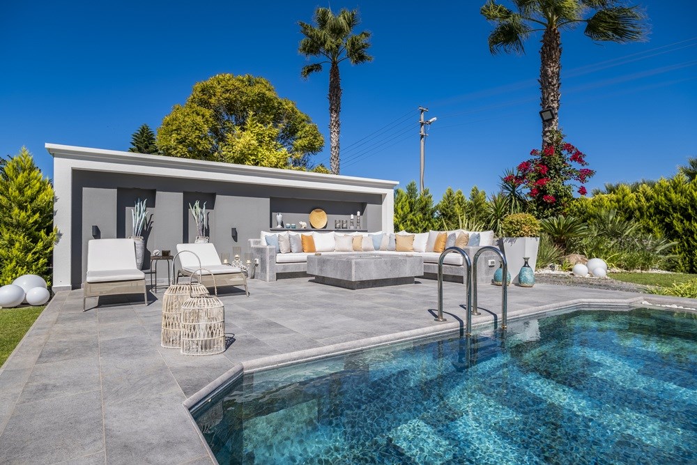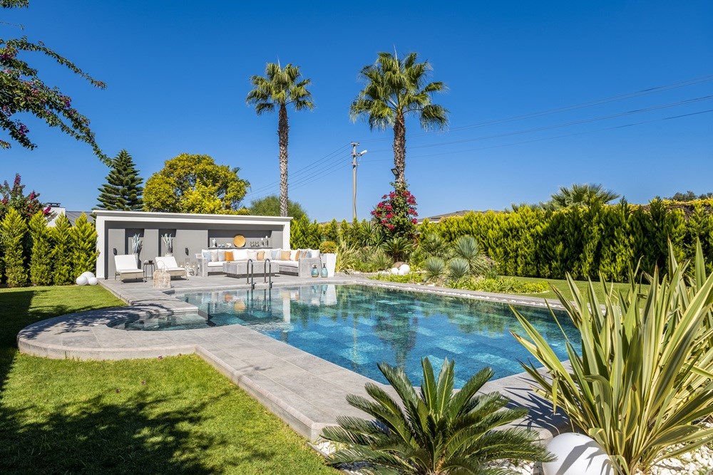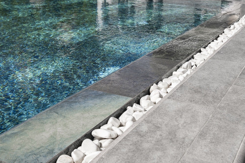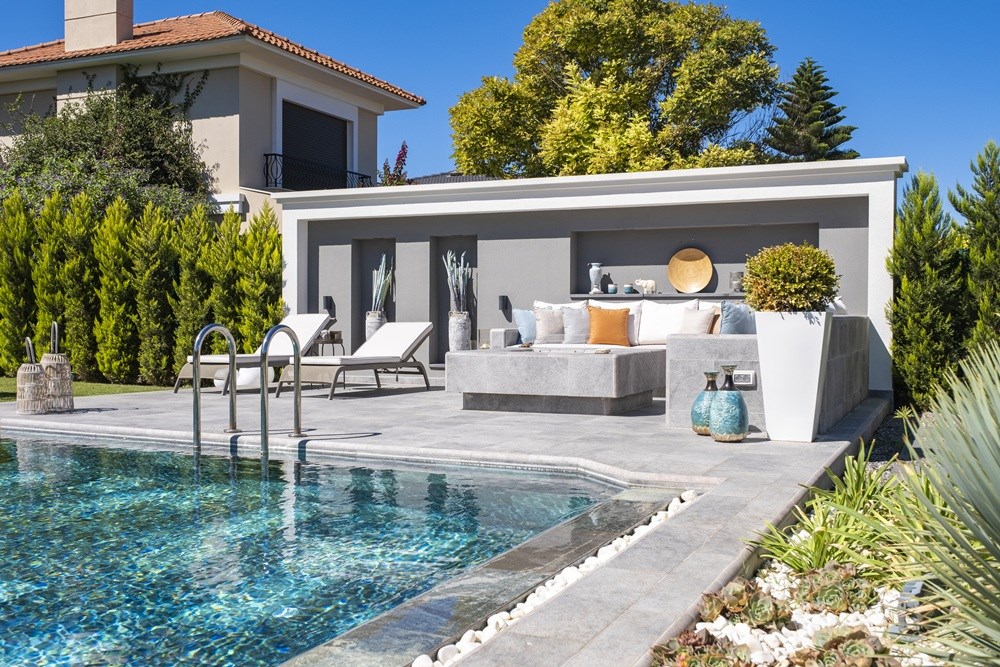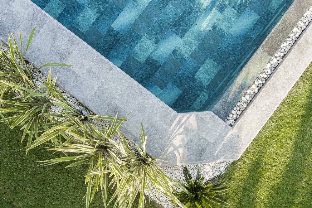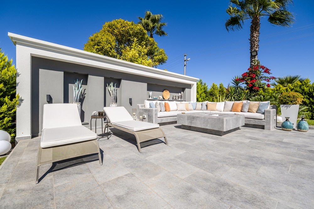 İzmir Çeşme’de hayata geçirilen villa projesinde, havuz içinde Natural Seri’nin Olcay Mix ürünleri tercih edilirken; teraslarda ve havuz başındaki sabit oturma alanında Pool Garden Grey kullanılarak hem estetik hem de işlevsel bir bütünlük sağlandı. Projede oluşturulan sabit oturma alanı, yazlık evlerde sıkça karşılaşılan bahçe mobilyalarının depolanması sorununa pratik bir çözüm sunmasıyla dikkat çekiyor. Bu uygulama sayesinde kullanıcılar, alanı diledikleri zaman kolayca temizleyip minderlerini yerleştirerek kısa sürede kullanıma hazır hale getirebiliyor.