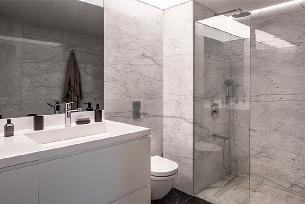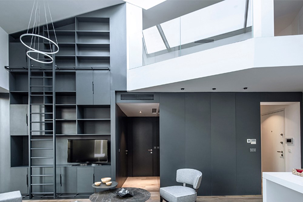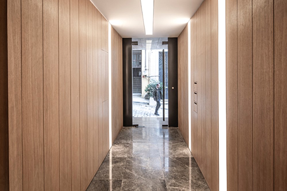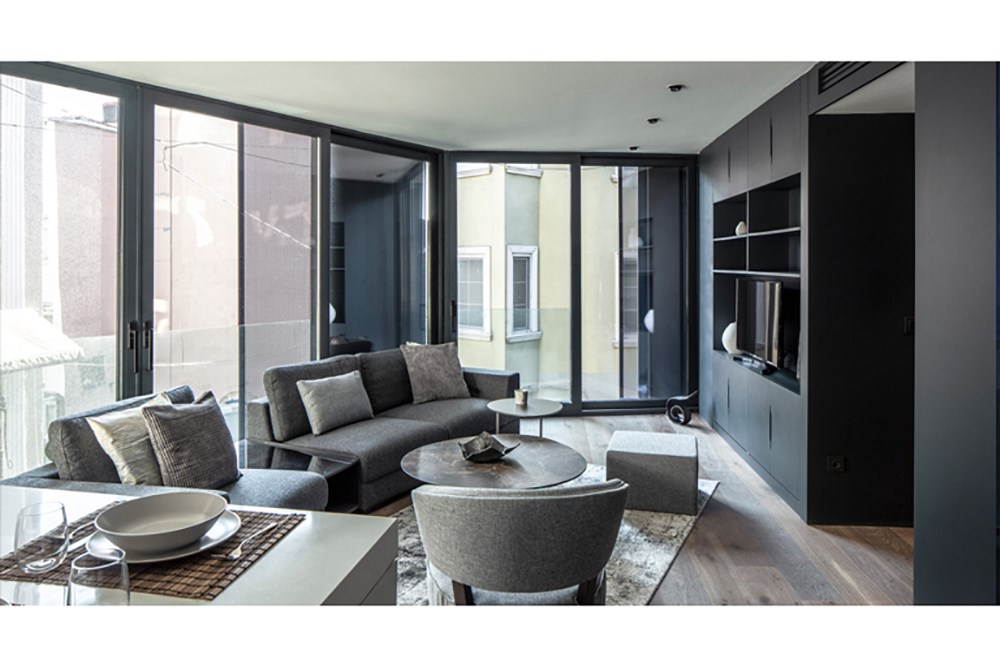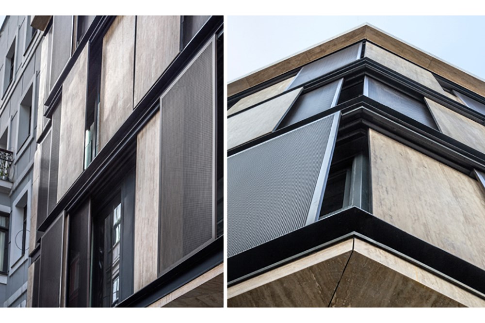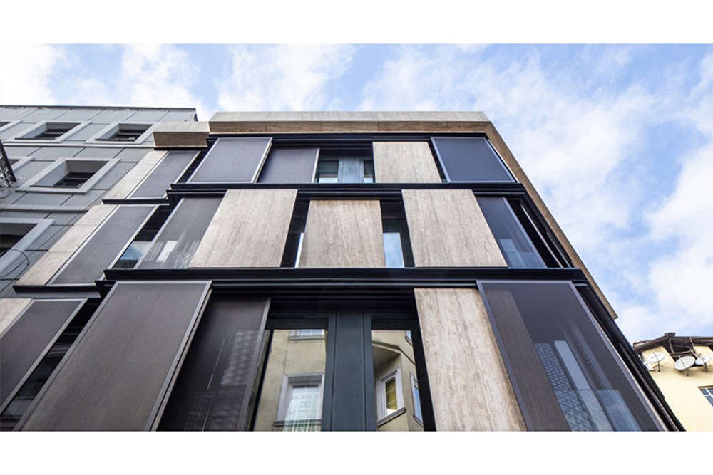 Tarihi dokunun içinde, yakın çevredeki ton ve malzeme kullanımı ile uyumlu fakat karakteristik olarak çağdaş ve özgün bir cephe yaratma yaklaşımı, tasarımın ana çıkış noktasıdır. Bu bağlamda, ara sokakta bulunmasından ötürü kısıtlı gün ışığına sahip bu alanda, maksimum gün ışığı alabilecek ama aynı zamanda bir konut yapısında bulunması gereken mahremiyet ortamını da sağlayabilecek, katmanlı bir cephe tasarımına gidilmiştir. Farklı yoğunlukta ışık geçirimine sahip cam, taş ve metal yüzeyler katmanlı olarak cephede ele alınmıştır. Geçirimli metal ve taş yüzeyler tüm cephe boyunca hareketli paneller halinde ele alınmış ve kullanıcıların gün içindeki değişimine bırakılmıştır. Yapının iç mekân tasarımında ise maksimum kullanıma olanak veren yüzey ve hacimler yaratacak şekilde dingin, sade ve modern bir tasarım amaçlanmıştır. İki farklı renk ve tonun hâkim olduğu iç mekân tasarımı bu yaklaşımla şekillendirilmiştir.