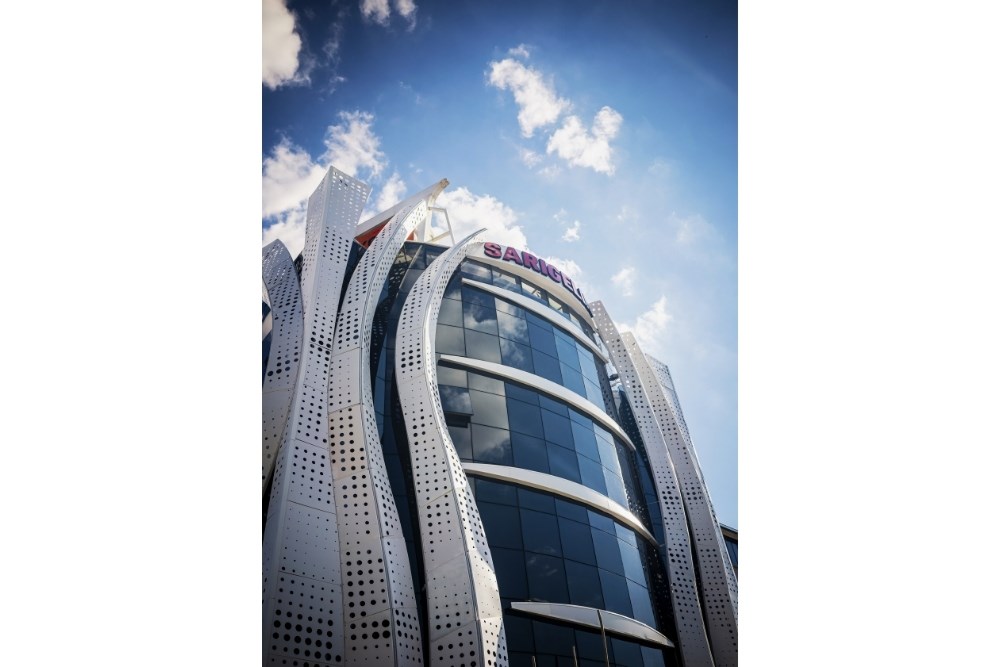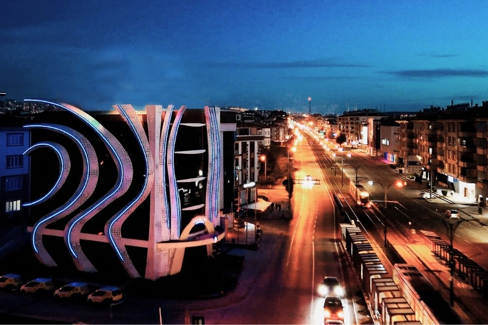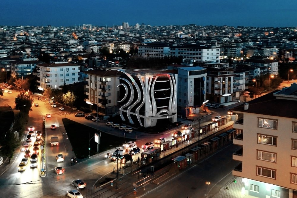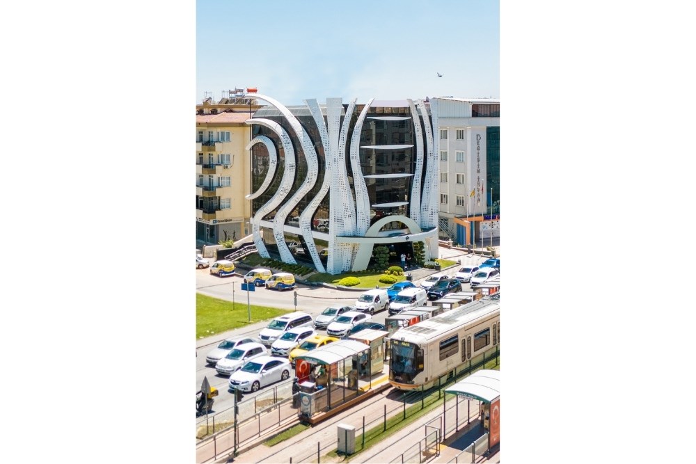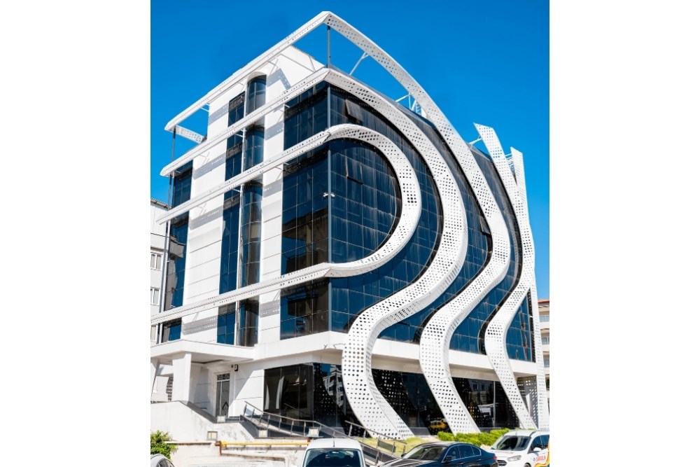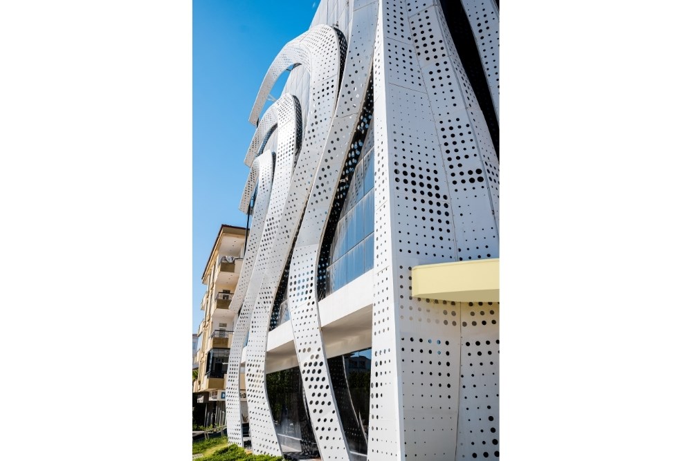 Cephe tasarımında öne çıkan sarmal hareket, eğrisel formun sürekliliğiyle bütüncül bir yüzey etkisi yaratmaktadır. Bu yaklaşım, yapıya modern bir estetik kazandırırken aynı zamanda kent siluetinde güçlü bir vurgu oluşturmaktadır. Kullanılan özel üretim perfore metal paneller, gün ışığı ile etkileşim içinde farklı yansımalar oluşturarak cephenin gün boyunca değişken ve canlı bir karakter kazanmasını sağlar.