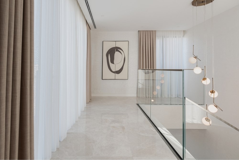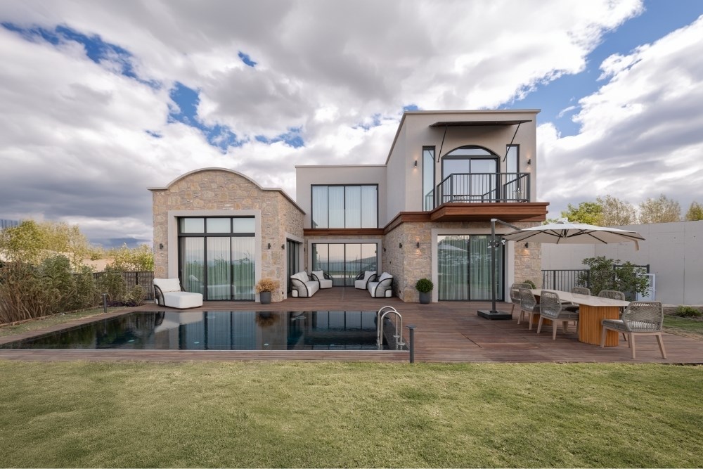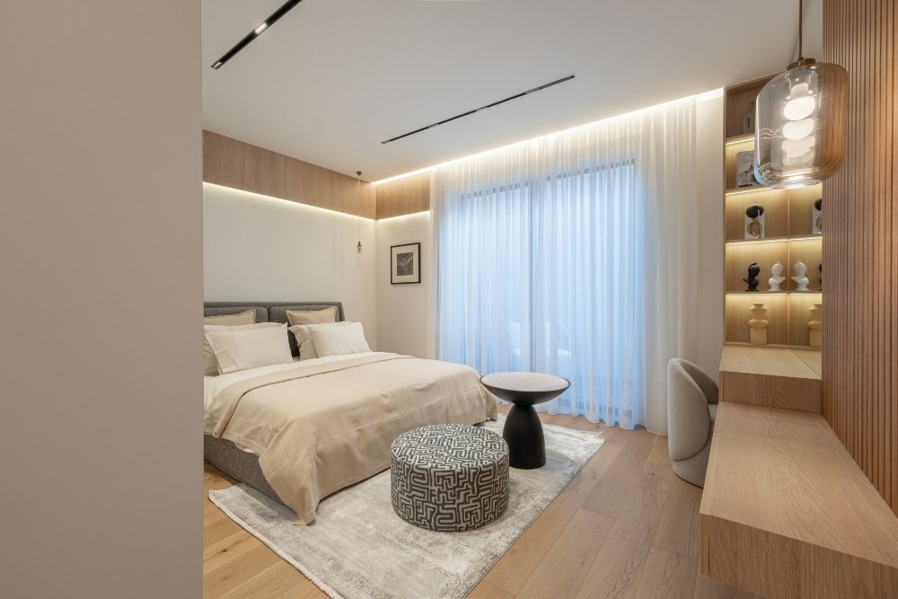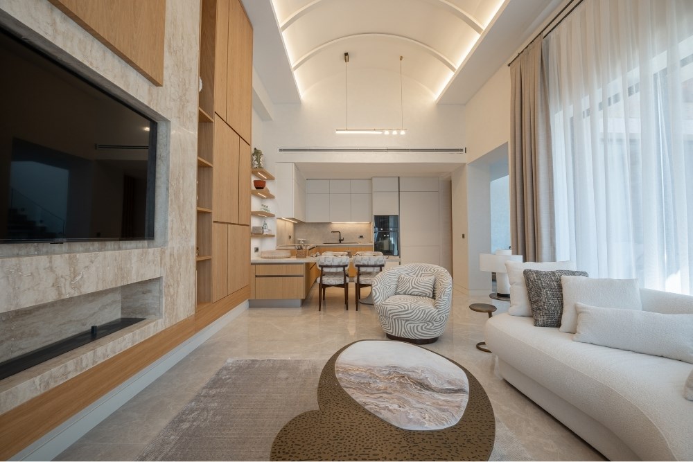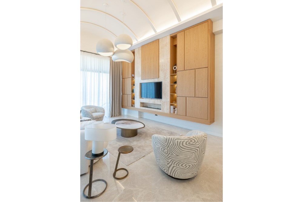İç mekânda, modern tasarım anlayışı ile sıcak ve davetkâr bir atmosfer yaratılmıştır. Doğal tonlar ve yumuşak dokuların hakim olduğu oturma alanı, hem konforu hem de estetiği ön planda tutmaktadır. Mekânın en dikkat çeken unsurlarından biri, ahşap detaylarla zenginleştirilmiş duvar panelidir. Bu panelde televizyon ünitesi ve raf sistemleri bir araya getirilmiş, fonksiyonellik ile estetik denge sağlanmıştır. Oturma alanındaki mobilyalar yuvarlak hatlara sahip olup mekanın yumuşak geçişlerini ve huzurlu atmosferini desteklemektedir. Bej ve açık tonların hâkim olduğu kumaşlar, iç mekanlara ferahlık katarken büyük pencerelerden gelen doğal ışık bu atmosferi tamamlamaktadır. Tavandaki modern aydınlatma elemanları dekorasyona çağdaş bir dokunuş eklerken ahşap ve mermer dokuların uyumlu birleşimi lüks bir yaşam alanı sunmaktadır. Genel olarak bu iç mekanda, minimalizmle birlikte sıcak bir konfor sunulmuş ve kullanıcıların hem görsel hem de fiziksel olarak keyif alabileceği bir yaşam alanı yaratılmıştır.