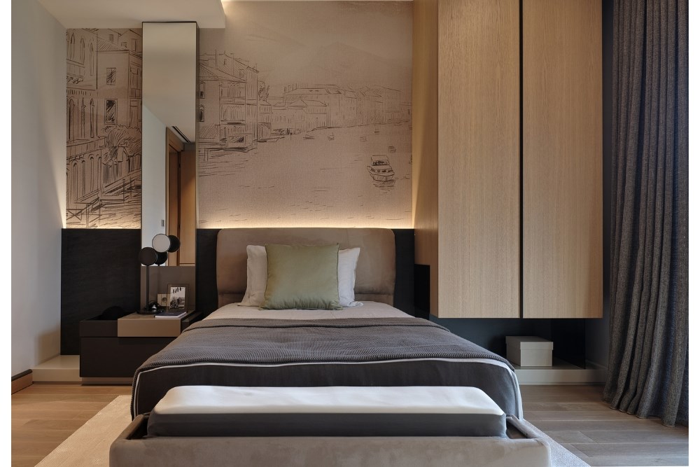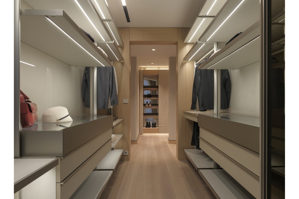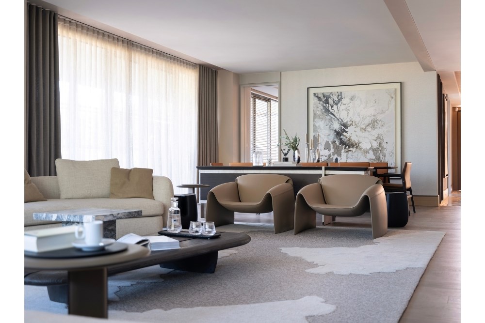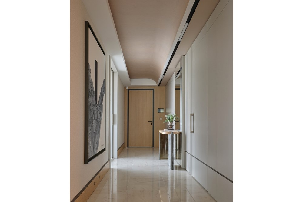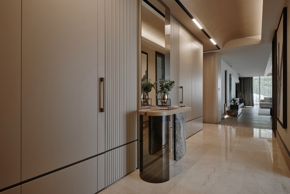 370 metrekarelik alana yayılan daire, 5,5+1 planıyla ferah ve esnek bir yaşam alanı sunuyor. Tasarımın öne çıkan yönlerinden biri, çağdaş zarafet ile bölgesel etkiler arasındaki dengeli ilişki. Giriş bölümünde yer alan niş alan, mahremiyet ve hava akışını kontrol altına almak amacıyla planlanarak Adana’nın sıcak iklimine yanıt veriyor. Bu alanda, depolama üniteleri gizli kapaklar arkasında konumlandırılarak hem işlevsellik sağlanıyor hem de bütünsel estetik korunuyor.