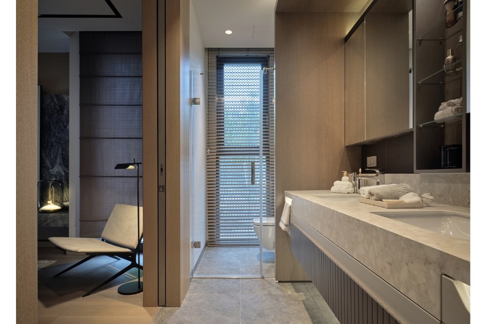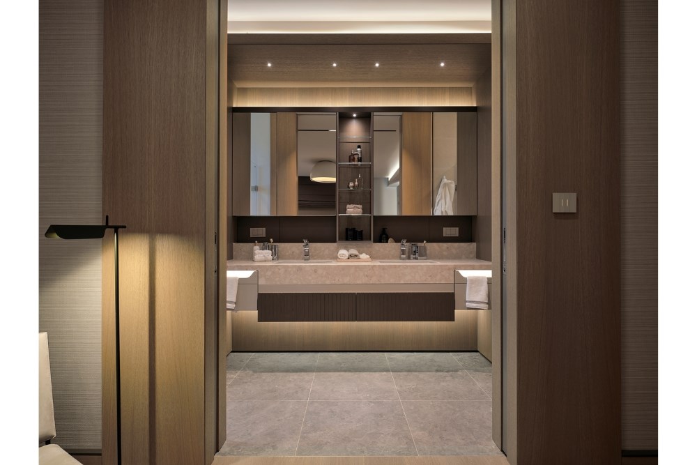 Tam donanımlı mutfakta, kullanım kolaylığı ve şıklığı artıran özenle seçilmiş bir malzeme paleti tercih edilirken, poliform mutfak modüllerini çerçeveleyen ahşap kemer, aydınlatma elemanları ve hassas detaylarla zenginleştirildi. Ebeveyn banyosu ise yatak odasıyla görsel uyum içinde; uzatılmış lavabo tezgâhı, entegre depolama alanları ve sıcak ahşap yüzeylerle yansıtıcı malzemelerin uyumlu birleşimiyle dikkat çekiyor.