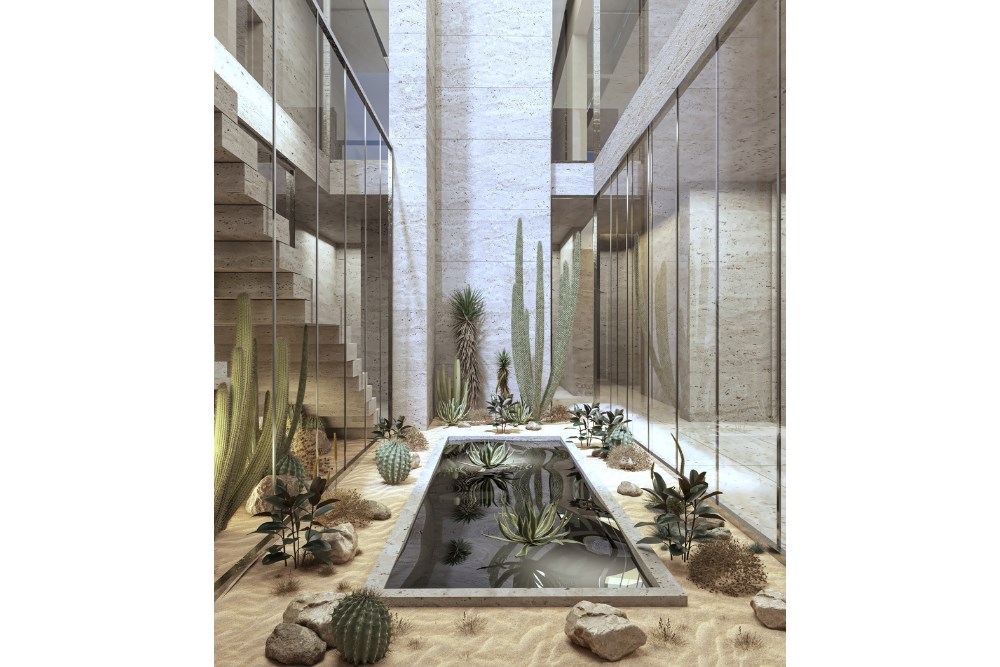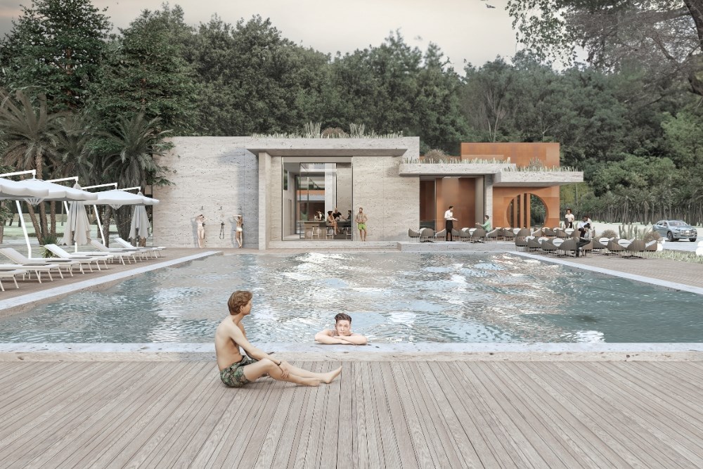 Tasarıma başlarken Bodrum'un geleneksel evleri, kentin ölçekli dokuları, denize açılan dar strüktürler, iklim koşulları gibi başlıklara odaklanılmıştır. Yerel yaşam alışkanlıklarına bağlı olarak iç ve dış mekânlar arasındaki sınırların geçirgenliğinin sağlanması hedeflenmiştir. Bu nedenle, arazi üzerindeki her konaklama binasında, komşu binalar arasındaki sınırlar korunurken, geleneksel evlerde olduğu gibi mekânlar farklı kütleler halinde planlanarak saçaklar, avlular ve iç bahçelerle birbirine bağlanmaktadır. Böylece ortaya çıkan parçalı yapı topluluğu, Bodrum'un mevcut yapı dokusuyla uyumlu bir ölçeğe indirgenmiştir. Uzaktan bakıldığında dev ve monoton bir yapı algısını kırmak ve geleneksel yapı dinamiklerine uyum sağlamak için tek bir yapıyı oluşturan kütleler ve onları birbirine bağlayan saçaklar farklı üst kotlarda bir araya getirilmiştir.