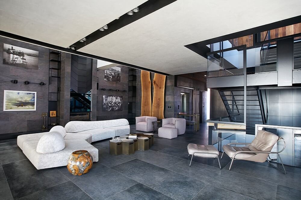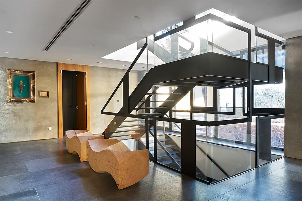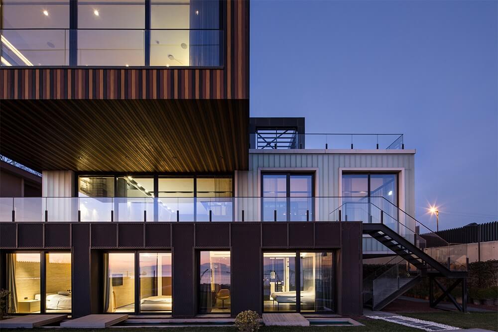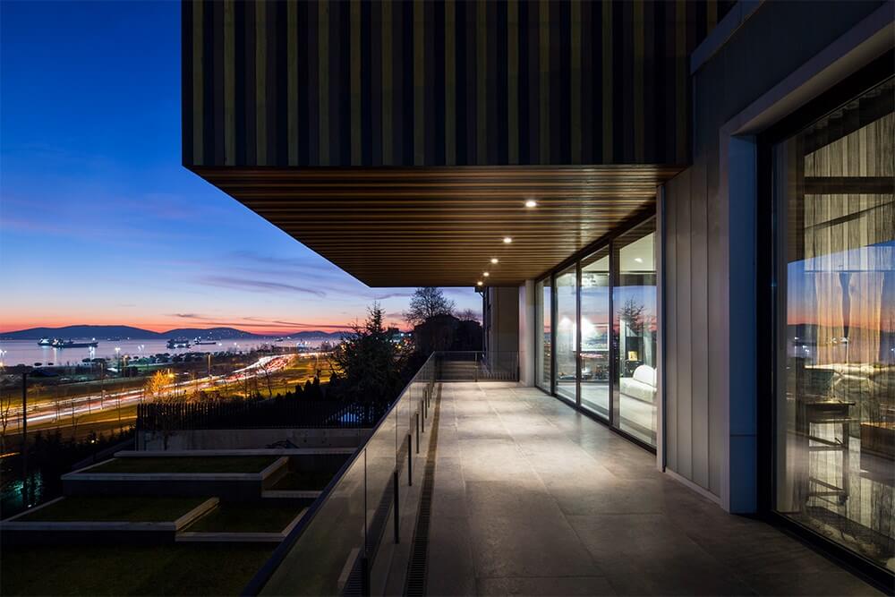Arazideki kot farkı; bodrum kat kütlesinin ön bahçeye, zemin kat kütlesinin ise arka bahçeye düz ayak şekilde oturmasına imkân verir halde. Bu mimari kurgu, yaklaşık olarak arazinin geometrik merkezine denk gelen iç bahçe ve ona düşeyde eşlik eden ana merdiven ile tamamlanarak nihai haline bürünmüş olur. Zemin kattaki en kritik algı; bahçe kapısından deniz manzarasına kadar kuzey-güney yönünde yakalanmaya çalışılan sürekli perspektif algısı. Bahçe kapısı açıkken dahi yapının içinden doğru görünen Marmara Denizi ve oradaki yük gemileri sizi adeta yapının içerisine davet eder halde okunabilir.