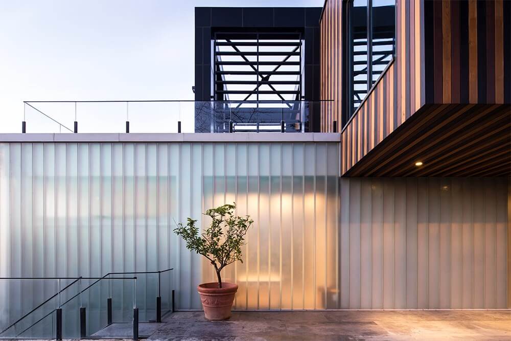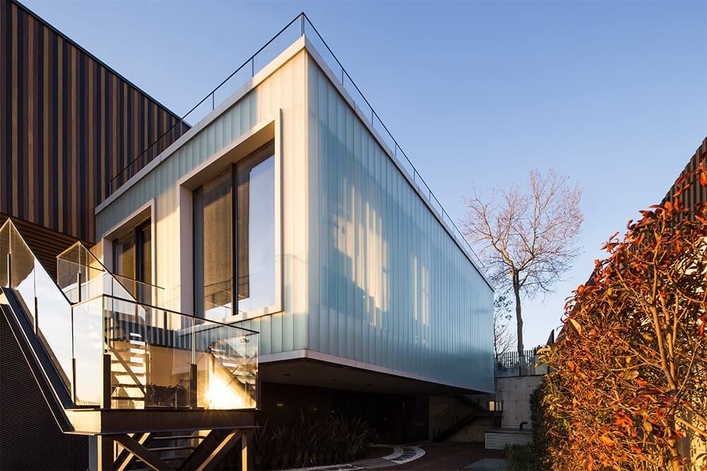 Batı cephesinde izdüşümleri üst üste gelen; diğer yönlerde ise uzanarak birbirinin üzerinde kayan 3 ortogonal kütle ve bu 3 kütleyi birleştiren bir düşey boşluk. Mümkün olduğunca yalın ve dolaysız. Arazinin belli köşelerini tutan bu 3 yatay kütle farklı yönlerde temas ettiği diğer kütlelerin terası ya da saçağı haline gelir. İzdüşümü sabit olan batı cephesi ise otopark rampasının plandaki satıhını oluşturmakta.