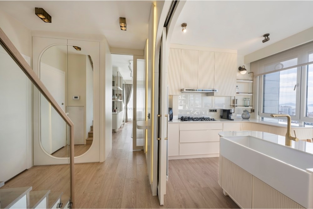 İlk teslim alındığında iki ayrı dubleks daireden oluşan mekan, Elif Arslan Interiors’un yaratıcı bakış açısıyla yepyeni bir kimliğe bürünmüştür. Tüm elektrik ve mekanik aksamlar yenilenen evde, fonksiyonelliği ve ferahlığı ön planda tutan bir tasarım anlayışı benimsenmiştir.