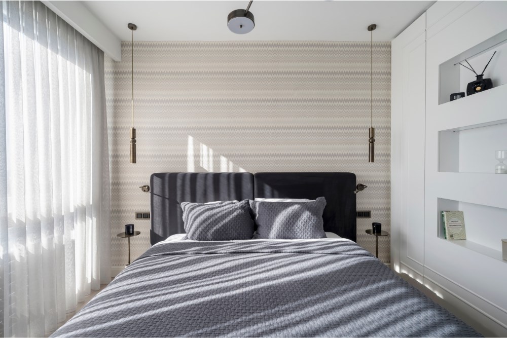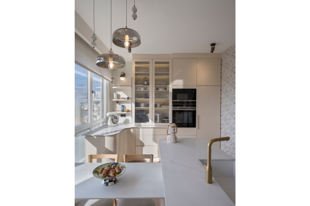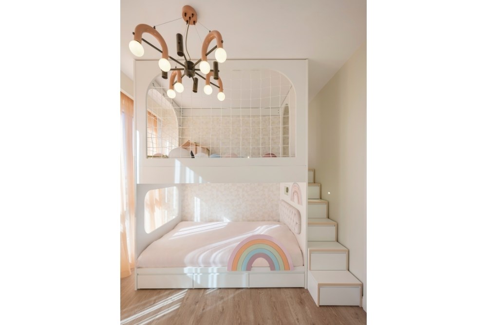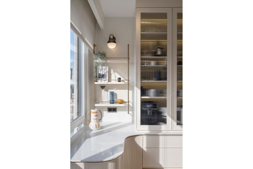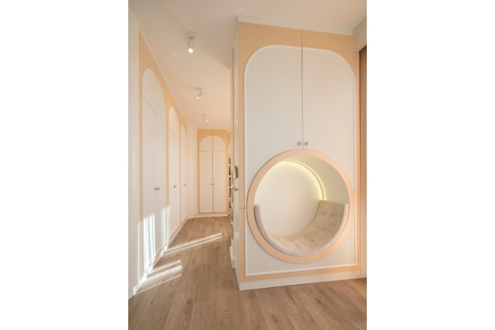 Renk paletinde beyaz ve pastel tonlar tercih edilerek tüm mekanlarda aydınlık ve ferah bir etki yaratılmıştır. Bu sadelik, toprak tonlarında seçilen perdelerle tamamlanmıştır.