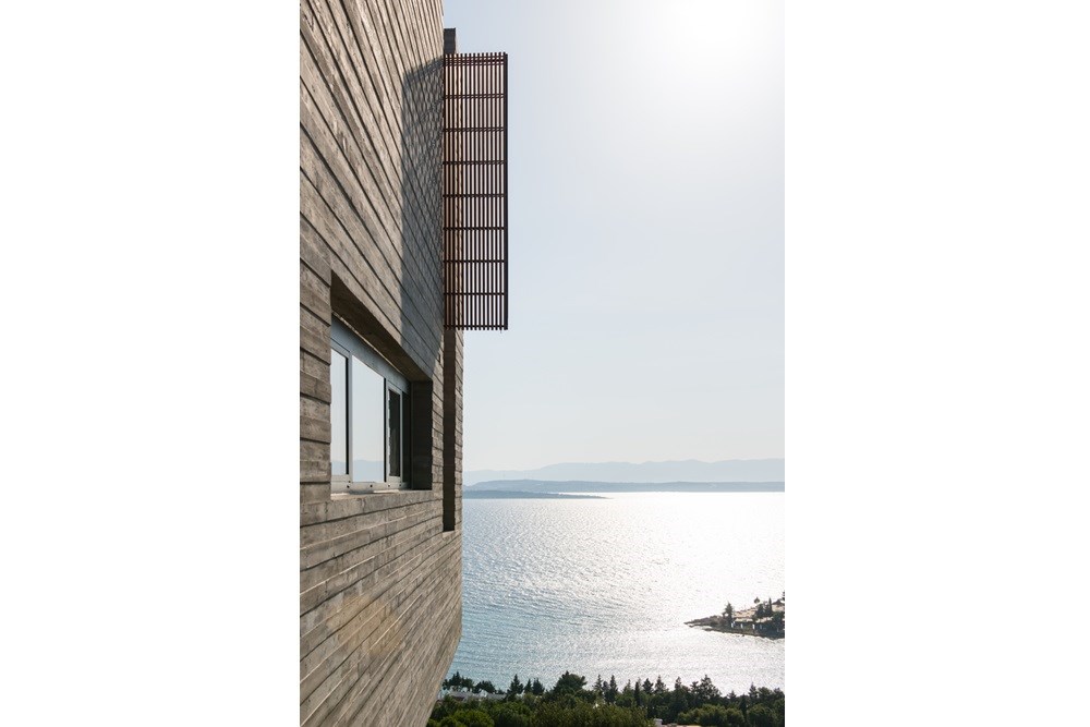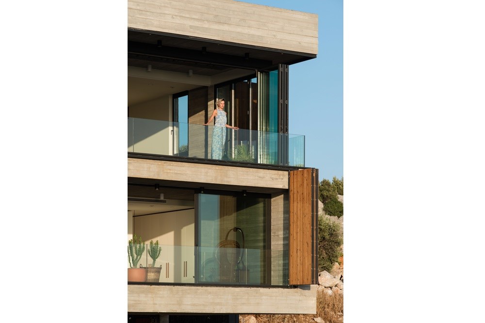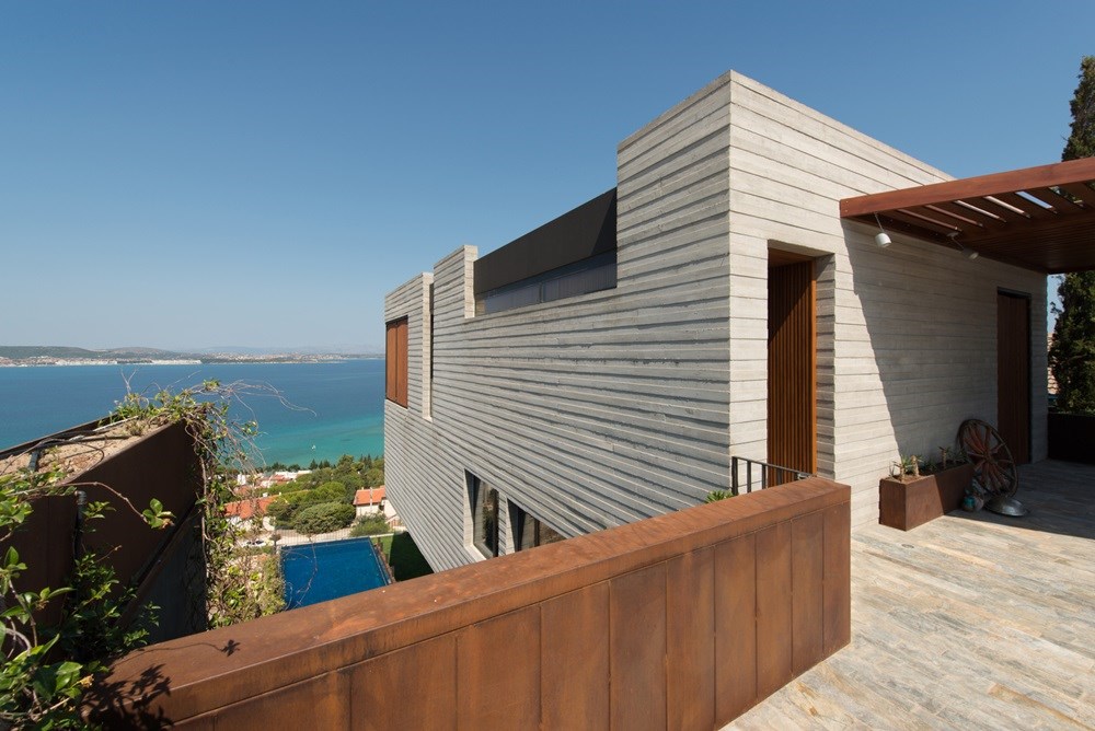 Cephede kullanılan ham beton, ahşap kalıplarla şekillendirilerek zengin bir dokusal derinlik kazandırılmıştır. Bu ham yüzey, ahşap kepenklerin doğal estetiğiyle birleşerek evin sade ve doğal atmosferini tamamlar. Dış döşemelerde mermer tercih edilirken, yatak odası zeminlerinde rustik meşe ağacı kullanılarak iç mekanlara doğal bir sıcaklık katılmıştır.