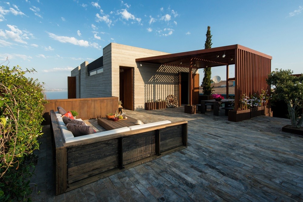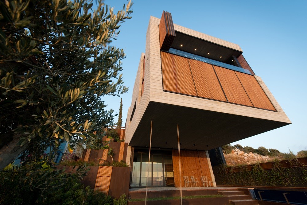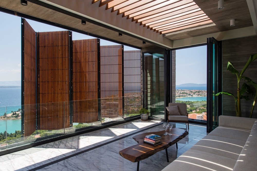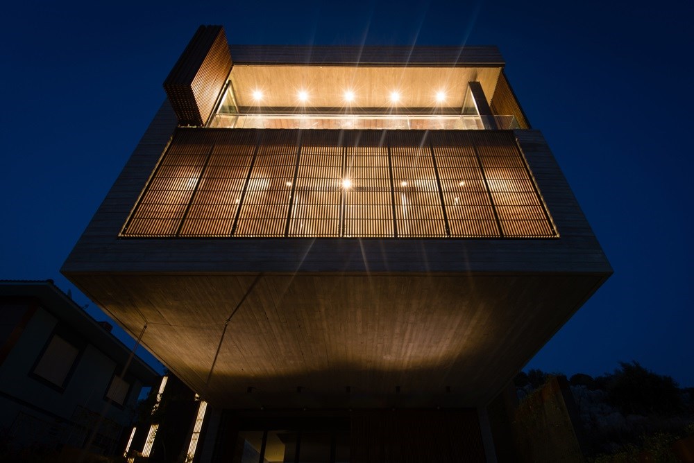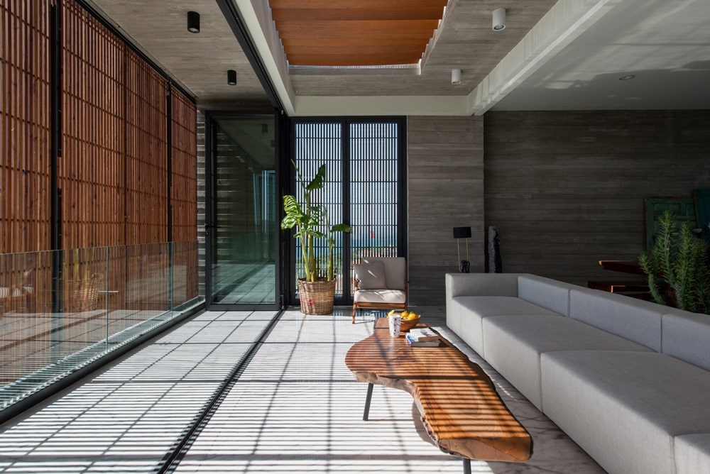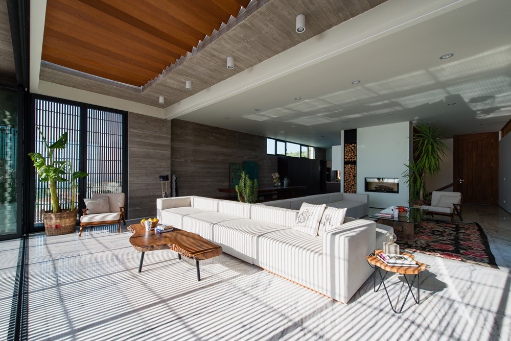 Bu minimalist ev, beton, çelik, taş, ahşap ve cam olmak üzere beş temel malzemenin kusursuz bir uyum içinde kullanılmasıyla tasarlandı. Tasarımın ana hedefi, araziyi en verimli şekilde kullanarak geniş, açık ve esnek yaşam alanları yaratmaktı. Ancak bu evin en dikkat çekici özelliği, cephede kullanılan ahşap kepenk sistemidir.