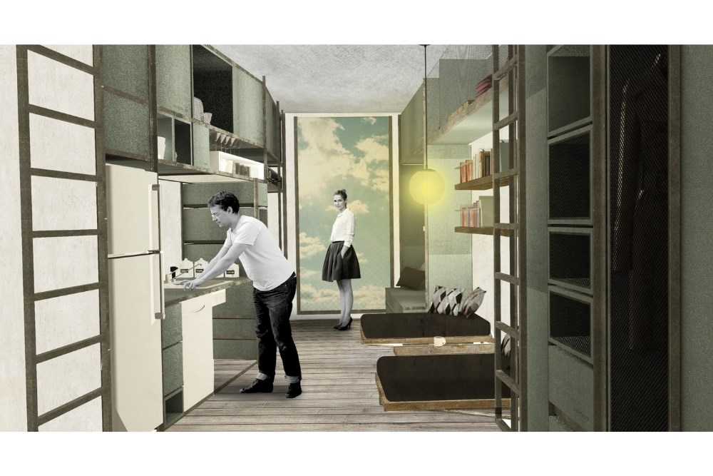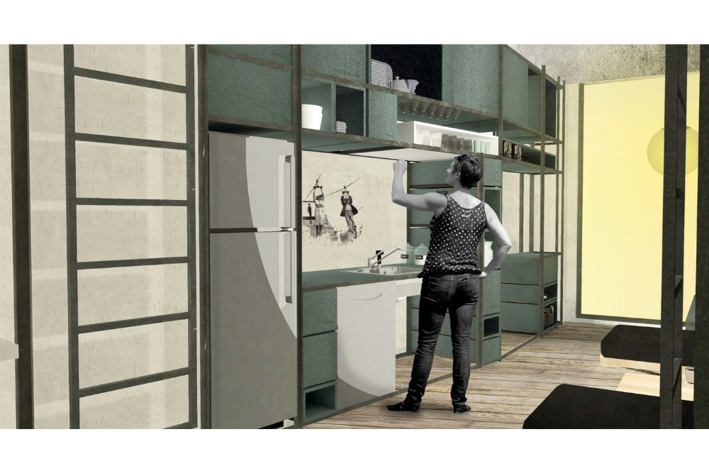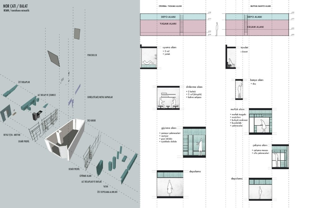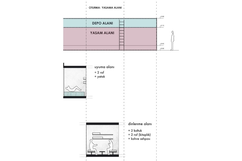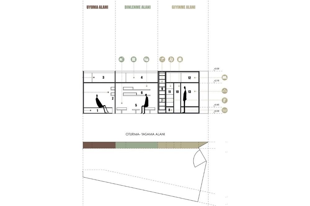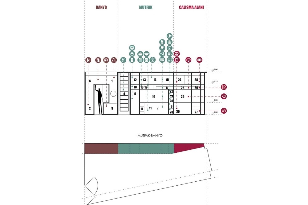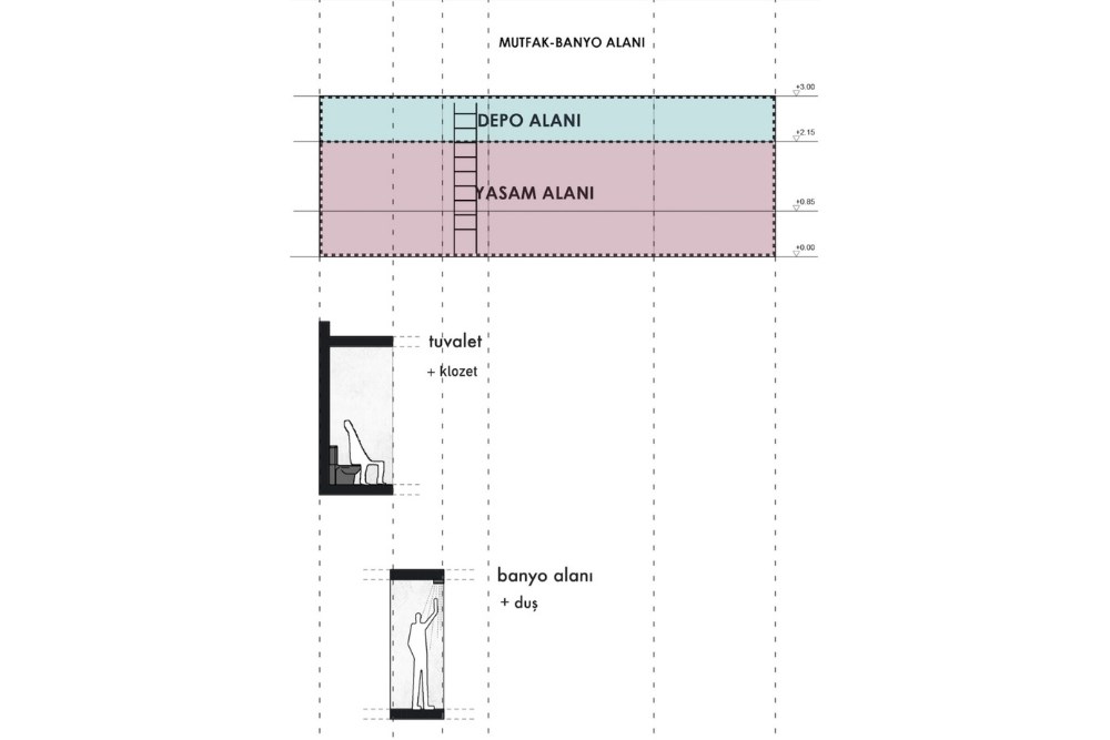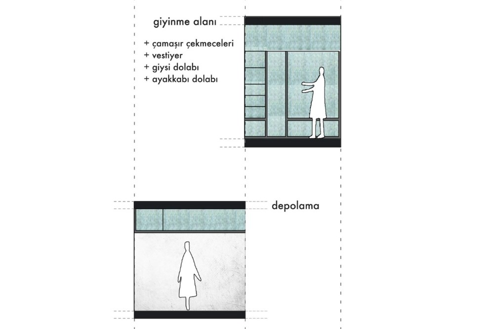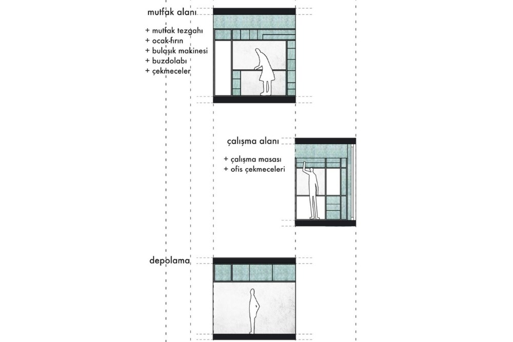 Bu bağlamda; modüler mobilyalarla doludan boşa dönüşebilen alan kullanımları sağlanmıştır. 8.70 m uzunluğunda ve 4.15 m’den 2.50 m’ye düşen dikdörtgen planda, doğu cephesine ıslak hacimler, batı cephesine ise uyuma, dinlenme giyinme fonksiyonları yerleştirilmiştir. Bu tip mikro ölçekteki evler için çözülmesi gereken önemli bir ihtiyaç olarak ortaya çıkan depolama sorunu, daire hacminin üst kısımlarının bu amaçla kullanılmasıyla çözülmüştür.