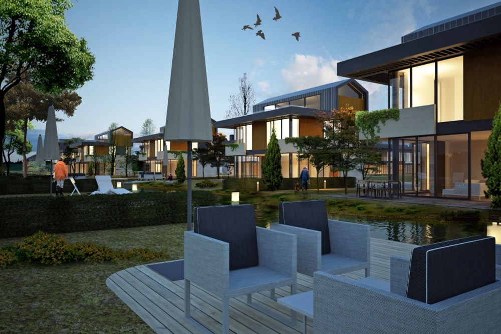 Ömerli’de uzun kenarı Riva deresine komşu, yeşille içiçe arazide inşa edilecek 170 haneli konut projesi tasarlandı. Arazinin orta bölümüne bir biyolojik gölet yerleştirilerek tasarım bu ögenin etrafında şekillendi 5 tip olarak üretilen ikiz ve sıra binalar, aslında üst üste olmasına rağmen her biri müstakil villaymış hissi verecek şekilde tasarlandı.Araçlar yapıların alt katlarındaki bu kapalı otoparklara gizlendi, yapıların üstünde kalan açık bölümler ise misafirlere yani geçici araçlara tahsis edilecek şekilde planlanarak araç yükü hafifletildi.