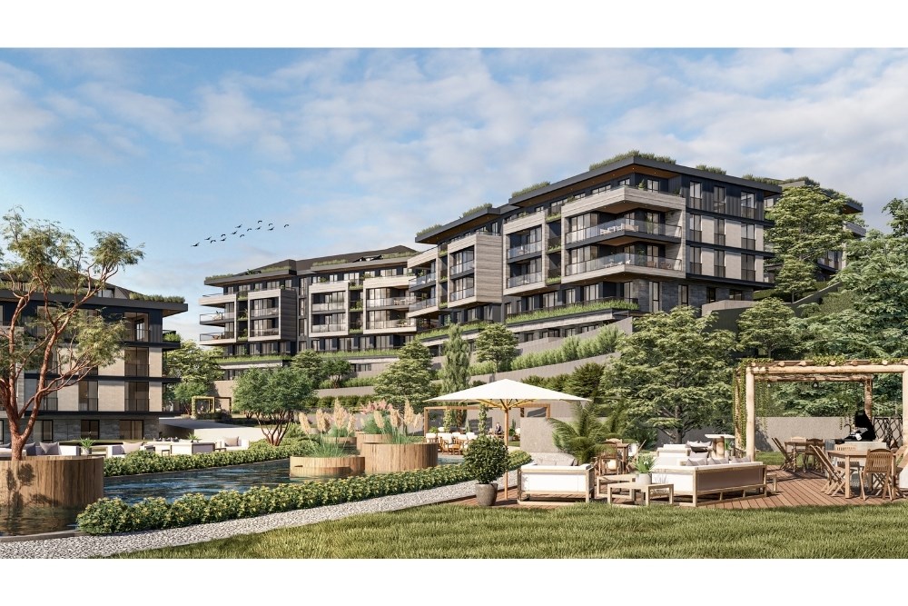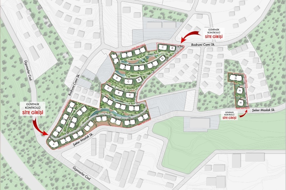 Vaziyet planında sürdürülebilirlik ilkeleri önceliklendirilmiştir. Arazinin doğal topografik yapısı bozulmadan, eğimden maksimum düzeyde yararlanılarak oturum alanları dikkatle yerleştirilmiştir. Bu sayede projede hem doğayla uyum sağlanmış hem de geniş peyzaj alanlarına yer verilerek yeşil alanlar ve ortak kullanım alanları oluşturulmuştur. Proje, sakinlerine doğal bir ortamda, modern bir yaşam sunarken aynı zamanda çevre dostu bir yaklaşım sergilemektedir.
