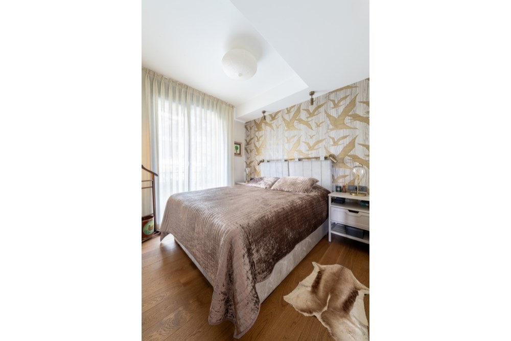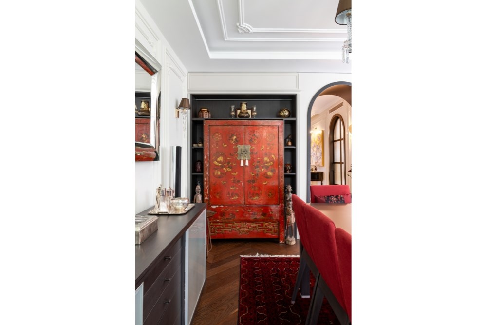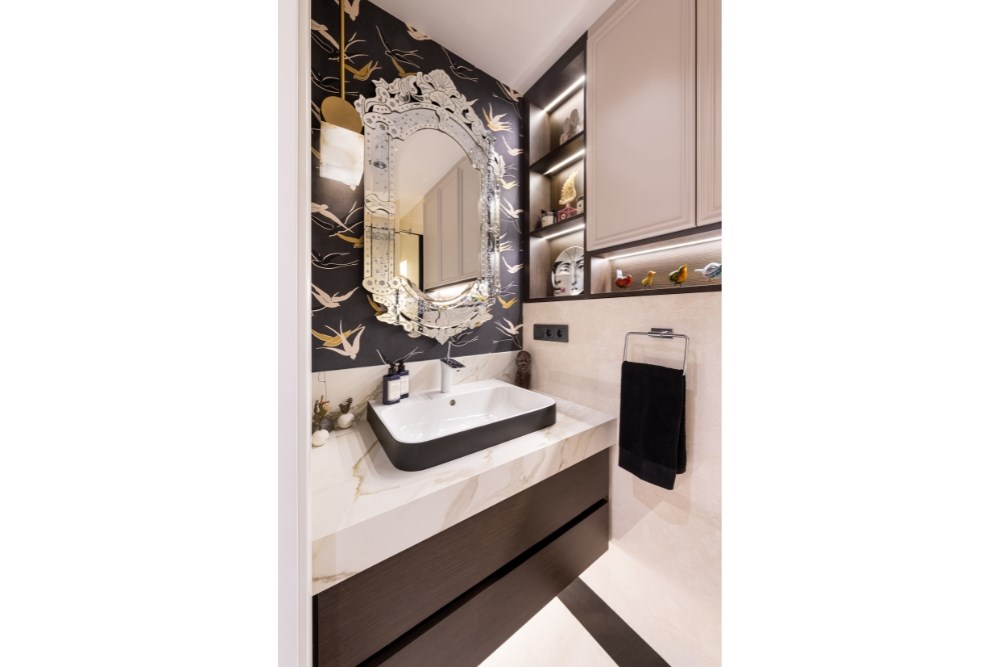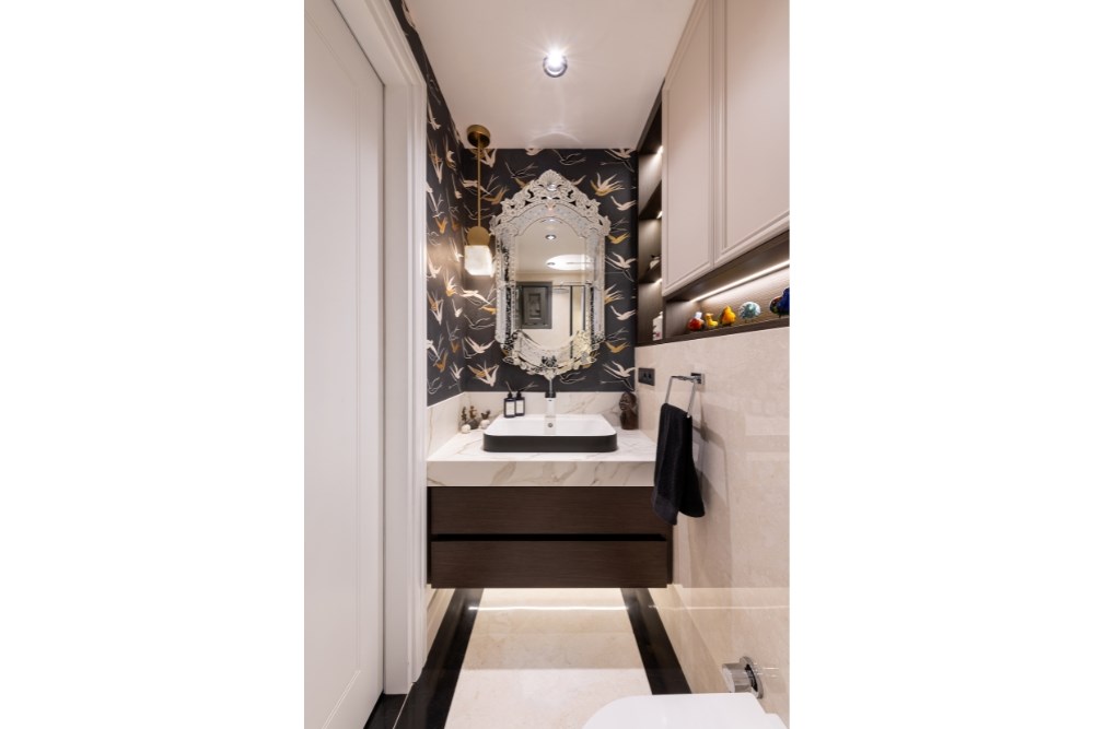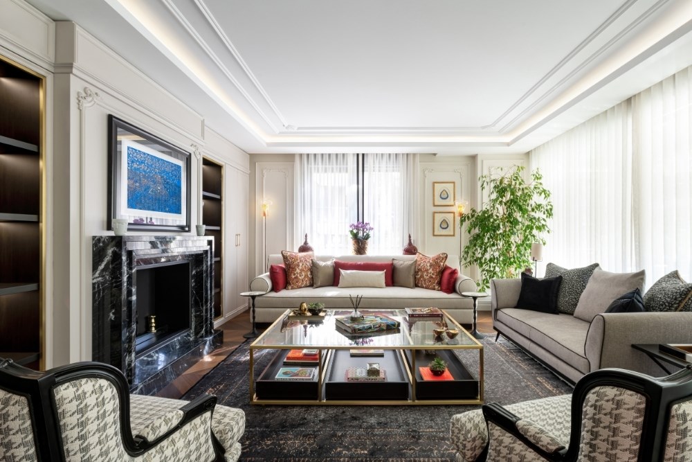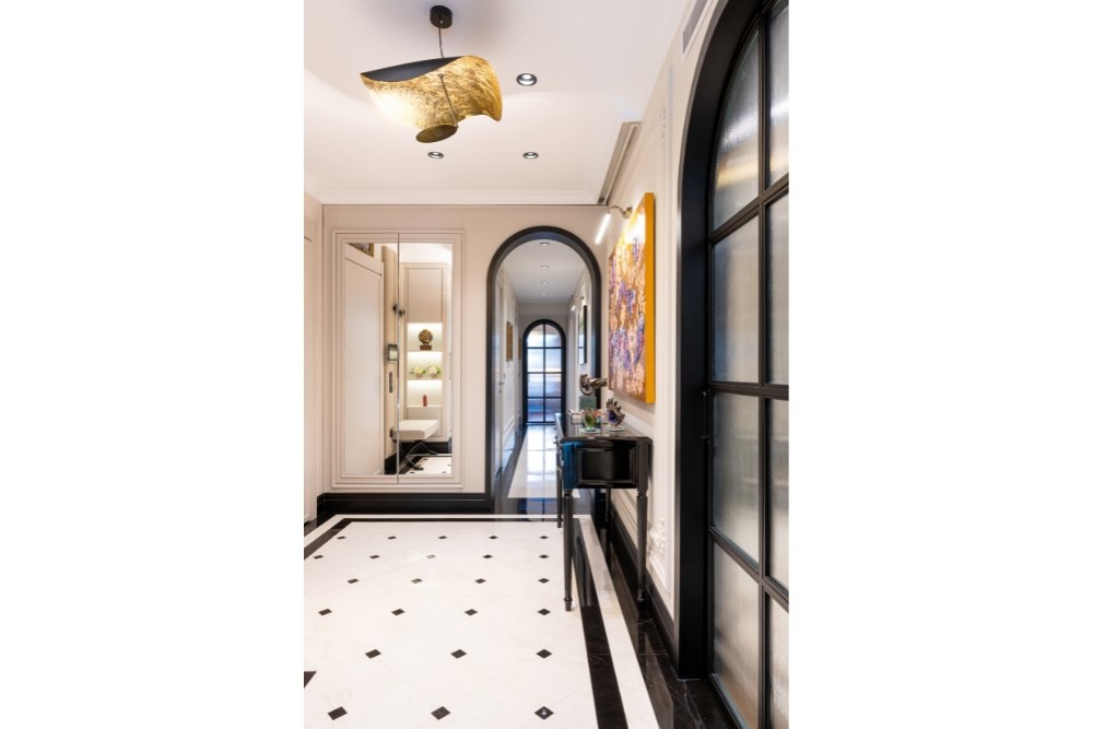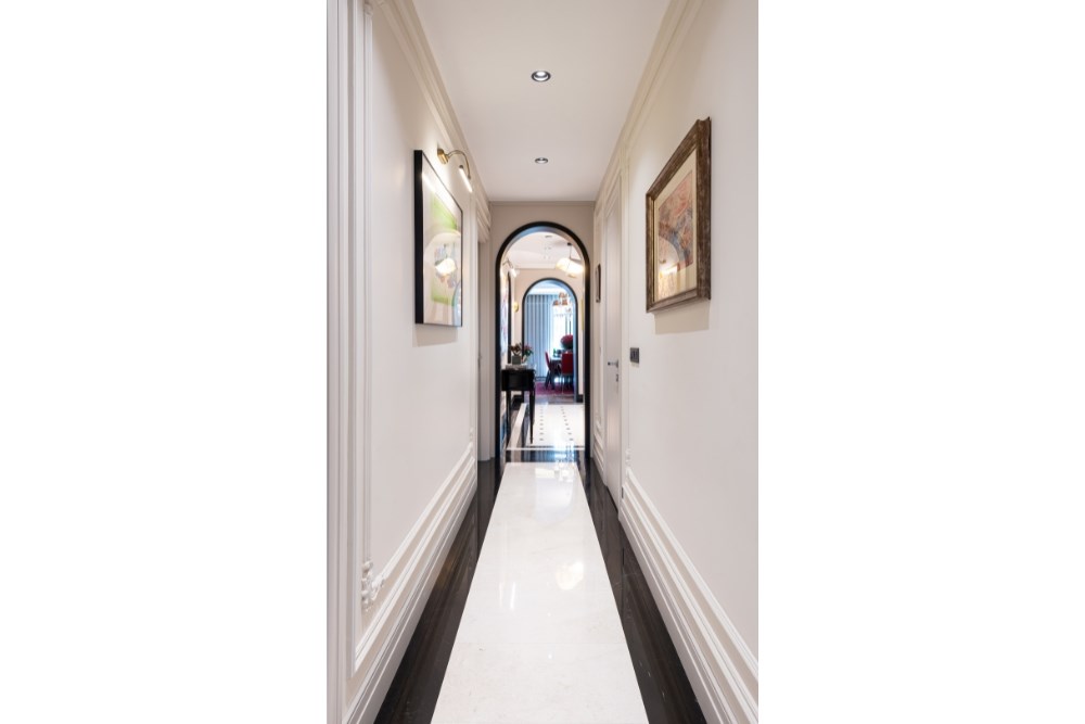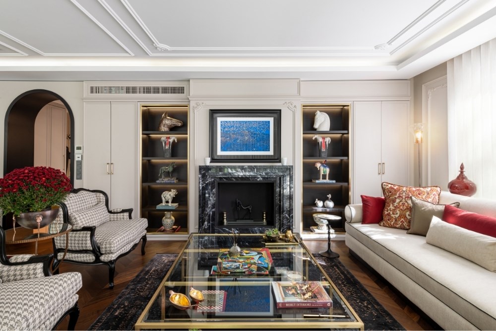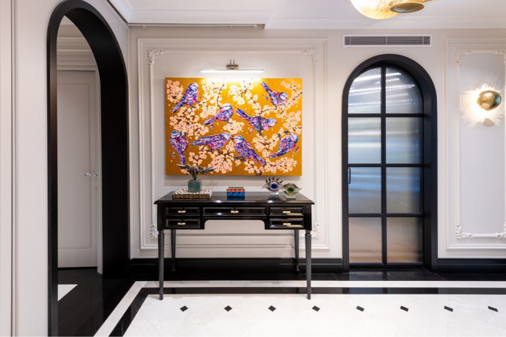 Sanat eserlerinin büyük bir kısmı, yıllar içinde ziyaret edilen ülkelerden, galeri ve sergilerden özenle seçilmiş çalışmalardan oluşmaktadır. İlk etapta bu eserlerin tamamı proje kapsamında değerlendirilmiş; ancak bazı noktalarda istenen etkiyi yaratamadığı için, yeni seçkilere yer verilmiştir. Örneğin giriş koridorunda kullanılan mermer zemin, siyah kapılar ve duvar çıtalarıyla siyah-beyazın zarif uyumu yakalanmış; bu dingin kompozisyonu dengeleyecek ve enerji katacak bir sanat eseri arayışı doğmuştur. Bu doğrultuda Mira Oran’ın “Bird Paradise” adlı eseri, kuşların enerjisi ve çiçeklerin yarattığı mutluluk hissiyle mekâna özel olarak seçilmiştir.