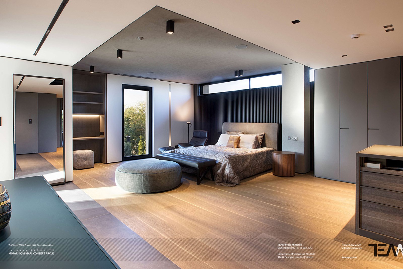 Cephe tasarımındaki beyaz ve antrasitin dengeli kullanımının yanı sıra cephe açıklıklarını kaplayan yekpare geniş cam yüzeylerle çatı kaplamasının yarattığı harmonik kontrast, projeye dingin ve özgün bir hava kazandırır. Kütlelerin sahip olduğu keskin ve yalın anlatım, iç mekanın tasarım yaklaşımında da kendini hissettirmektedir. Bu noktada, iç mimari tasarım dili ile mimari dilin uyumluluğu önemli bir unsur olarak karşımıza çıkar.
