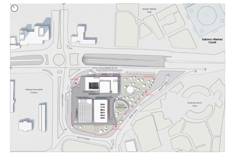 Günümüzde Hacı Ömer Sabancı Kültür Merkezi kuzey yönündeki kent merkezi ile ilişki kurmakta, güneyde tarihi kent merkezinden gelen yaklaşımla servis girişi dışında ilişki kurmamaktadır. Fuzuli Caddesi’ni takip ederek kuzeyden gelen yaklaşım Hacı Ömer Sabancı Kültür Merkezi’ne kavuştuğunda kuzeyden güneye giden ilişki adeta sonlanmaktadır. Yeni tasarımın bu ilişkinin sürekliliğine katkı sunup sunamayacağı bir araştırma konusu olarak belirmektedir. Öte yandan, ihtiyaç programında belirtilmiş olan 400 kişilik tiyatro salonu ve 600 kişilik konser salonu, Adana İl Halk Kütüphanesi’nin gereklilikleri, bu gerekliliklerin yanı sıra korunması gereken ağaçların varlığı ve etaplama zorunluluğu bu ana fonksiyonların arazideki yerleşimini vaaz etmekte, tasarımın değişmez kararları haline getirmektedir. Yeni kültür merkezi fonksiyon alanlarının değişmez konumlarına karşın, çevresiyle her yönden karşılamaya uygun ilişkiler kurmakta, mevcutta tanımlanmış olan sorunu aşmaya çalışmaktadır. Kütüphane yetkilileri tarafından daha çok dolmuşlarla ulaşım sağladığı bildirilen kullanıcılar duraklara en yakın noktadan kütüphaneye girebilecekken, konser ve tiyatro da daha çok kuzey yönünden geldiği bildirilen kullanıcısını karşılayabilecektir.