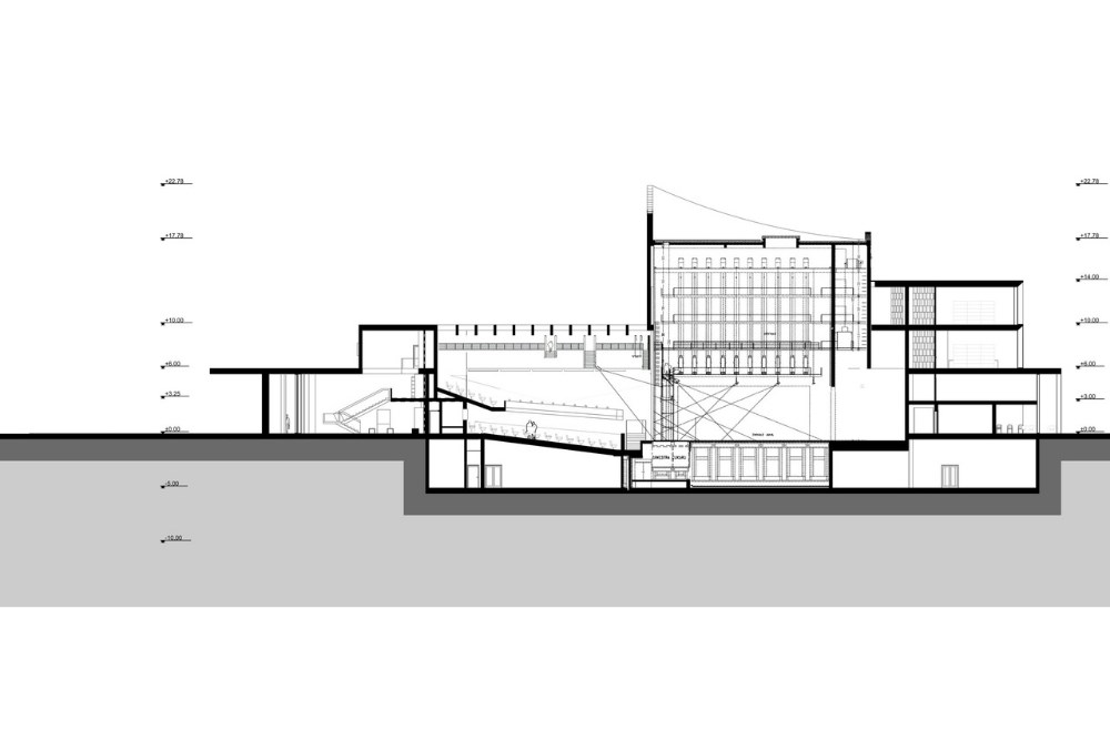 Kompleksin ana kurgusu tiyatro salonu, konser salonu, kütüphane ve bu alanları birbirine bağlayan fuaye/dolaşım alanlarından oluşmaktadır. Fuzuli Caddesi’ndeki ana girişten bir sokak niteliğindeki dolaşım aracılığıyla arka bahçeye ulaşılmaktadır. Karşılama, vestiyer, ıslak hacimler, büfe gibi bir salon fuayesinde ihtiyaç duyulacak alanların yanı sıra, küçük etkinlik alanı, sergi, kafeterya, hediyelik eşya mağazası gibi alanlar bir sokak gibi bu dolaşım alanında yer almaktadır. Dolaşım alanına/sokağa doğal ışık çatı ve cephelerden kontrollü biçimde alınmakta ancak Adana’nın yakıcı güneşinin etkileri bertaraf edilmektedir. Kompleks içinden ulaşılabildiği gibi, güney yönünden de giriş alabilen kütüphane 7/24 kullanıma ve ayrıca etaplamaya uygun biçimde konumlandırılmıştır. Ana fikir arazi kullanımına uygun biçimde birbirlerine yakın duran salonlar ve kütüphanenin yer yer derin güneş kırıcı görevi üstlenen, yer yer sınır oluşturan, değişken derinlik ve açılarda geçirgen bir çeper ile kuşatılmasıdır. Mevcut ağaçları olabildiğince korumak prensibi kütüphanenin taban alanını kısıtlamakta ve üst süte gelen katlar fazlaca iri bir kitle oluşturmaktadır. Bu nedenle çocuk kütüphanesi kütüphane içinde sıkışık bir alanda kaldığı ve zeminle ilişkisi tercih edileceği için peyzaj alanı içine taşınmıştır.
