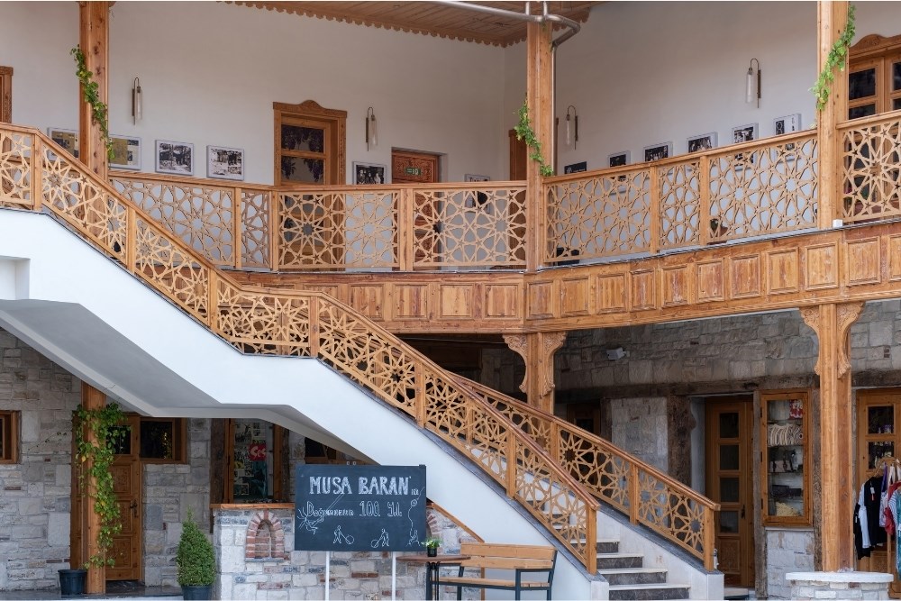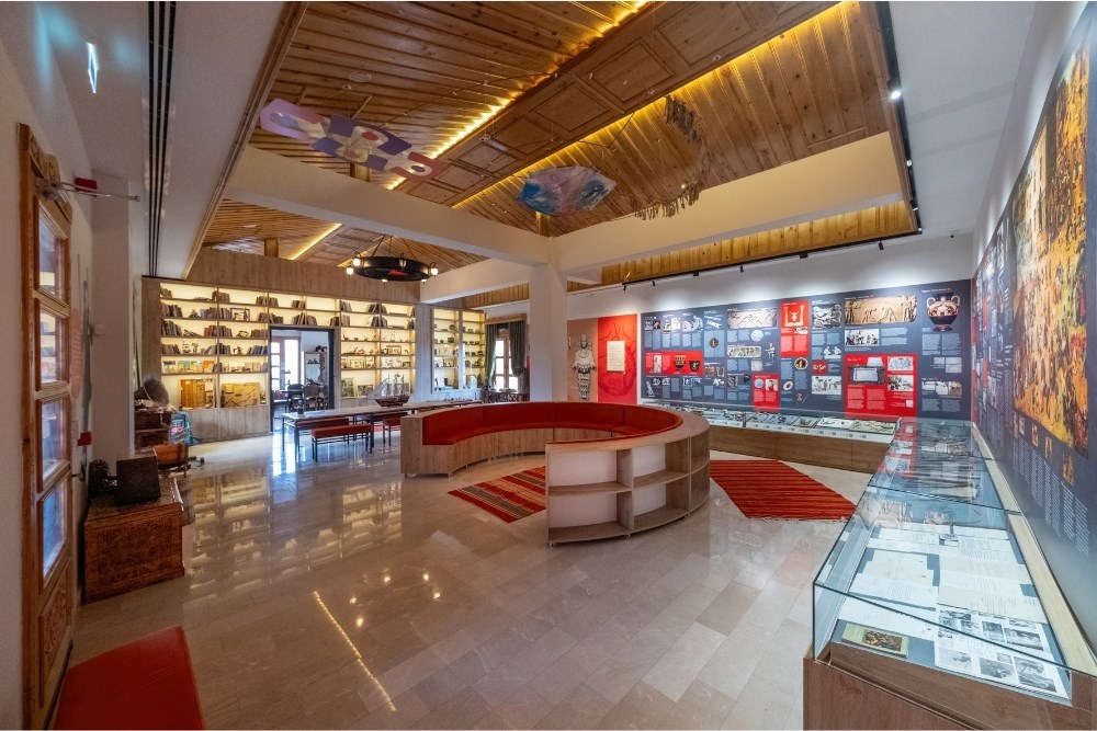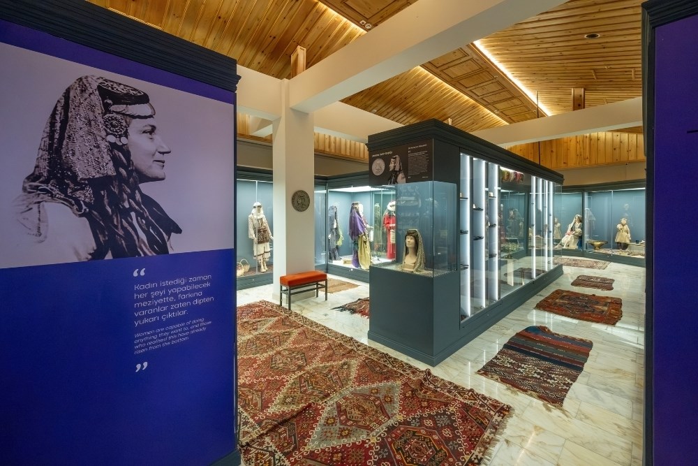 Müze, birinci kattaki girişinden iki yöne doğru avluya inen merdivenleriyle, Türk tarihinin zengin içeriğinden ilham alan motifli korkuluklarıyla ve avlusuyla ziyaretçilerini kucaklamaktadır. Geleneksel Türk Evi’nden esinlenerek tasarlanan yapıda, avlu geniş ve ferah bir açık alan olarak düzenlenmiştir. Bu alan, ziyaretçilerin rahatça dolaşabilmesini sağlarken, doğal ışık ve hava sirkülasyonuyla da ferah bir atmosfer yaratır. Avluda kullanılan malzemeler, sürdürülebilirlik ilkelerine uygun olarak seçilmiştir; zeminde yer alan Urla Taşı ve ahşap, çevre dostu bir tasarım anlayışını yansıtır.