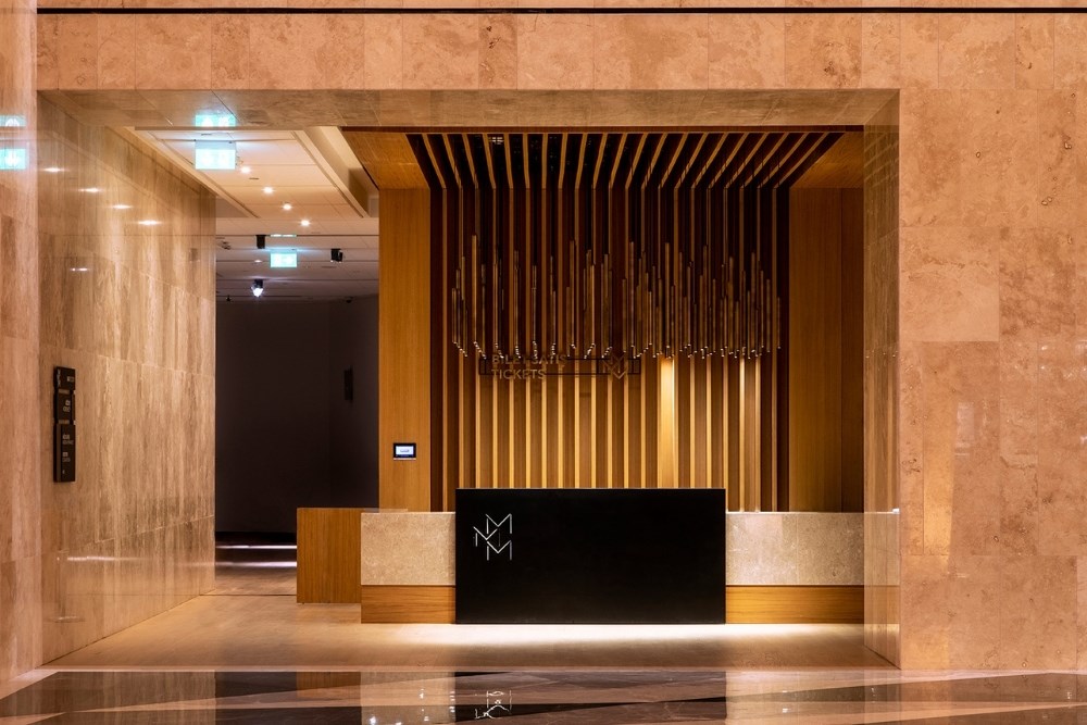 Giriş holünün çeper yüzeylerinde ise doğal taş kullanılarak Hayat Ağacı ile uyumlu doğal bir görünüm ve deneyim hedeflenmiştir. Temsil bölümünde ise sergide yer alan çok kıymetli ve özellikli eserlerin önemi dolayısıyla zemin ve yüzeylerde malzeme olarak da farklılaştırma amaçlanmış ve silver grey mermer kullanılmıştır. Biletleme alanı, kafe ve mağaza bölümlerindeki sabit mobilyalarda ise doğal ahşap (meşe) ve doğal taş tercih edilmiş, detaylarda ise pirinç kullanılmıştır. İslam medeniyetindeki çini sanatının önemine atfen müzenin sosyal alanlarındaki duvarlarda el yapımı çiniler tercih edilmiştir. Girişte yer alan logo kaidesinin arka duvarı ise müzenin logosundaki geometriden esinlenilerek bu alana özel bir rölyef şeklinde tasarlanmış ve el yapımı yeşil renk çini ile örülmüştür.