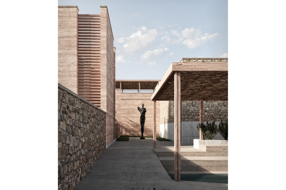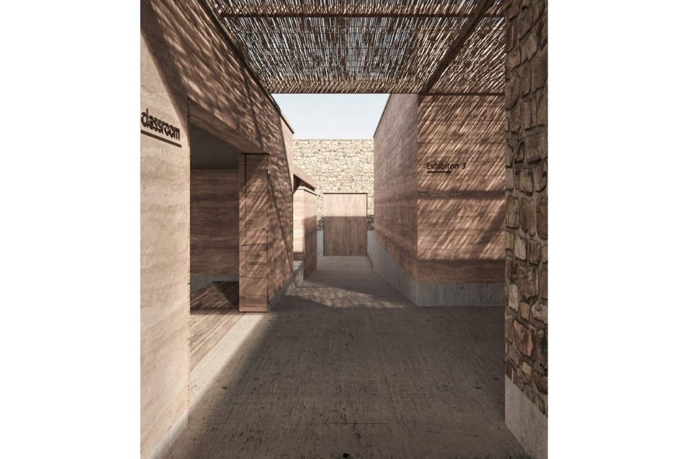 Tüm kompleks, alçak ve doğrusal bir siluetle tanımlanmış; bu sayede yapı doğal topoğrafya içinde geri planda kalır. Taş, sıkıştırılmış toprak ve dokulu beton gibi malzemeler, bölgenin toprak tonlarına referans verirken; pasif tasarım stratejileri, zorlu iklim koşullarına geniş saçaklar, gölgeli revaklar ve termal kütle kullanımıyla yanıt verir.