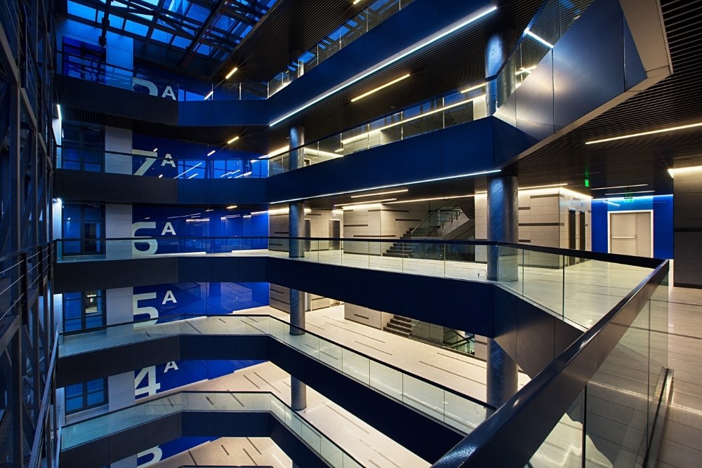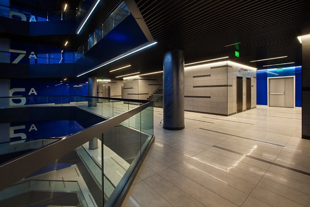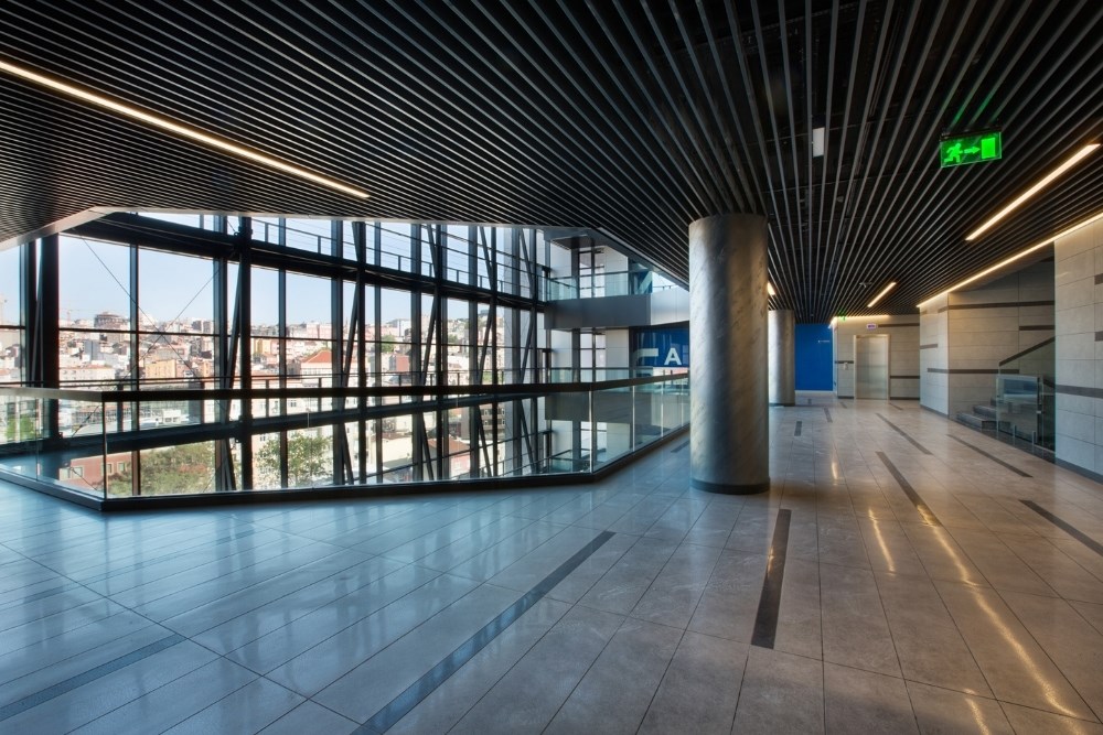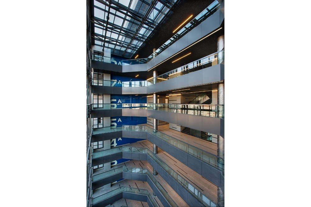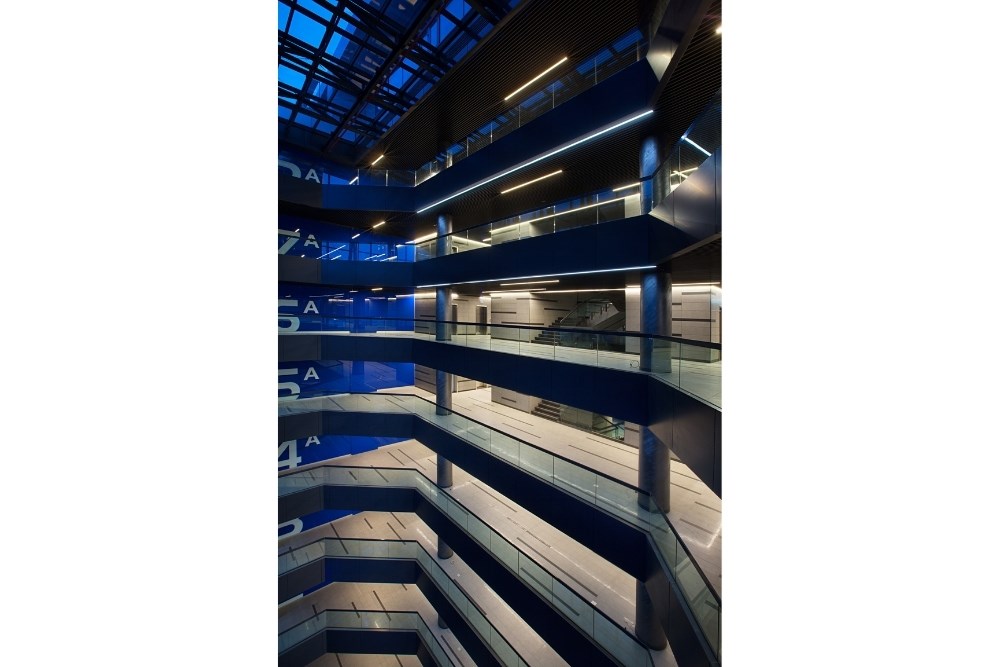 Orta blok geniş ve 40m yüksekliğinde, saydam cam cephe ile örtülü bir atrium çevresinde planlanarak aydınlık ve çevre ile maksimum görsel ilişki sağlayan bir dolaşım hacmi yaratılmıştır.