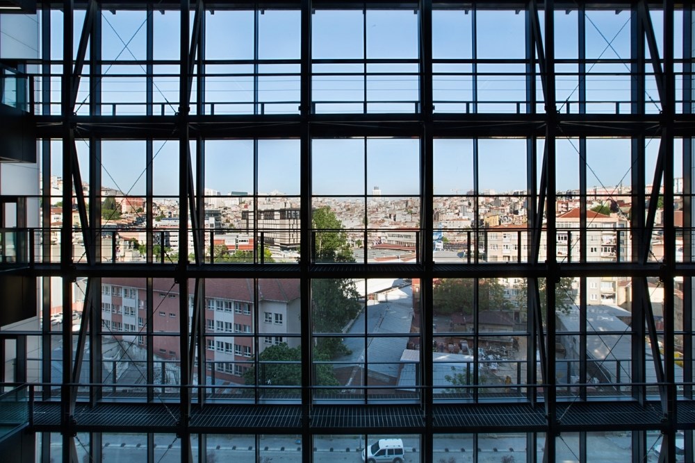 Yapı kabuğu güneş ışığı ve manzara bakımından farklılıkları malzeme, değişik doku ve geçirgenlikler ile ayrışarak vurgulayan yüzeyler ile oluşturulmuştur. Bu anlamda mevcut yoğun yapılaşmaya bakan ve sert güneş ışını alan batı cephesi, bant pencere boşluklarının açıldığı dolu bir yüzey, Haliç manzarası ve Yeni Yol Sokağa bakan güney ve doğu cepheleri ile süzülmüş gün ışığı alan kuzey cephesi ise saydam yüzeyler olarak tasarlanmıştır.