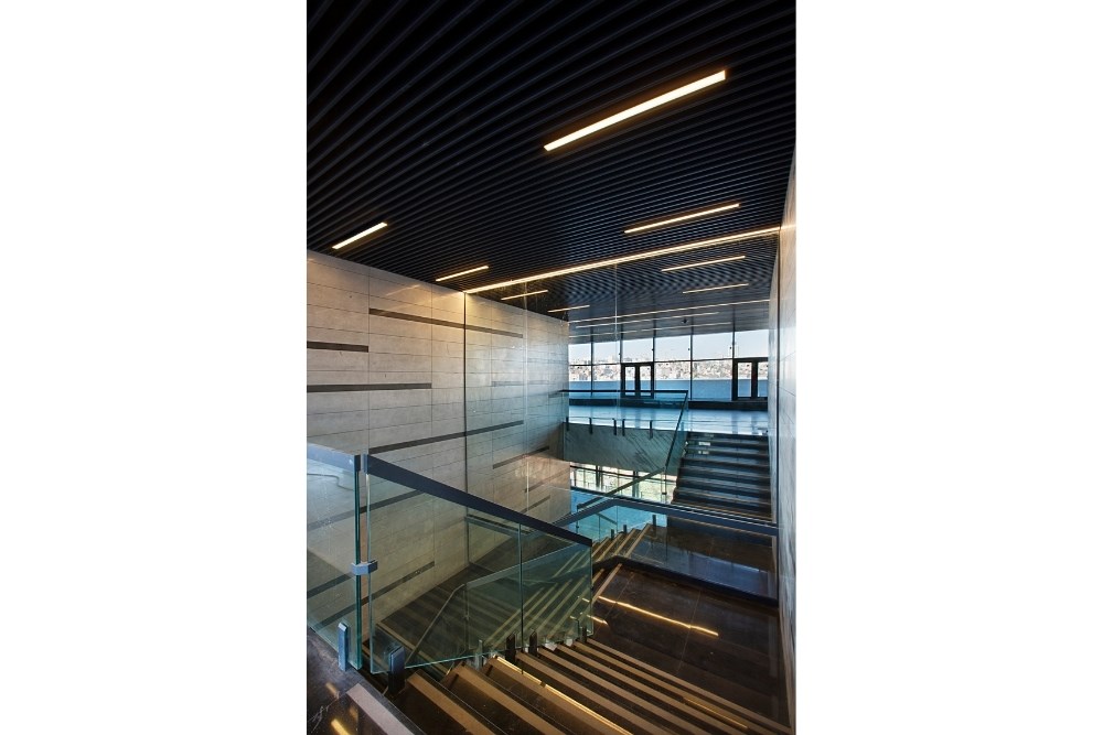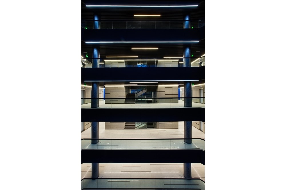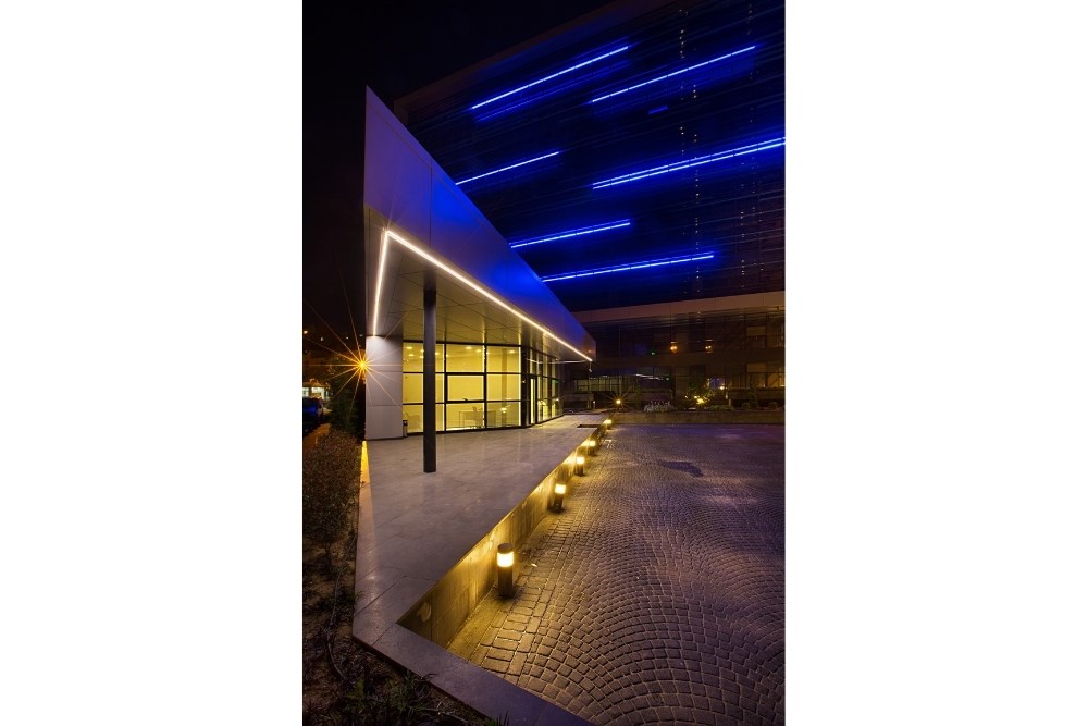 Giydirme cephelerin önünde, güneş ışığının yönüne göre yoğunluğu artıp azalarak yapıyı saran, böylelikle yaz aylarında iç mekanlarda istenmeyen aşırı ısınma ve parlamayı önlerken aynı zamanda vinç, lift gibi sistemlere gerek olmadan cephe bakımına olanak sağlayan bir güneş kırıcı katman oluşturulmuştur.