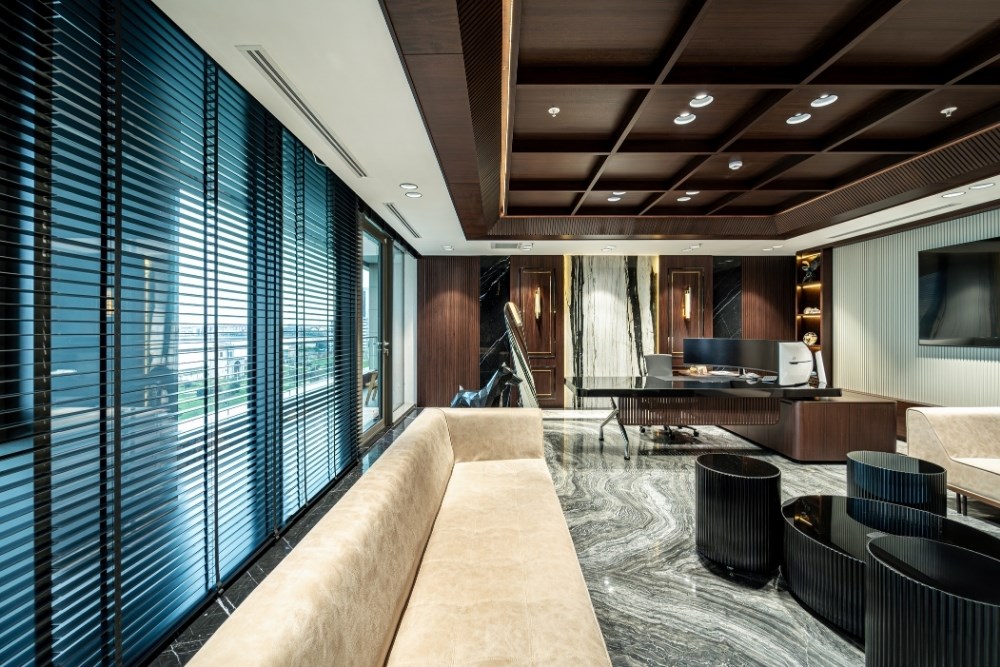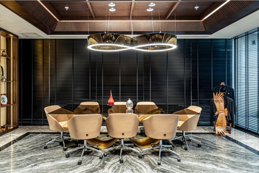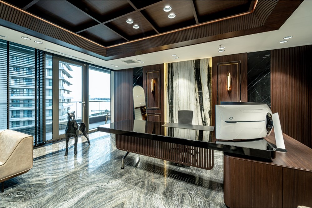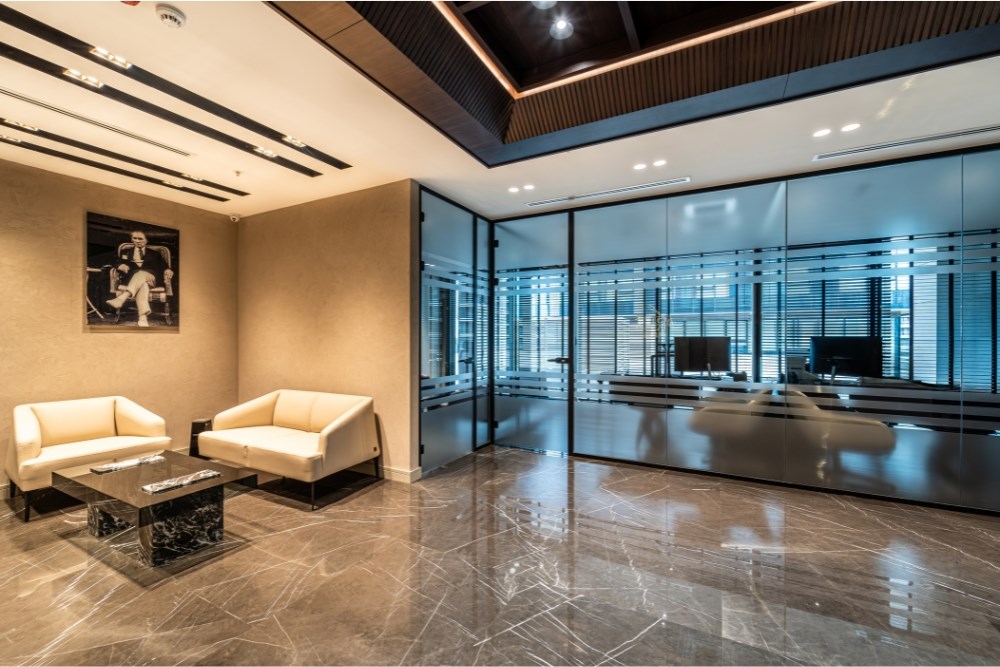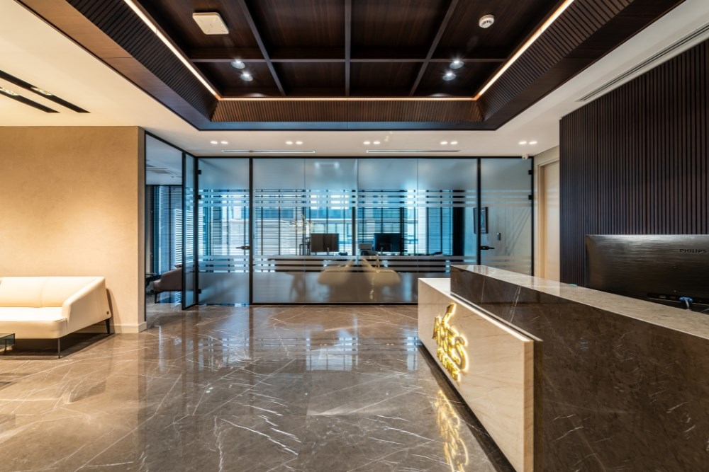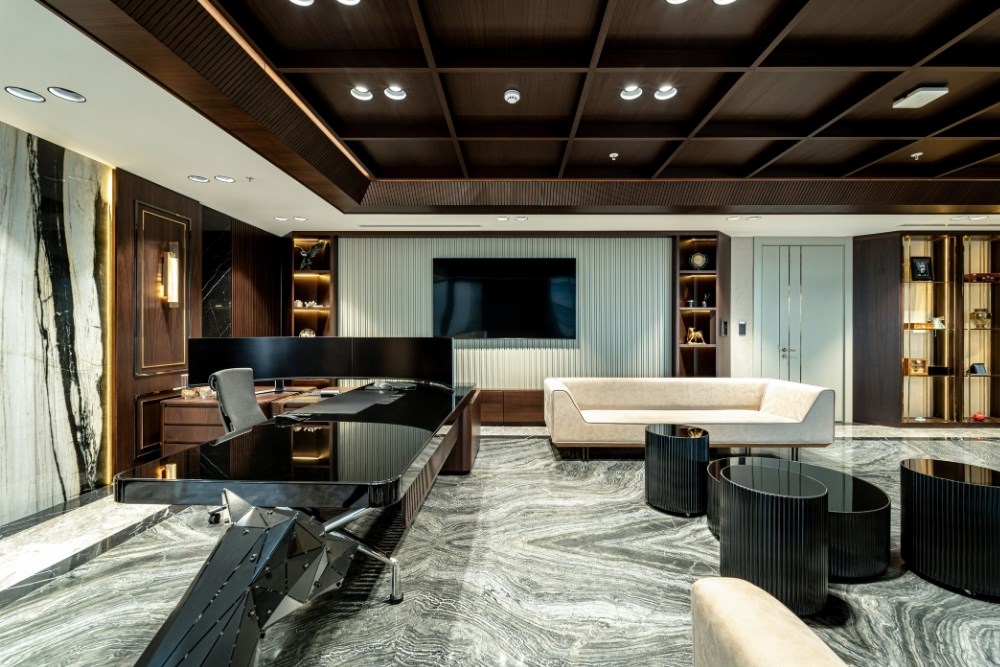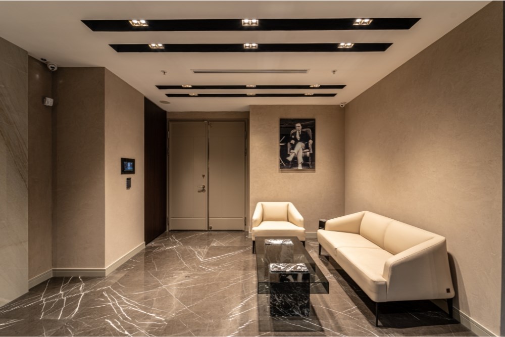 Finans sektöründe faaliyet gösteren kurumsal bir firma için yönetim ofisi tasarlandı. Kullanılan doğal ve rafine malzemelerle hem prestijli hem de zamansız bir atmosfer oluşturulması hedeflendi. Mekânsal kurguda işlevsellik ve temsil gücü ön planda tutulurken, detaylardaki özenli seçimler ile şirketin kurumsal kimliği iç mekâna yansıtıldı. Gösterişli ama ölçülü bir ifade diliyle şekillenen tasarım, yöneticilerin ihtiyaçlarına yanıt veren, aynı zamanda çalışan deneyimini de gözeten bir çalışma ortamı sunmaktadır.