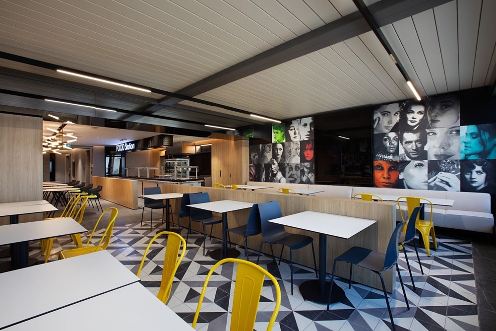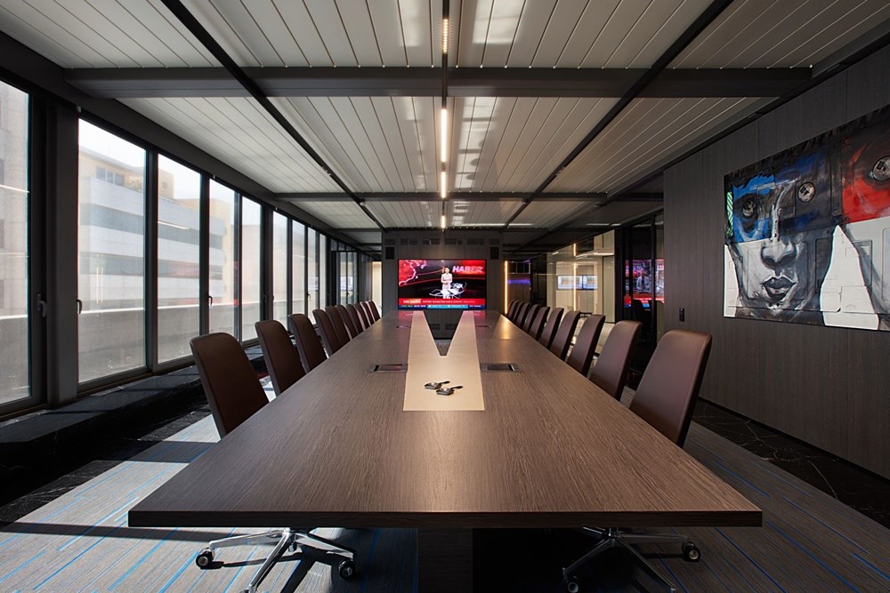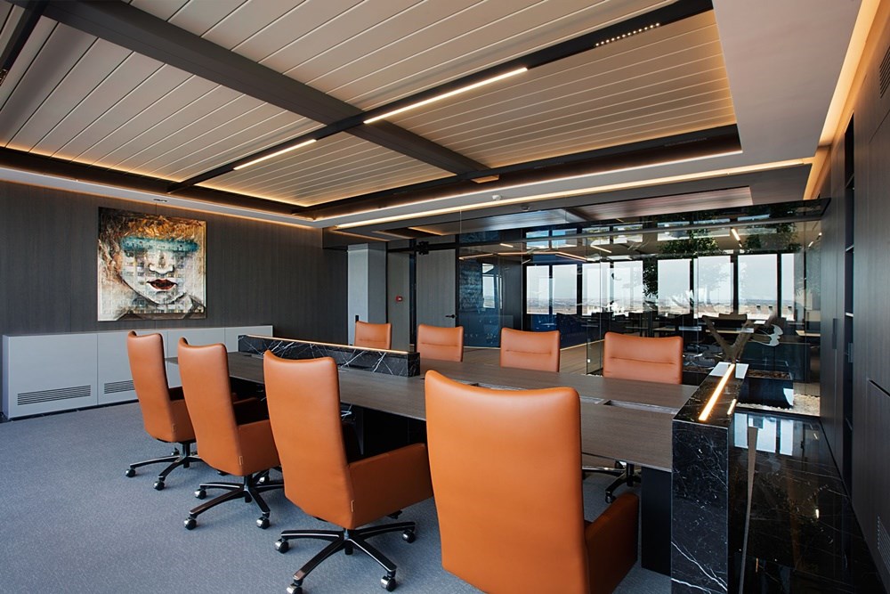 Malzeme seçiminde modern ve yüksek kaliteli unsurlar tercih edilerek teknoloji vurgusu güçlendirilmiştir. Cam bölücüler, yansıyan yüzeyler ve geometrik formlar, mekânın ferah ve geniş algılanmasını sağlarken, firmanın teknoloji ve inovasyon odaklı kimliğini yansıtmıştır. Modern aydınlatma elemanları, mekânın aydınlık ve ferah olmasını sağlamış, şık ve çağdaş bir görünüm sunmuştur.
