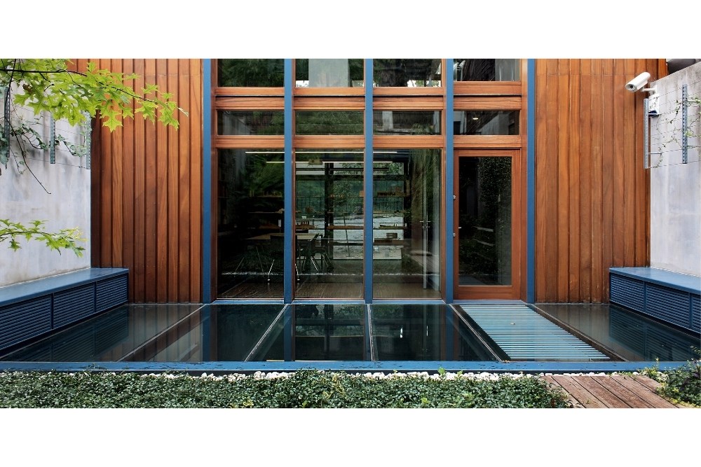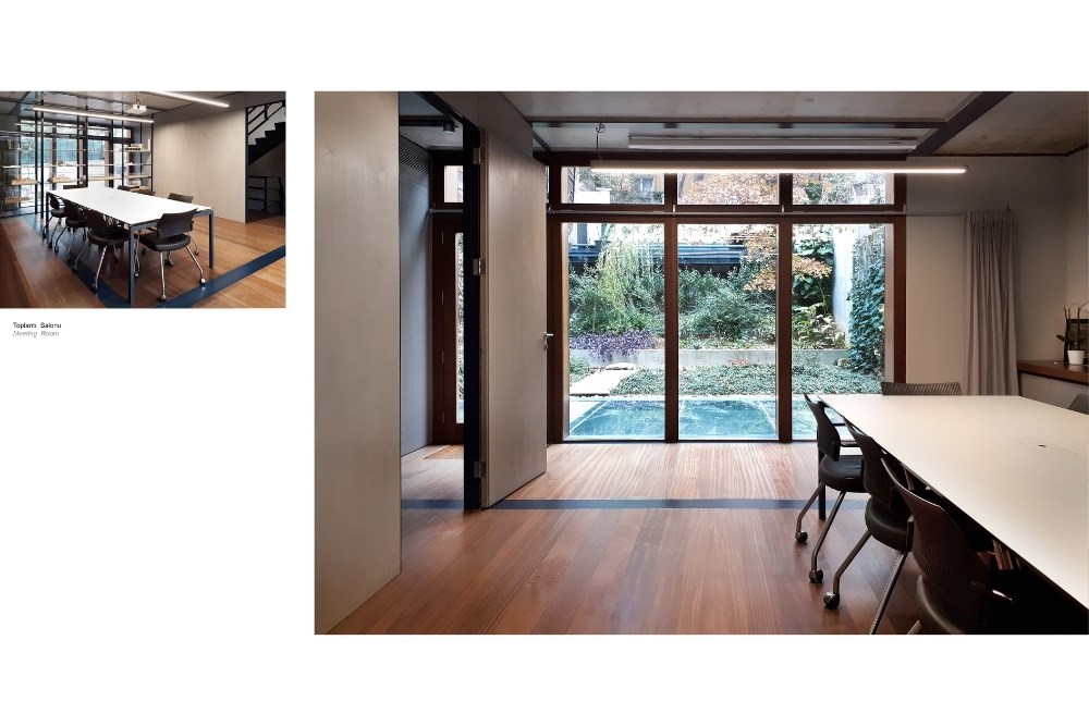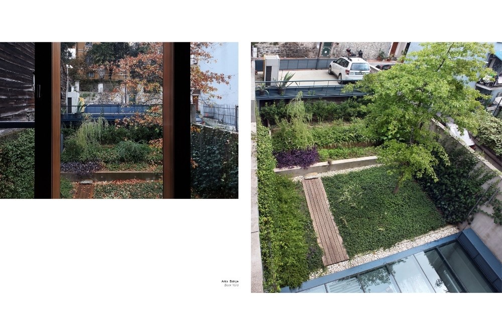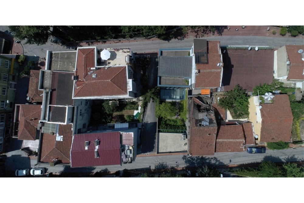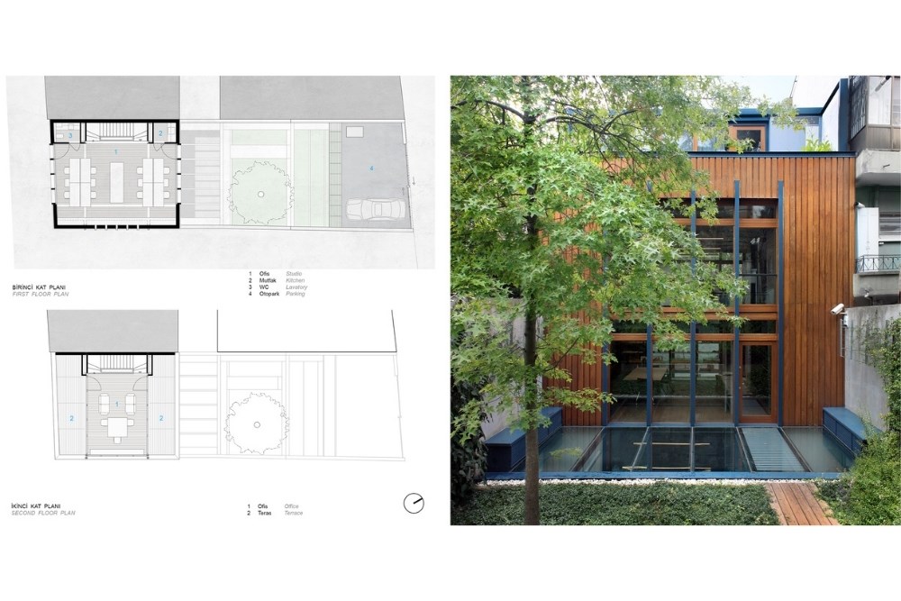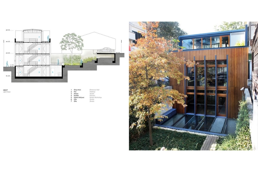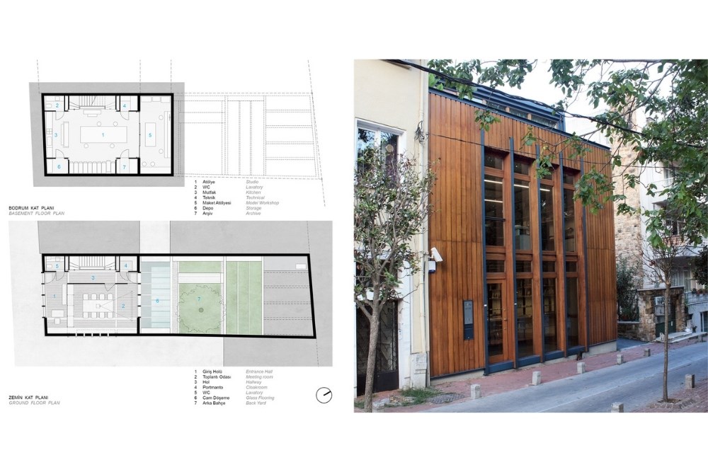 Mimarlık stüdyosu olarak yapılan bu binanın ön ve arka cephelerinde dikey pencereler ve tüm üç cephede dikey yerleştirilmiş masif ahşap kaplama uygulanmış; tarihi doku ile biçim ve malzeme olarak ilişki kurulmuştur. Böylece yapının ön ve arka cephelerinde üretilen transparanlık ile binaya ait bahçe yoldan görülmekte ve çevremizde hep özlediğimiz yeşil doku sergilenmektedir. Bahçenin iki yanındaki brüt beton duvarlar, bahçeye bitişik tek katlı harabe ahşap ev ile bir kontrast yaratmakta; yapının yan cephesindeki ahşap cephe kaplamaları arasında açılmış ışık yarıkları ile tasarım tamamlanmaktadır. Teras katındaki tek mekan ise yapının ön ve arka cephelerinden geri çekilmiş olup üç cephesi cam cephe olarak ana yapı kütlesinden kontrast sağlayarak kopmaktadır.