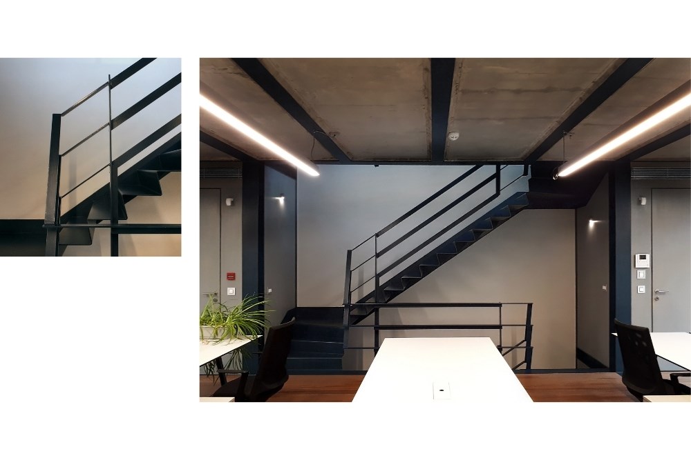 Yapıda kullanılan malzeme ve detaylar, bu proje için özel tasarlanıp üretilmiş, hazır hiçbir eleman kullanılmamıştır. Merdivenler kıvrılmış saç olup yapıda çelik ve betonarme taşıyıcı sistem izlenebilmektedir.