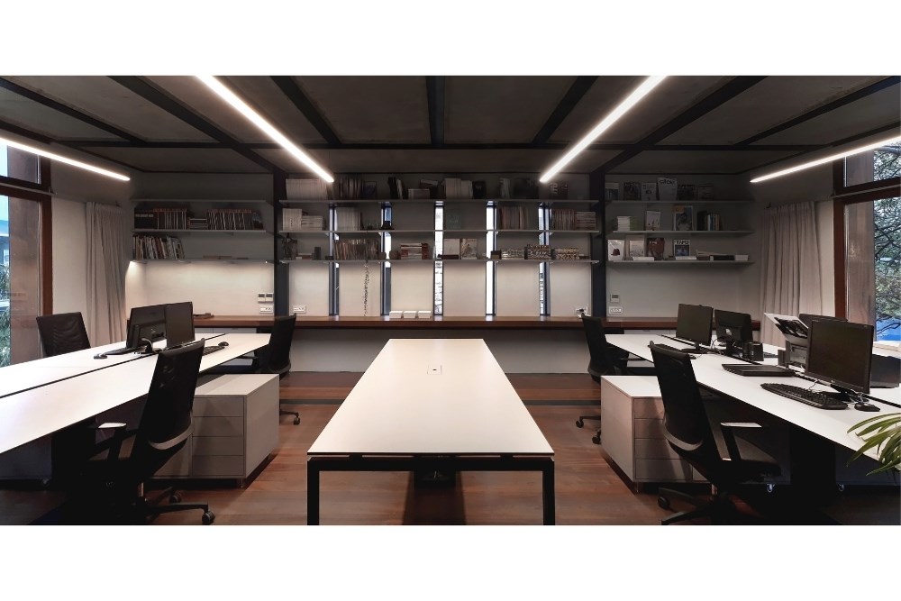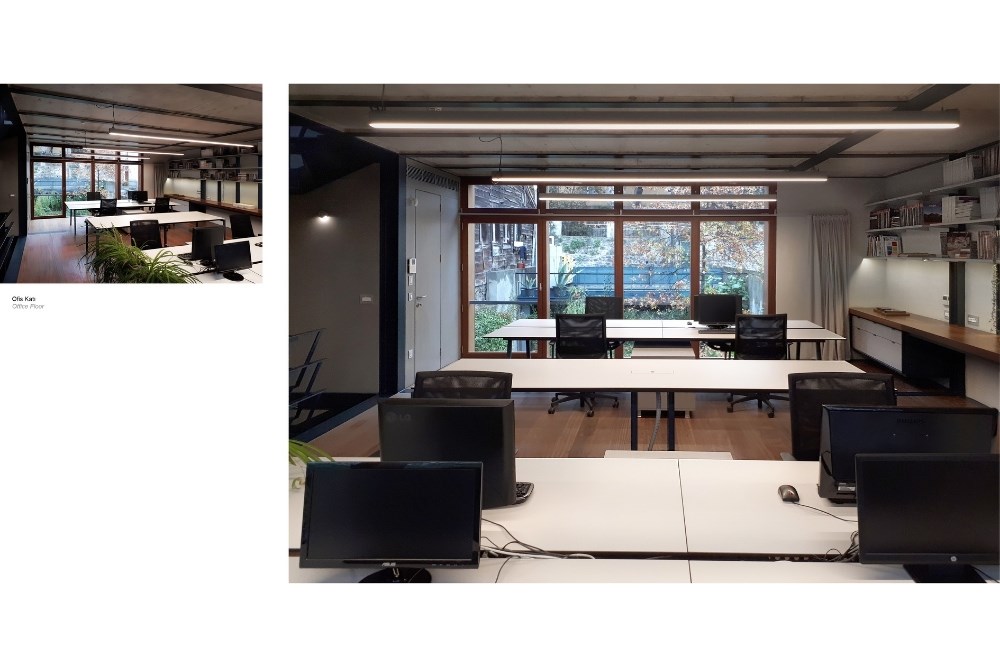 Bina içi tüm çalışma alanları genel mimari tasarımın bir parçası olarak tasarlanmıştır. Gardırop, WC gibi iç bölmeler, çelik karkas üzerine vidalanarak monte edilen su kontrası elemanlardan oluşmaktadır. Duvarlara monte edilmiş raflar çelik ve ahşap, özel üretim çalışma masaları kompakt laminattır. Islak hacimlerde tezgah üstleri yapay taş olup, yapıda seramik ve doğal taş kullanılmamıştır.