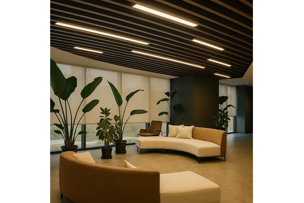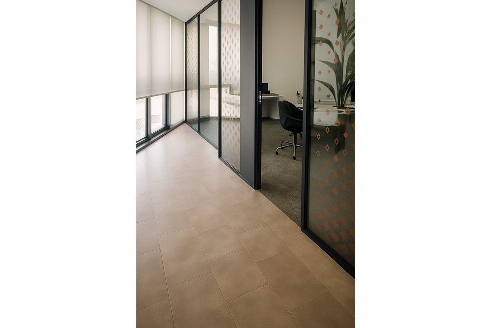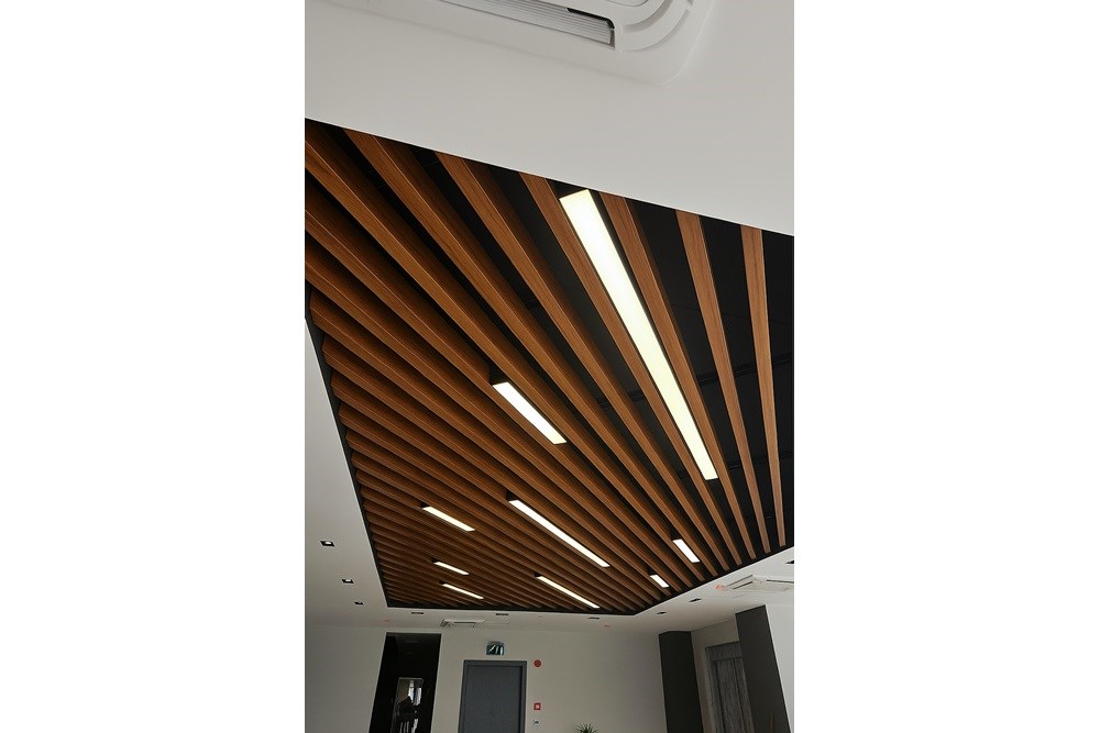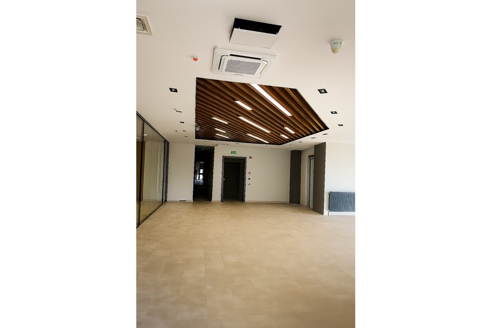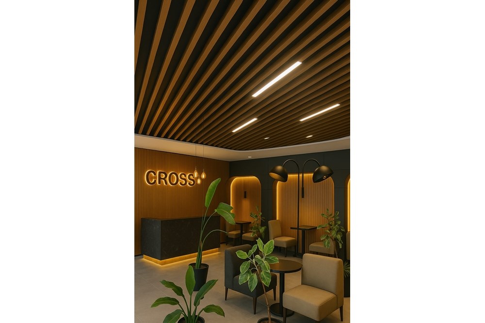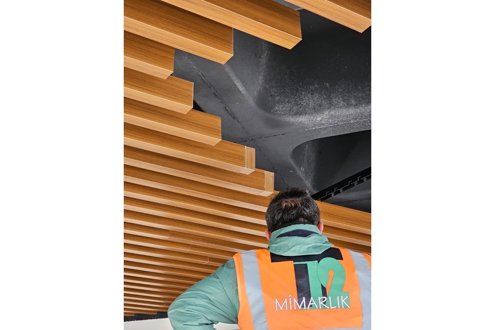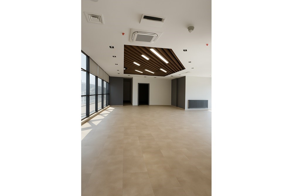 Cross Yapı Genel Müdürlük binasında modern ve fonksiyonel bir tasarım anlayışıyla T12 Mimarlık tarafından LVT zemin kaplamaları, karo halılar ve ahşap görünümlü metal baffle asma tavan sistemleri bir araya getirilmiştir. Bu entegre yaklaşım, estetik görünümü dayanıklılıkla birleştirerek yoğun kullanılan alanlar için ideal bir çözüm sunar. LVT'nin kolay bakımı ve suya dayanıklılığı ile karo halının ses yalıtımı ve konforu, ahşap görünümlü metal baffle tavanın sağladığı doğal dokunuş ve akustik performansla tamamlanmaktadır. Bu kombinasyon, mekanlara hem şıklık hem de pratiklik kazandırarak dinamik ve ileri görüşlü bir çalışma atmosferi yaratmaktadır.