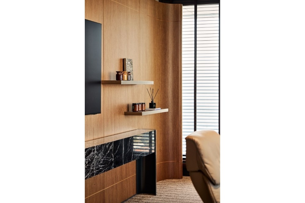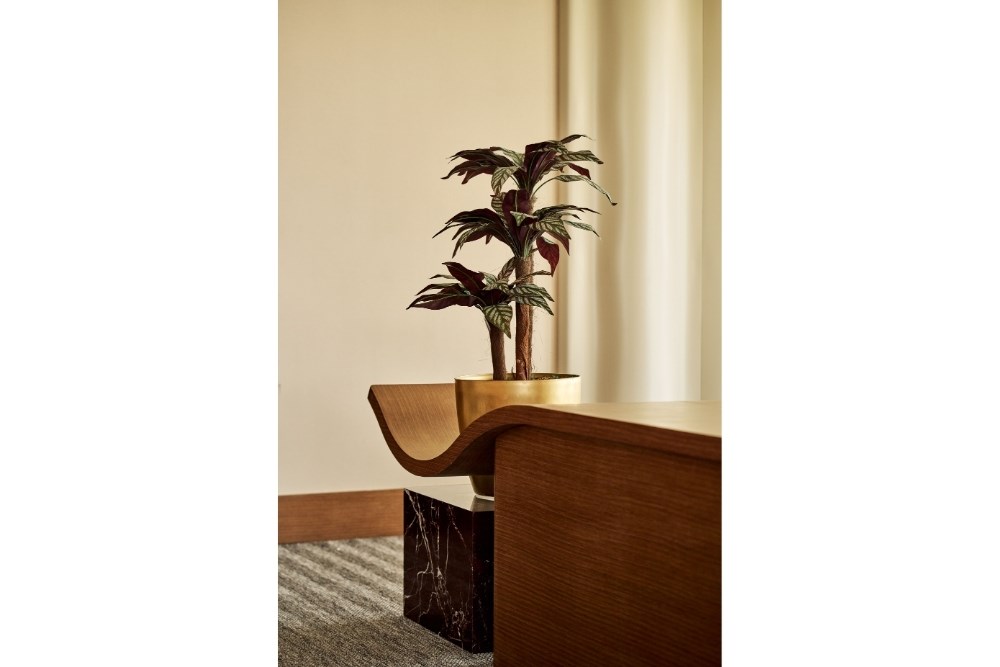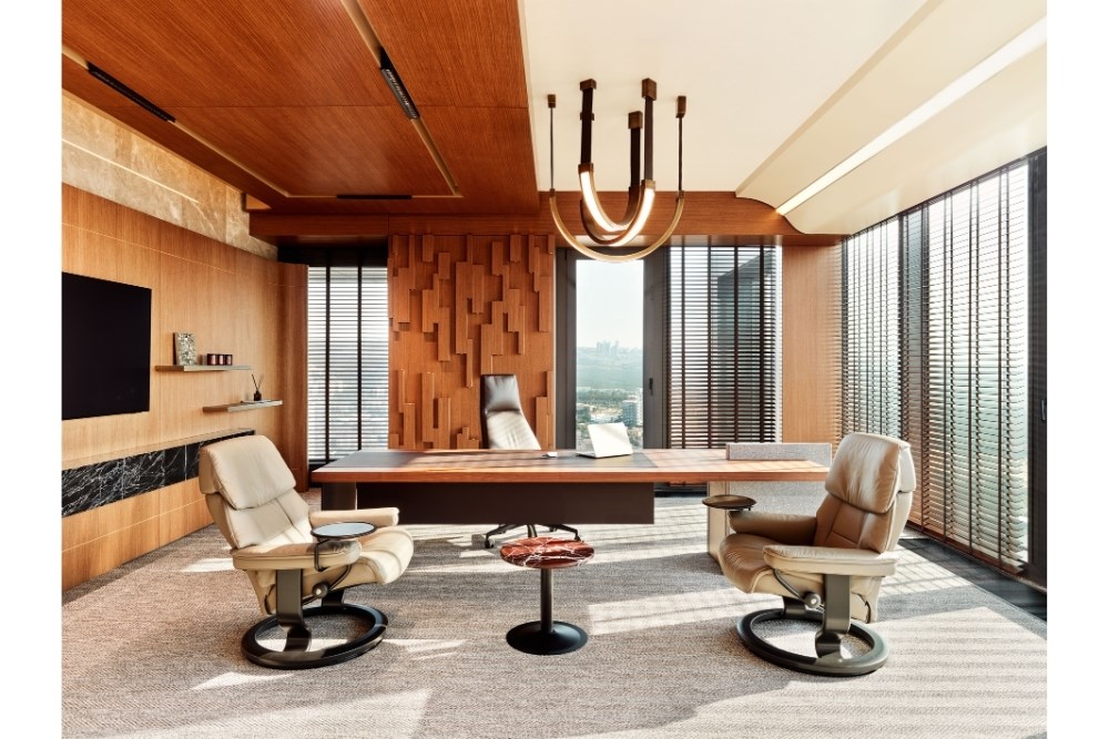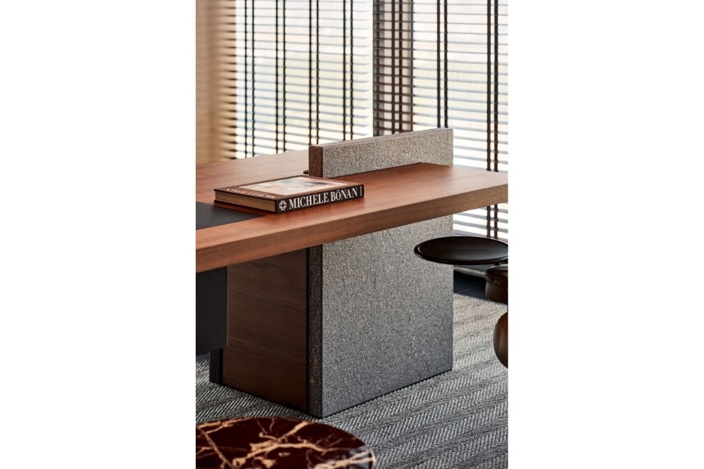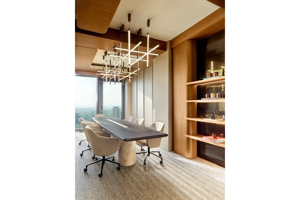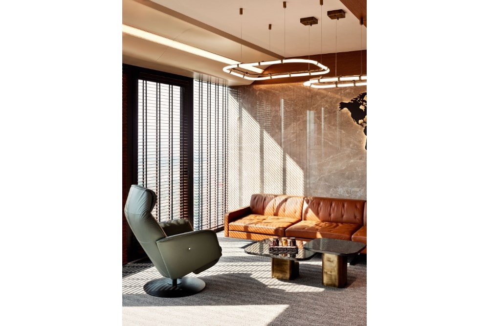 Projenin en lüks alanı olan makam odası, doğal mermer duvarlar ve ikonik mobilyalarla tasarlanmıştır. Bu alandaki gizli kapı, bir dinlenme odasına açılmaktadır. Toplantı odasında ise ayna, ahşap ve mermer gibi dokusal kontrastlar kullanılarak derinlikli bir atmosfer yaratılmıştır; özellikle traverten ayaklı doğal ahşap masa öne çıkmaktadır.