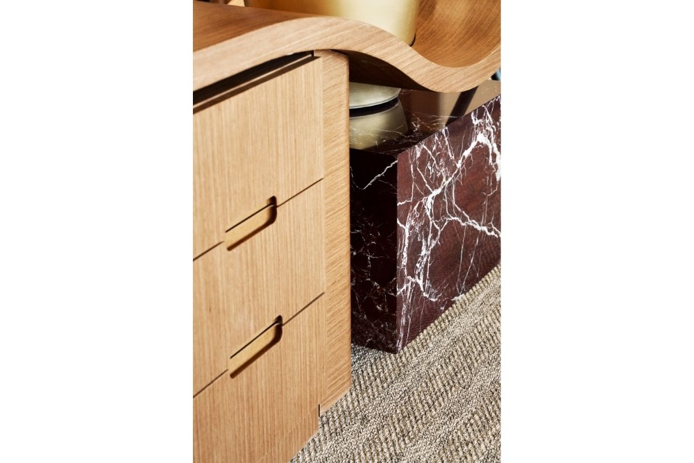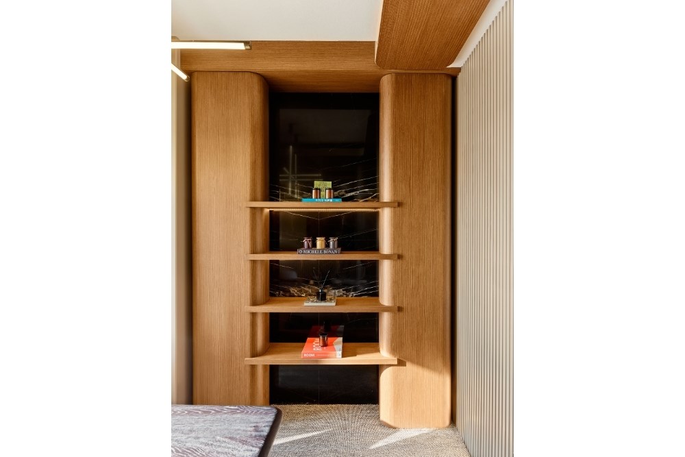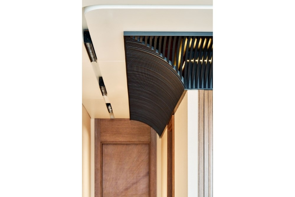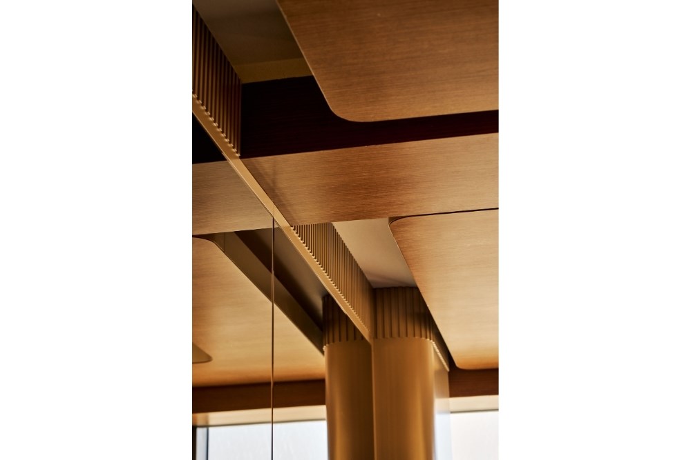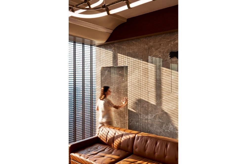 İç mimari kimlik, modernizmin net çizgileri ile amorf formların organik uyumu üzerine kuruludur. Mekânın akışkan ve ritmik dili, özellikle tavanlarda kurgulanan hacimsel ahşap panellerle vurgulanmıştır. Bu paneller, aydınlatma elemanlarını sergileyerek dinamik bir atmosfer yaratmıştır. Duvarlarda kullanılan mermer kaplamalar ise ahşabın sıcaklığına sofistike bir modernlik katmıştır.