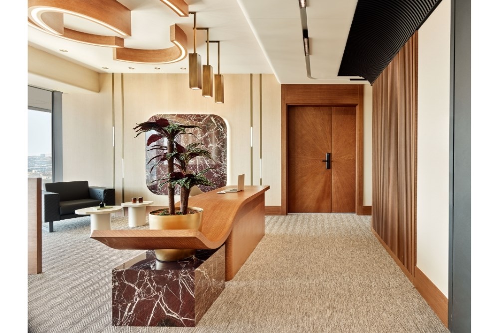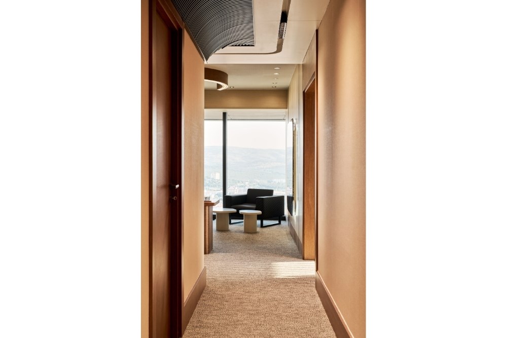 Bej, gri ve krem gibi nötr renk paleti, ferah ve zamansız bir kimliği desteklerken, zemindeki akustik halılar konforlu bir çalışma ortamı sağlamıştır. Lobideki mermer karşılama bankosu ve dokulu yüzeyler, ilk izlenimi güçlendirmiştir.