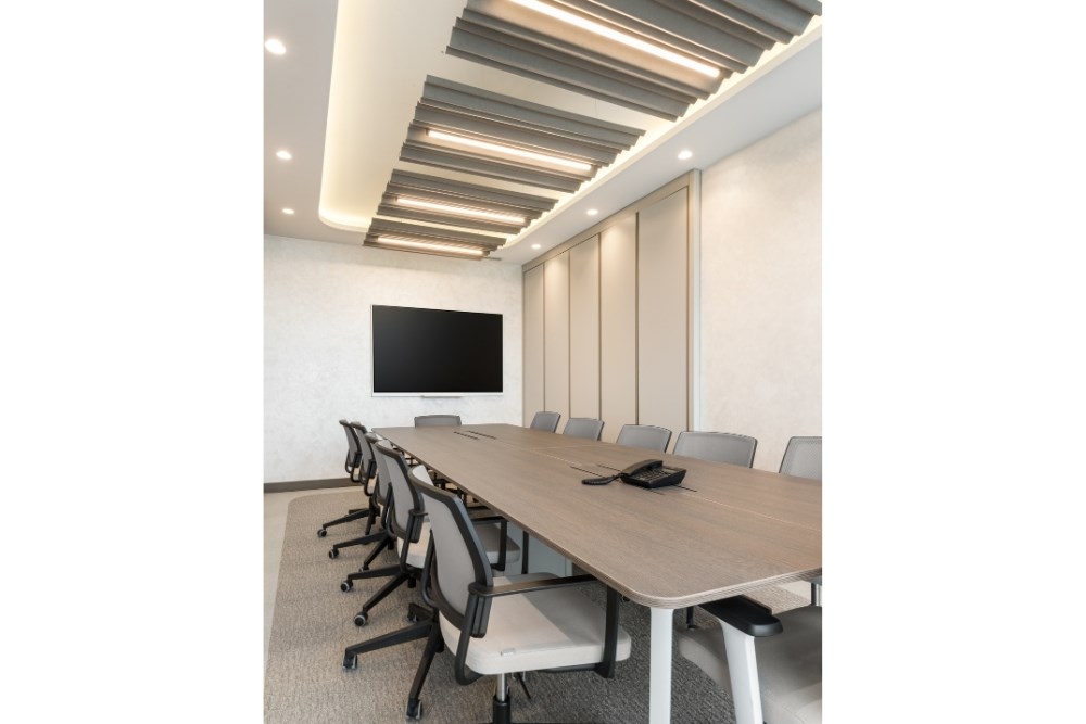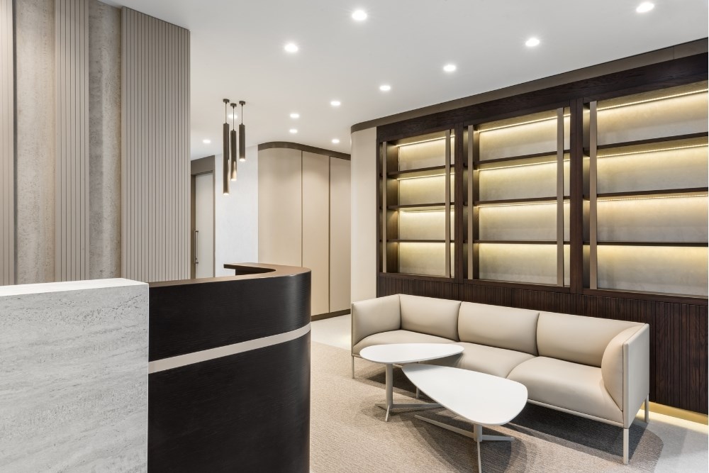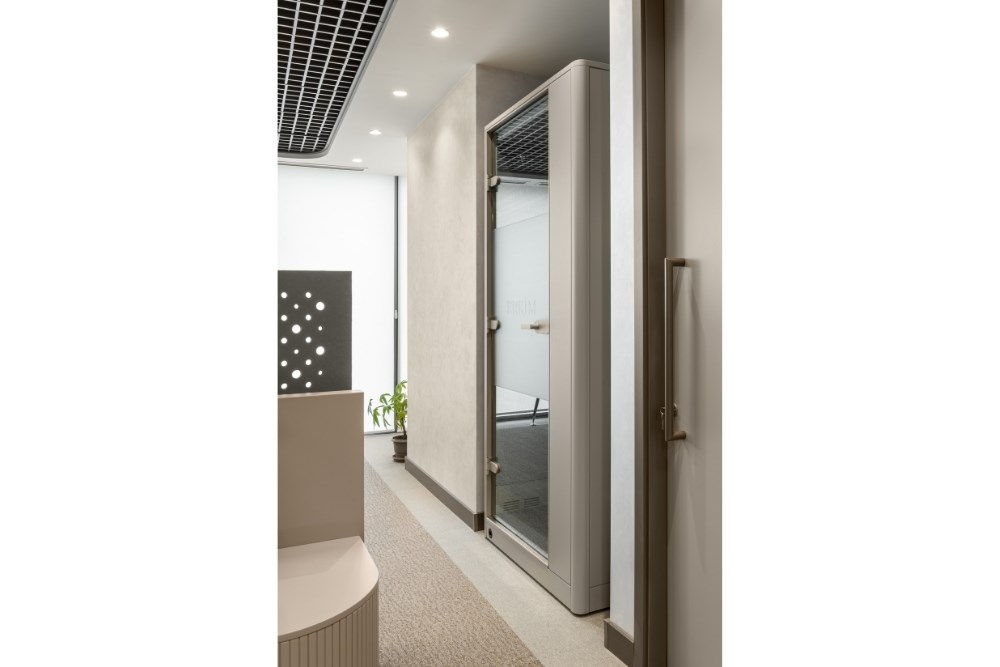 Tasarımda, çalışma konforunu önceliklendirmek amacıyla akustik ve aydınlatma çözümleri eş zamanlı olarak ele alınmıştır. Giriş bekleme alanına eklenen mat gold detaylar ile mekânın şıklığı vurgulanmıştır.