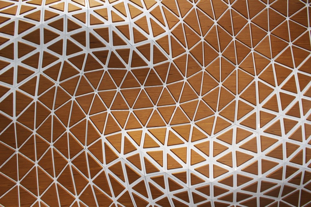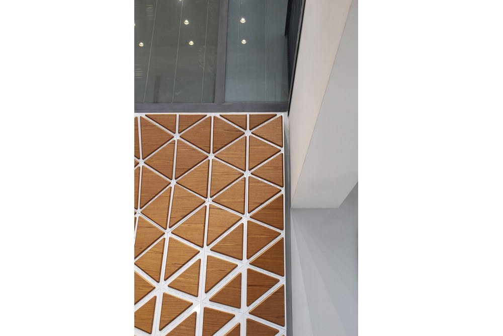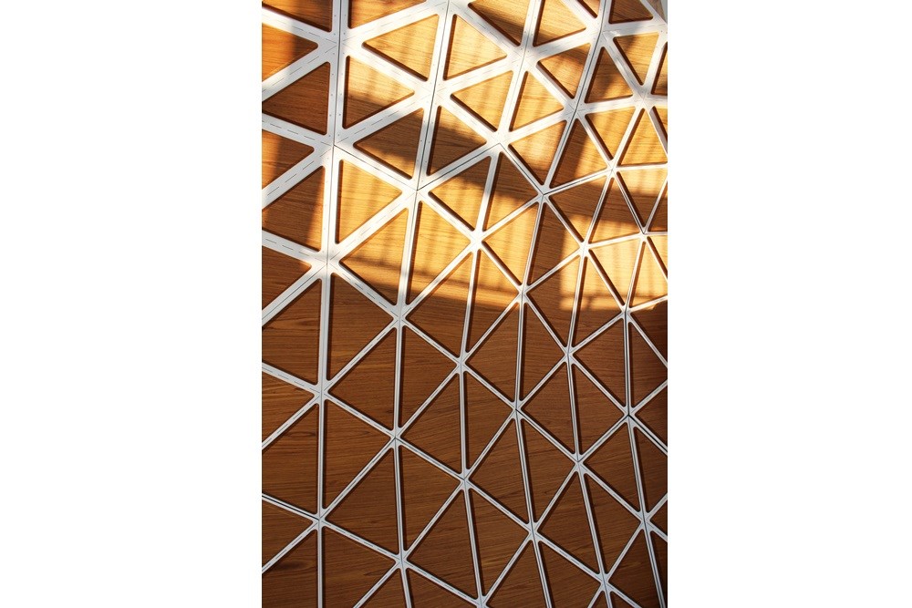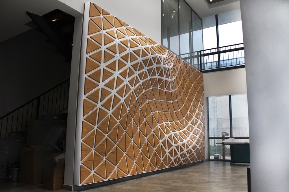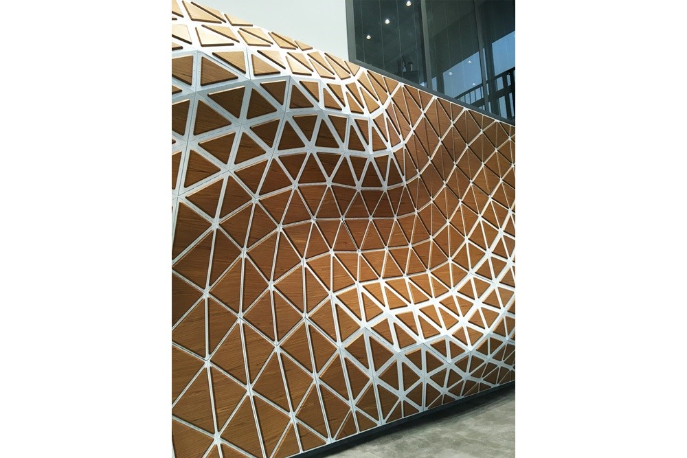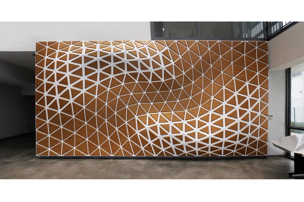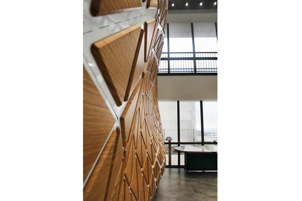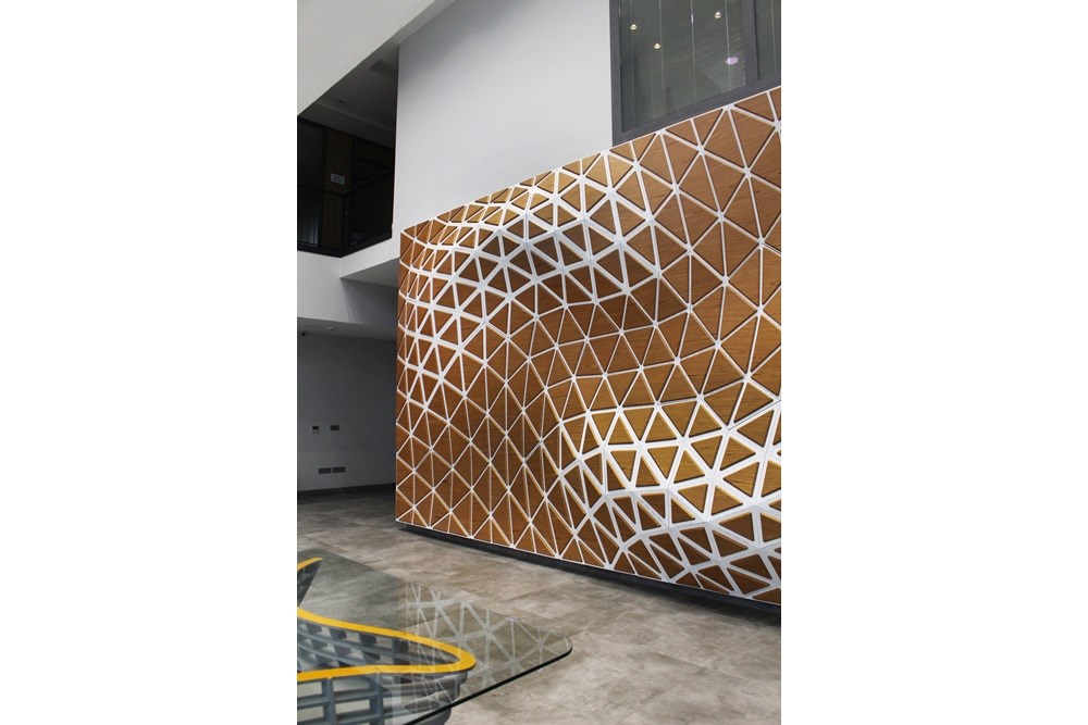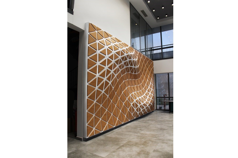 Göktoğan Teknik Makina Model firmasının fabrika idari binasında karşılama alanı olarak tasarlanan enstalasyon, Beyond doğal ahşap üçgen panelleme sistemine sahiptir.