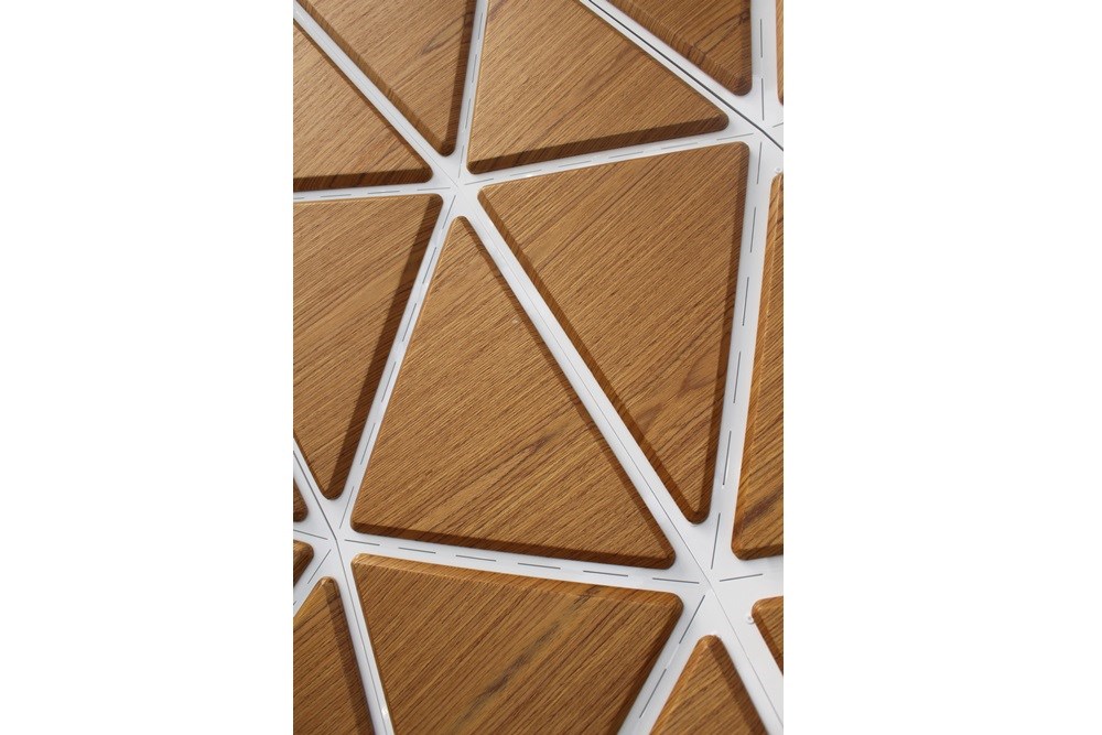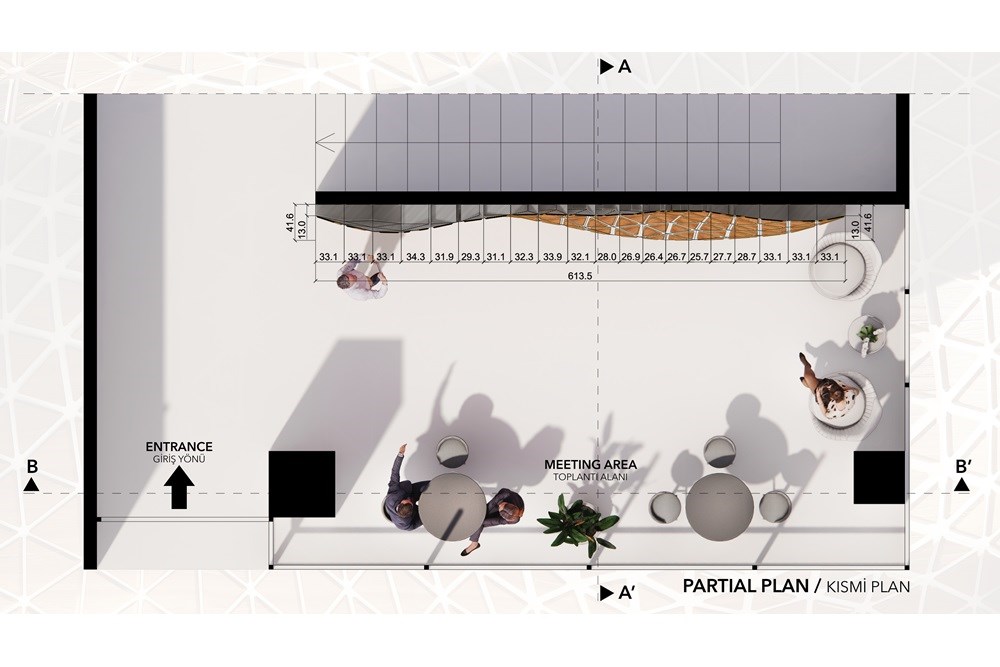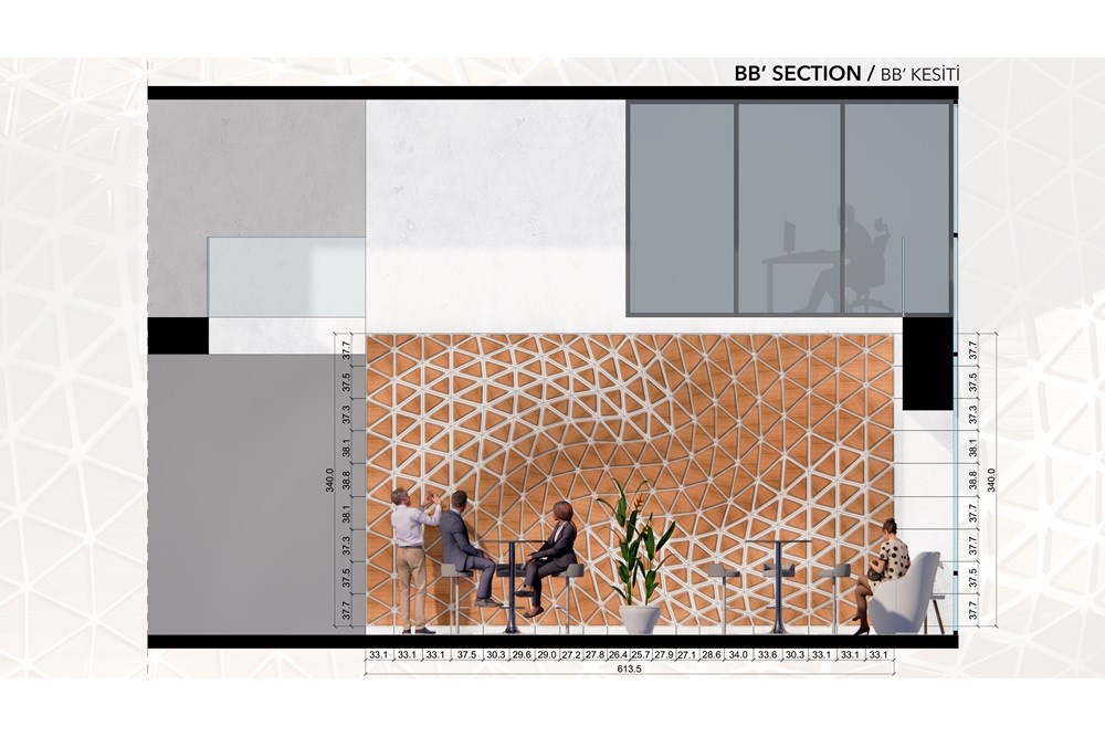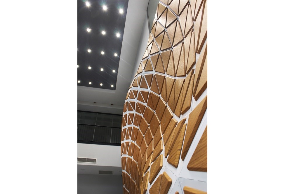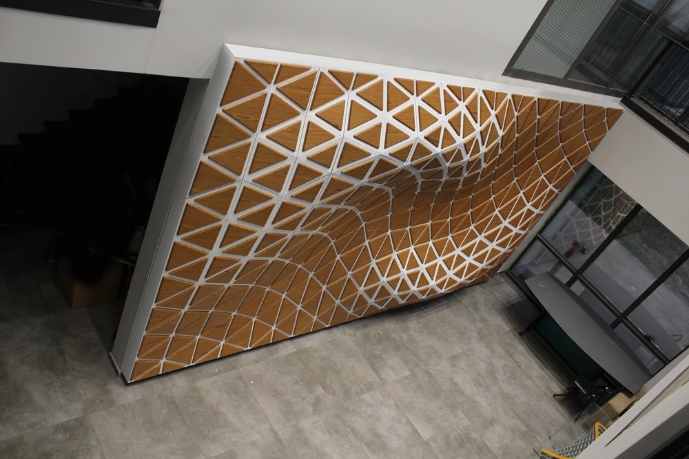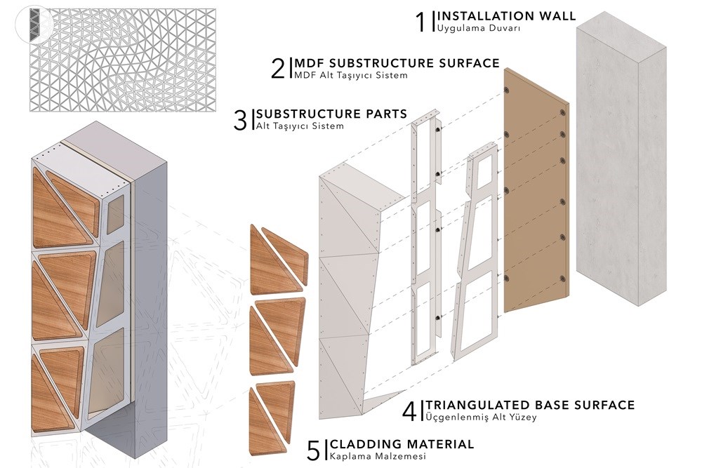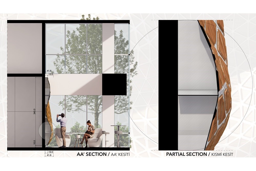 Tasarım 340 cm yüksekliğinde ve 615 cm genişliğindedir. Duvardan çıkma mesafesi 45 cm ölçüsüne kadar ulaşmaktadır. Parametrik olarak modellenmiş doğal ahşap kaplama üçgen paneller sayesinde yüzeyin 3 boyutlu olarak öne çıkma hissiyatı daha fazla vurgulanmak istenmiştir.
