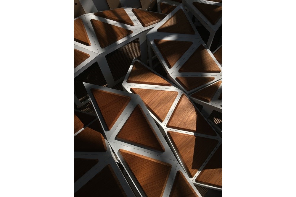 Toplamda birbirinden farklı 380 adet üçgen panelden oluşan çalışma, özelleştirilmiş alt konstrüksiyona sahiptir. Üçgen yüzey panelleri ve özelleştirilmiş alt konstrüksiyon Beyond’un kendi bünyesinde yer alan boyahanede 9003 RAL kodlu elektrostatik boya ile renklendirilmiştir.